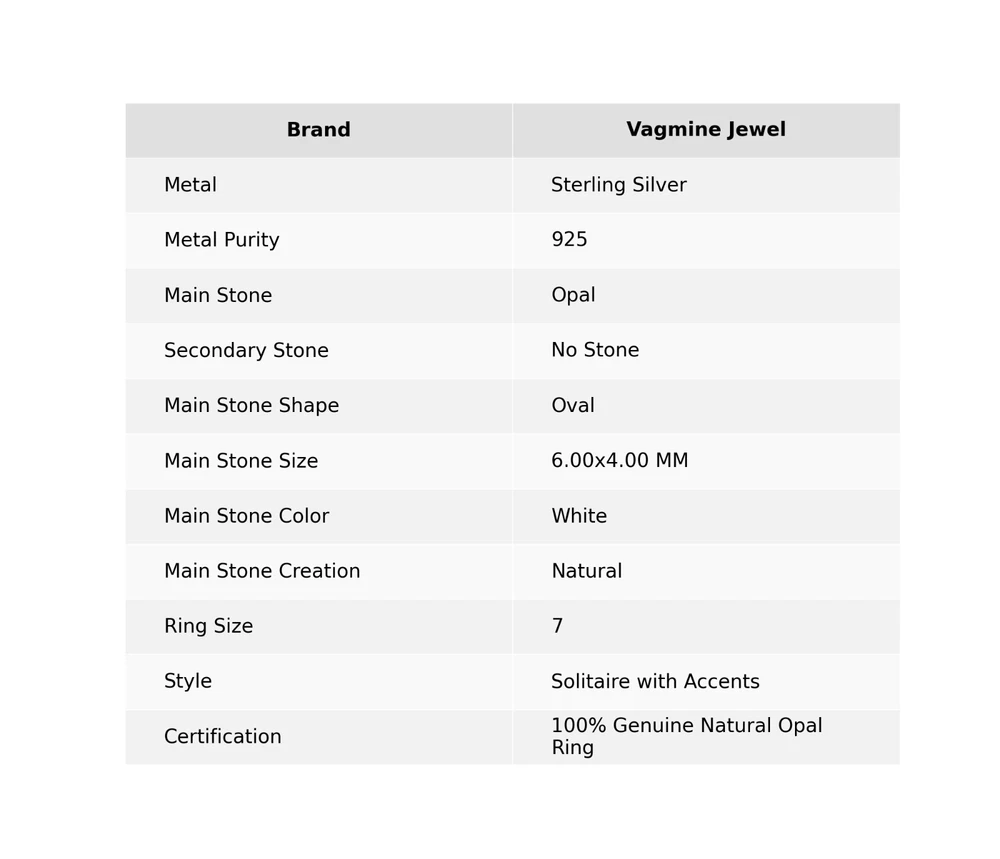 Personalization Instructions:All Ring Size Are Available Please Share Your Ring Size HereDiamond Color Grade:Not ApplicableType:RingBase Metal:SilverNumber of Gemstones:As Seen in PictureMain Stone Treatment:Not EnhancedSetting Style:ProngOccasion:Anniversary, Birthday, Engagement, WeddingDiamond Clarity Grade:Not ApplicableCut Grade:ExcellentCustomized:NoMetal:Sterling SilverEra:UndatedCountry of Origin:IndiaCountry/Region of Manufacture:IndiaMaterial:Crystal, Gemstone, Stone, MetalMain Stone Color:WhiteMetal Purity:925Ring Size:7Gemstone Clarity Grade:Eye CleanShape:As Seen As PictureSecondary Stone:No StoneVintage:NoSigned:YesMain Stone Shape:OvalBrand:Vagmine JewelColored Diamond Intensity:Not ApplicableSeller Warranty:YesPersonalize:YesBand Width:2 mmColor:SilverWholesale:YesMain Stone:OpalFeatures:Engraved, Nickel-Free, HandcraftedNumber of Diamonds:As Seen in PictureCertification:100% Genuine Natural Opal RingAntique:NoStyle:Solitaire with AccentsMain Stone Creation:NaturalSeller Notes:“Indian Handmade Best Quality 925 Sterling Silver Jewelry !!”Theme:Beauty, Bohemian, Ethnic, Healing, Love, Luck, Special Occasion, Halo, Love & Hearts