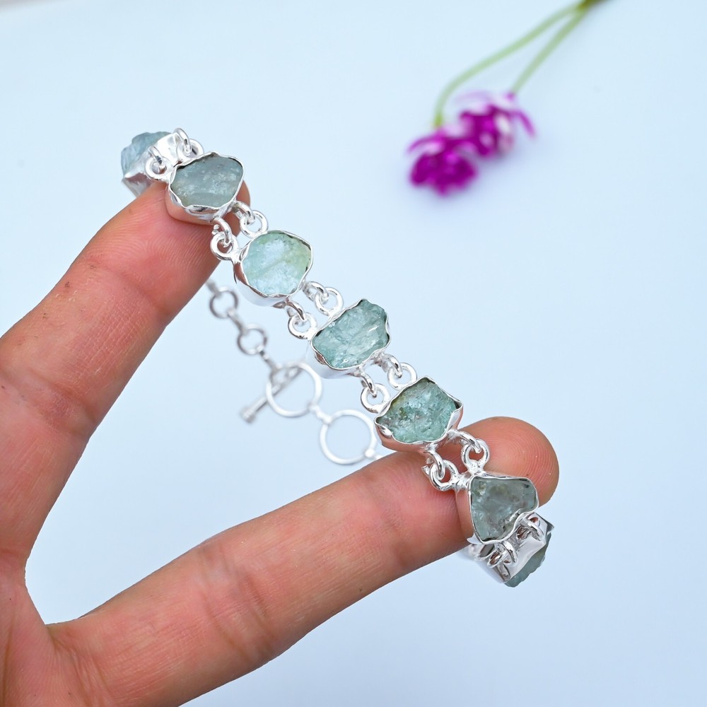 Natural Raw Aquamarine Bracelet in 925 Sterling Silver Jewelry Gift