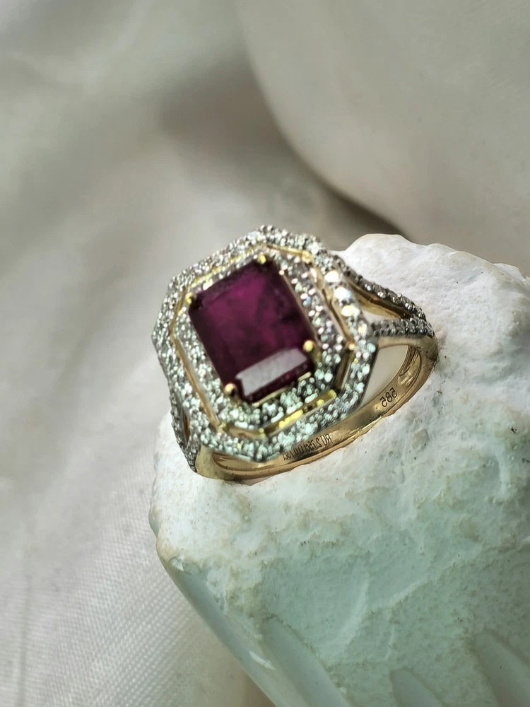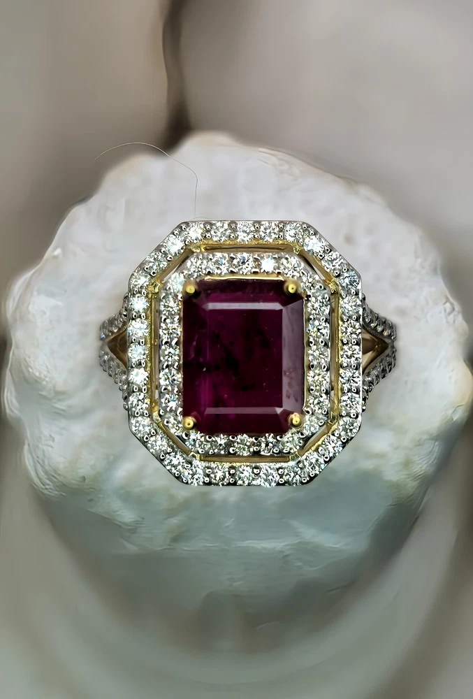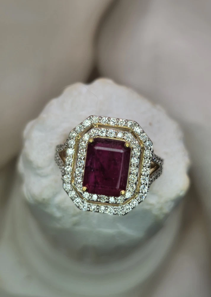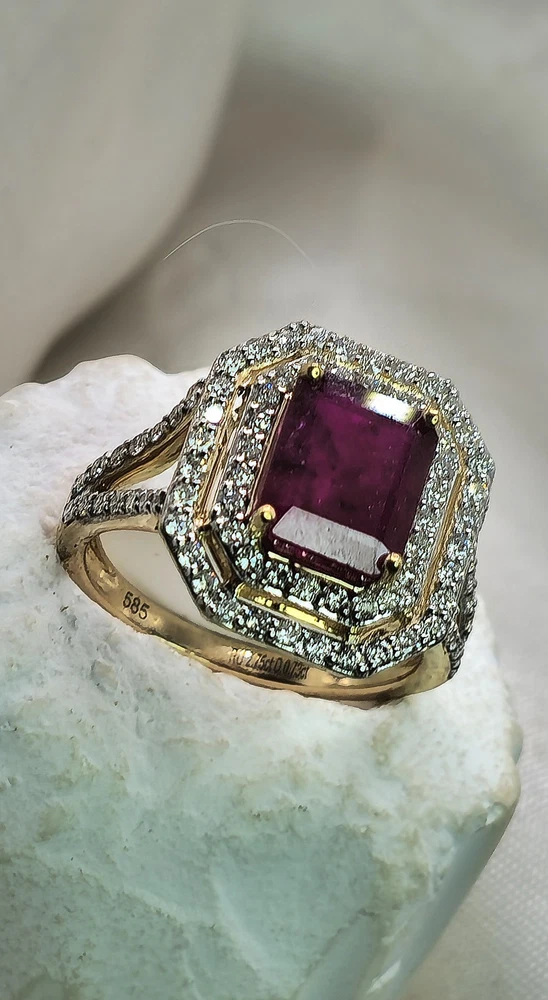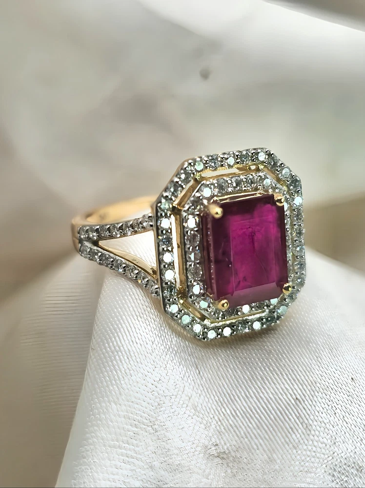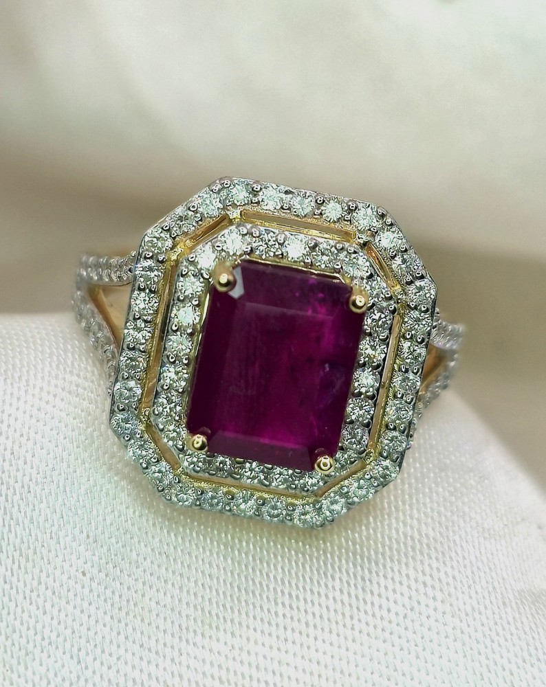 All pieces are directly from Manufacturing Wholesaler Brand New THE THE PHOENIX FIRE COLLECTION JULY BIRTHSTONE 40th ANNIVERSARY MOH SCALE: 9/10 DESCRIPTION Crafted in 14ct Yellow Gold and Featuring 1x Natural & Untreated Rich Red Ruby in an Emerald Cut & a Surrounded by a Gorgeous Fancy Double Halo of Natural White Diamonds in Round Brilliant Cuts. Weight: 5.00 grams Ring Size: M1/2 1x Natural & Untreated Ruby in an Emerald Cut Weighting a Total of 2.75ct White Round Brilliant Cut Diamonds Weighting a Total of .73cts Colour: G/H Clarity: Si - I1 A quick note on pricing: I source all my items through a much-loved local manufacturing wholesaler on consignment. To keep things fair for the maker, my discount power is limited. Please keep this in mind when making an offer—I’d love to find these pieces a home, but I need to honor the value set by my local supplier, thank you. ACCREDITATION Registered with the Nationally Recognised Governing Body of Australia to Ensure Industry Standards. All Valuers Are Nationally Registered Members of- - Australian Jewellery Valuers Guild - Jewellers Association of Australia (JAA) - Gemological Association of Australia Member (GAA) Independent Valuation Provided Retail Replacement Value $33,300.00 All Brand New Pieces Come With A 12 Month Manufacturing Warranty RUBY FACTS Rubies, known for their deep red color, are considered the stone of passion, vitality, and strength. Often referred to as the "king of gemstones," rubies are believed to enhance energy and provide protection against misfortune. They are thought to bring courage, boost confidence, and help in achieving one's goals. Like many gemstones, rubies are made under extreme heat and pressure below the earth. When compressed, oxygen and aluminum atoms turn into corundum. This mineral, along with the presence of chromium, creates rubies and their distinct hue. In Burma—a significant ruby source since at least 600 AD—warriors believed that rubies made them invincible. They even implanted rubies into their skin to grant protection in battle. Burmese rubies are still some of the most prized of all ruby gems.