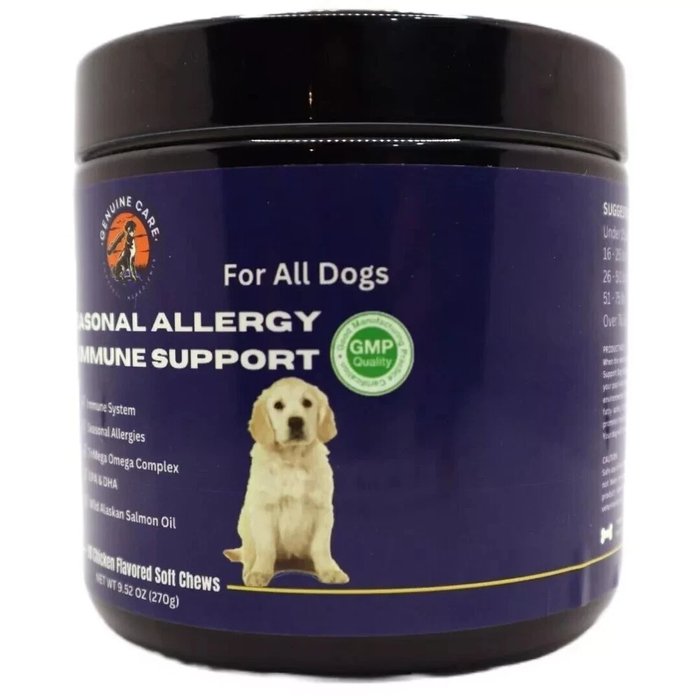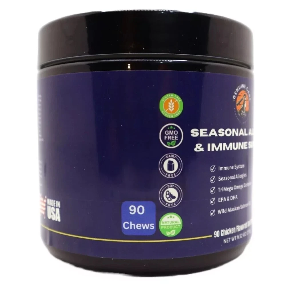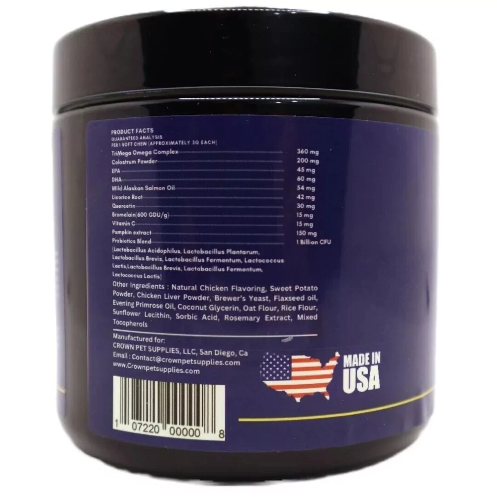 PRODUCT DESCRIPTION When the seasons change, be paw-pared with Crown Dermacare Seasonal Allergy & Immune Support Dog Supplement! These tasty soft chews are formulated to help support your pup’s allergies, atopy and other skin conditions caused by seasonal and other environmental factors. With premium natural ingredients, like omega-3, -6 and -9 fatty acids, vitamins, quercetin, and bovine colostrum, this supplement helps promote a healthy immune system and also helps maintain normal histamine levels. Your dog will love the way these chews taste and the way they make him feel! DIRECTION FOR USE Give recommended amount once daily. When starting, give 1/2 the recommended amount for the first 5-7 days to allow your pet to adjust to the soft chews. For use in dogs over 12 weeks of age. STORAGE Store in a cool, dry place. For best results, refrigerate after opening. SIZE 90 Soft Chews