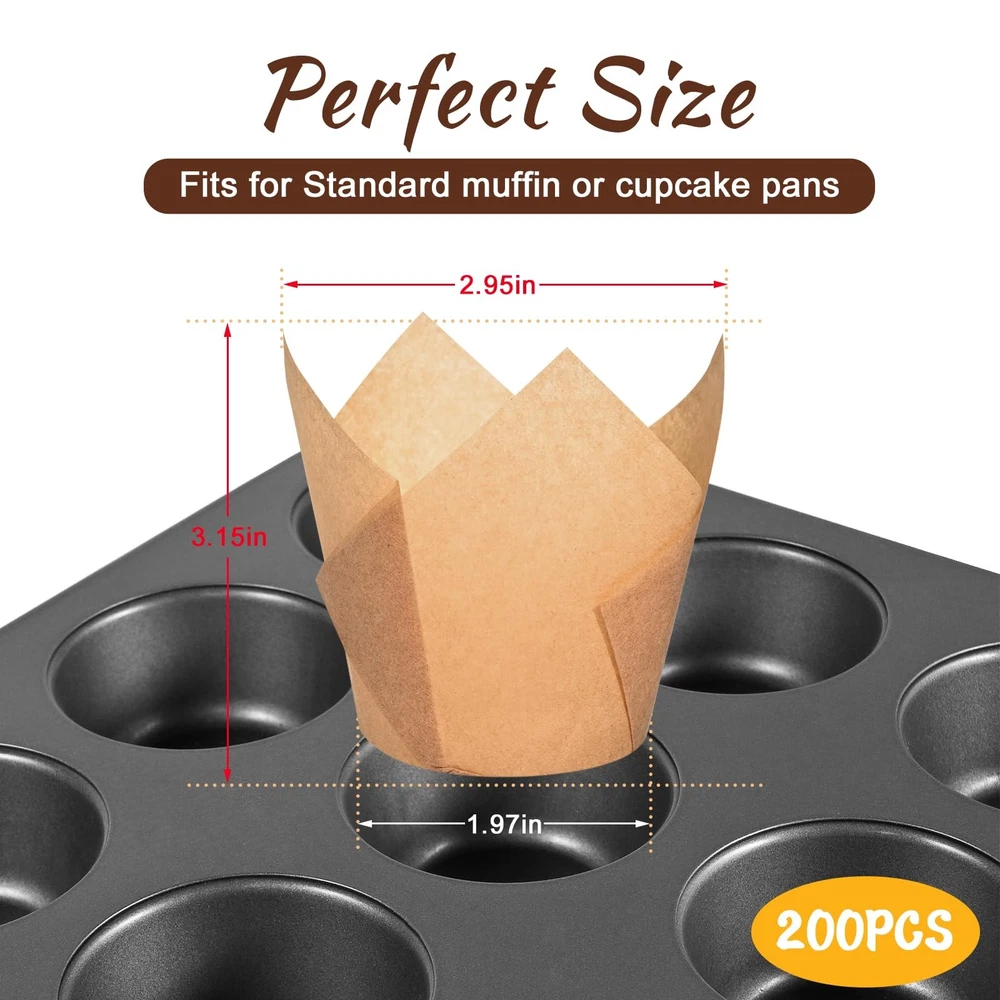 Natural Tulip Cupcake Liners for Baking 200 Cups Unbleached Parchment Paper BRING BEAUTY FOR YOUR BAKING: The shape of tulip cupcake liners looks more professional, elegant and beautiful than normal muffin liners, which can leave a deeper impression on your friends or guests and make food more delicious and attractive PERFECT STANDARD SIZE: 200pcs Natural Cupcake Wrappers have a bottom diameter of 1.97 inches, suitable for standard muffin or cupcake pans. The cups’ height is 2.2in at the low point and to 3.2in at the high point with capacity of 3 Oz making it the perfect choice for baking FOOD GRADED MUFFIN BAKING LINERS: Muffin Liners Made from natural 100% wood pulp and totally fluorescent free,They withstand temperatures up to 220°C/425°F, which is higher than most recipes require, so it can be put directly into the oven without worrying about safety EASY TO CLEAN & USE: Using baking cups, muffins and cupcakes will not stick to the pan, easy peel off at the moment of eating, The high feature of Tulip Cupcake Liners feature can hold more batter and also control unnecessary spill overs ENHANCE THE ATMOSPHERE OF VARIOUS OCCASIONS: These versatile baking cups are perfect for weddings, anniversaries, birthdays, Halloween, Christmas as well as other parties and events. these baking cups effortlessly elevate your cupcakes, giving them a professional and polished appearance Tulip cupcake liners are the perfect addition to your baking supplies, adding a touch of elegance and style to your cupcakes and muffins. These high-quality liners are designed to prevent sticking and make it easy to remove your baked goods without damaging them. With a variety of vibrant colors and patterns to choose from, you can find the perfect liners to complement your creations. Whether you're baking for a special occasion or just for fun, these tulip cupcake liners will elevate the presentation of your treats. Made from durable materials, they are reusable and easy to clean, making them an eco-friendly choice for your kitchen. Shipping We offer FREE shipping on all orders! We ship within Three business days of payment, usually sooner. We use a selection of shipping services such as UPS, FedEx, USPS etc. We only ship to the lower 48 states, no APO/FPO addresses or PO Boxes allowed. Local pickups and combined shipping options are not provided at this time. Return You can return a product for up to 30 days from the date you purchased it. Any product you return must be in the same condition you received it and in the original packaging. Please keep the receipt. Payment We accept payment by any of the following methods: PayPal Please pay as soon as possible after winning an auction, as that will allow us to post your item to you sooner! Feedback Customer satisfaction is very important to us. If you have any problem with your order, please contact us and we will do our best to make you satisfied. Contact Us If you have any queries, please contact us via ebay. We usually respond within 24 hours on weekdays. Please visit our eBay store to check out other items for sale! Thank you for shopping at our store.