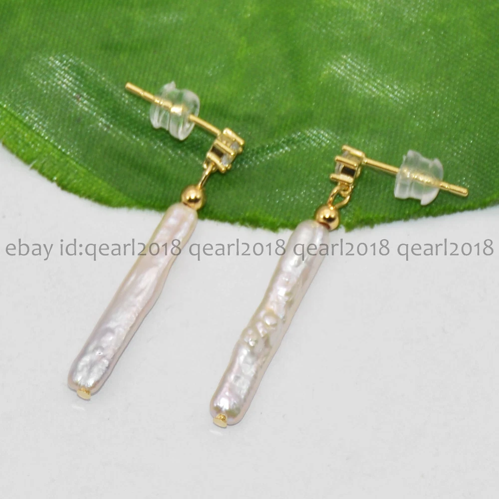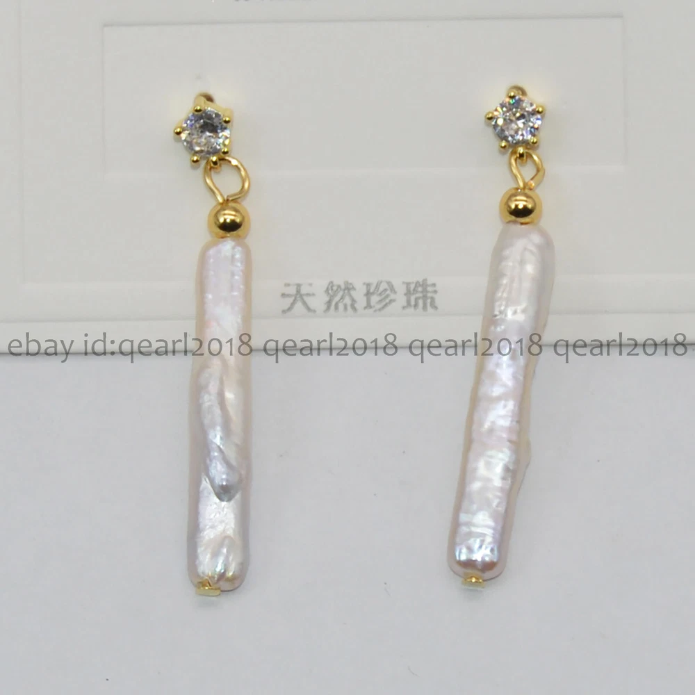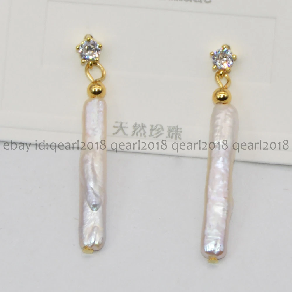 Natural White Baroque Freshwater Pearl Dangle Stud Earrings 5x25mm