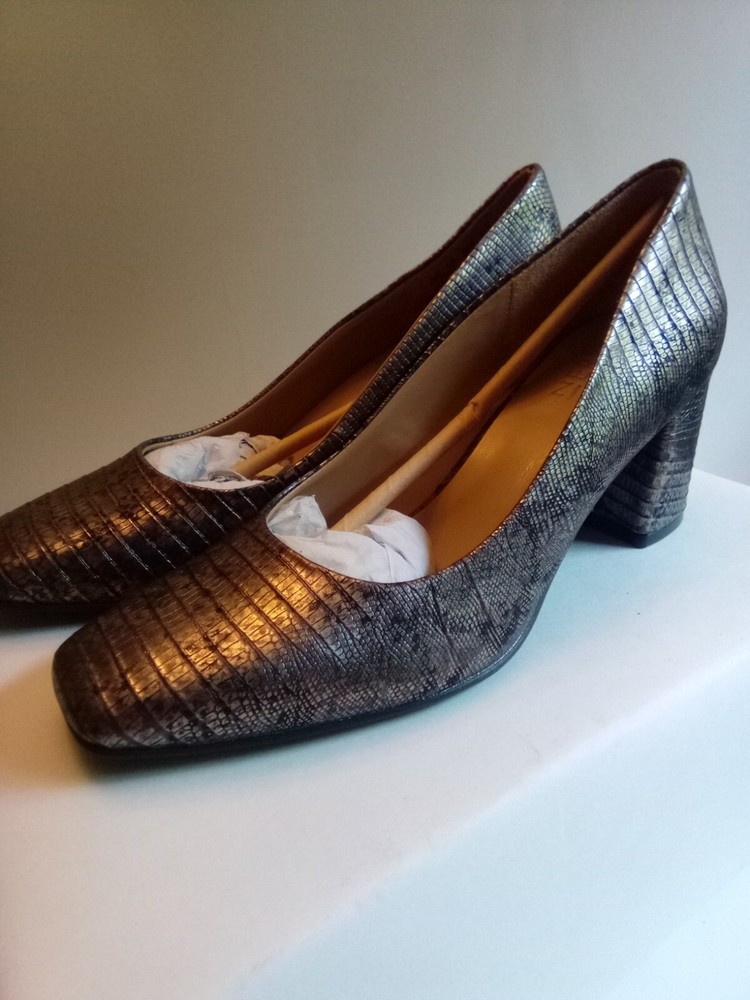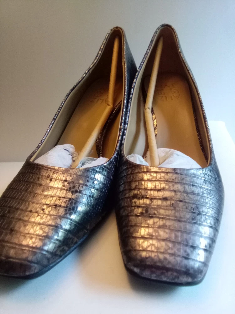Elevate your style with these chic Naturalizer Warner heels. The sleek pewter silver color adds a touch of elegance to any outfit. With a comfortable block heel and slip on design, these D'Orsay style heels are perfect for a night out or a day at the office. Featuring a square toe shape and croc pattern, these heels are sure to turn heads. Available in US shoe size 7.5 and EU shoe size 37.5, they are made with man-made upper material and crafted in Vietnam. Don't miss out on adding these stunning heels to your collection.