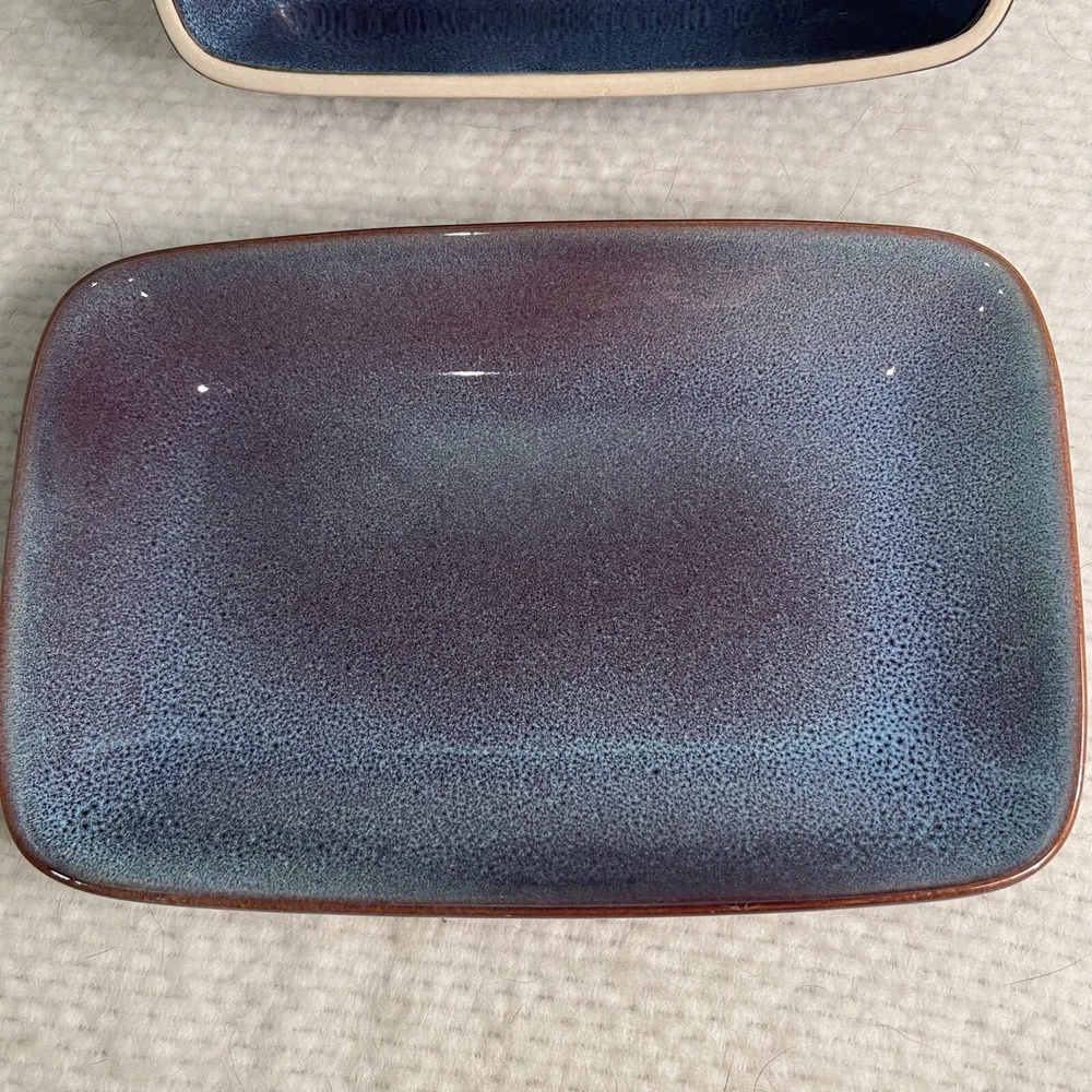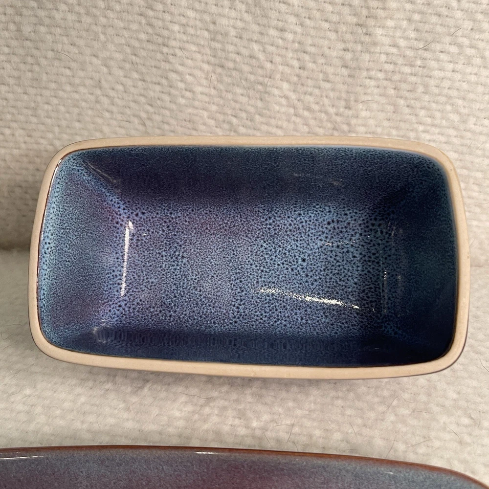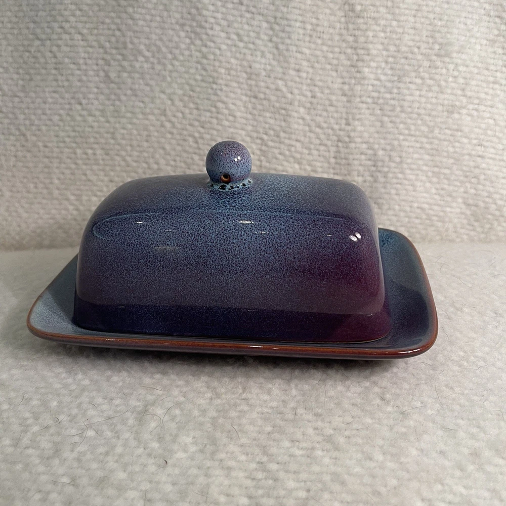 Add a touch of elegance to your dinner table with this beautiful two-piece butter dish set from Nature Elements. The rectangular stoneware dish comes with a matching lid, both in a stunning purple-blue color. This vintage art deco style piece is perfect for any occasion and is sure to impress your guests. Crafted using pottery production techniques, this butter dish set is both durable and stylish. The set includes one butter dish with lid, measuring 7.25” in length, 4.5” in width, and 3.75” in height. The backstamp is printed and the item weighs 1.9 lbs. Ideal for any nature or stoneware collection, this set is a must-have for any pottery enthusiast. Excellent condition. No chips or cracks.