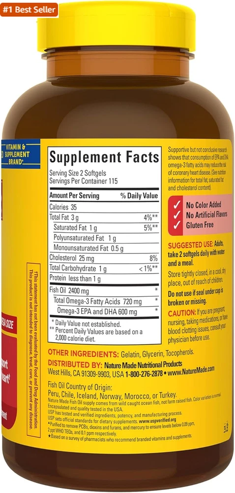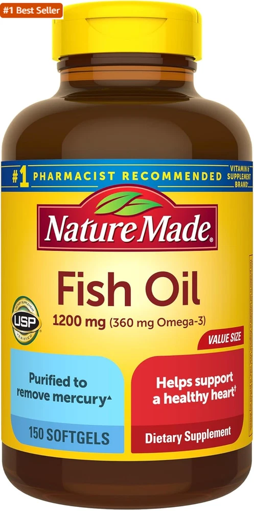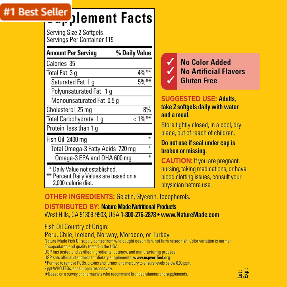 Nature Made Fish Oil Omega 3 Supplements, 1200 Mg Softgels, Omega 3 Fish Oil for Healthy Heart Support, 230 Softgels, 115 Day Supply Heart health support supplement: contains one 230 count bottle of Nature Made Fish Oil 1200 mg Softgels for a 115-day supply This Nature Made Omega 3 Fish Oil supplement is purified to remove mercury and other contaminants (2) One serving of two fish oil softgels provides 720 mg Omega-3 fatty acids (600 mg EPA and DHA) to help support a healthy heart Adults, take two of these Fish Oil Omega 3 EPA DHA supplement softgels daily with water and a meal This gluten free and dairy free Omega 3 Fish Oil for women and men supplement has no color added and no artificial flavors #1 Pharmacist Recommended Vitamin and Supplement Brand* These statements have not been evaluated by the Food and Drug Administration; this product is not intended to diagnose, treat, cure, or prevent any disease Nature Made Fish Oil 1200 mg is a dietary supplement that provides 360 mg Omega-3 fatty acids per softgel to help support a healthy heart. A serving of two Nature Made Omega 3 Fish Oil 1200 mg softgels provides 2400 mg Fish Oil with 720 mg Omega 3s (600 mg EPA and DHA). These gluten free Nature Made Fish Oil 1200 mg 360 mg Omega-3 supplements have no color added and no artificial flavors. These Fish Oil supplements are purified to remove mercury (2) from wild-caught ocean fish, not farm-raised fish. Adults, take two of these Omega 3 Fish Oil softgels daily with water and a meal. An Omega 3 supplement like fish oil Nature Made can help provide Omega 3 Fish Oil for men and women. Nature Made DHA EPA Omega 3 supplements are quality you can trust. (2)Purified to remove PCBs, dioxins and furans, and mercury to ensure levels below 0.09 ppm, 2 ppt WHO TEQs, and 0.1 ppm respectively. *Based on a survey of pharmacists who recommend branded vitamins and supplements. These statements have not been evaluated by the Food and Drug Administration. This product is not intended to diagnose, treat, cure or prevent any disease. Item model number 4295 Unit Count 230 Count Primary Supplement Type Vitamin Age Range (Description) Adult Is Discontinued By Manufacturer No Product Dimensions 3.5 x 3.5 x 6.63 inches; 15.2 ounces Item dimensions L x W x H 3.5 x 3.5 x 6.63 inches Product Benefits Dietary Supplement,Heart Health Support Item Weight 0.95 Pounds Flavor Name Unflavored Diet Type Gluten Free Flavor Unflavored Manufacturer Pharmavite LLC Item Form Softgel Brand Nature Made Size 230 Count (Pack of 1) Shipping Fast shipping is very important for us. Our standard US shipping service is FREE. Your order will be shipped within 2-3 business days upon full payment received. Your order will be delivered within 2-3 business days after the handling time. We only ship to the confirmed PayPal address. We reserve the right to cancel any order for any reason at any time. We are not responsible for undeliverable addresses. Returns and payment We offer a 30 days return policy from checkout winning date. We allow only PayPal as payment method FeedBack Your feedback very important to us, after you get your package and you are satisfied with our service please leave us positive feedback If you have any problem with your order / any questions please before leave any type of feedback For any questions, using eBay contact system Please visit our eBay store to check out other items for sale! Thank you for shopping at our store.
