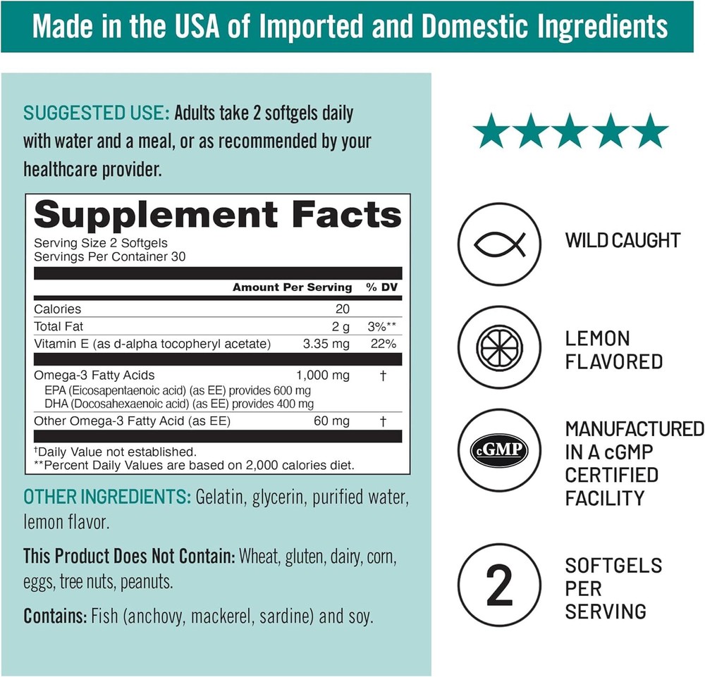 Free eBay listing template designed by dewiso.com NatureWise Extra-Strength Omega 3 Fish Oil Supplement - 1000mg per Serving - 600 EPA & 400 DHA and Vitamin E - Support for Heart & Brain Health - Lemon Flavor, GMO-Free - 60 Softgels[1-Month Supply] FREE AND FAST SHIPPING! About this item EXTRA STRENGTH OMEGA-3 + VITAMIN E: Omega 3 is an essential fatty acid, while vitamin E is a fat-soluble vitamin that is protective of omega 3 fatty acids. We combined omega 3 fish oil with vitamin E so that these synergistic compounds can support overall heart, brain, joint, and eye health.* PURIFIED OF HEAVY METALS: We distill our high-quality fish oil from heavy metals such as mercury, leaving behind only beneficial components of the fish oil. WILD-CAUGHT, SUSTAINABLY SOURCED FISH: Our omega-3 fish oil comes from wild-caught fish and has been certified as a sustainable source of fish oil. NO FISHY BURPS OR SMELLS: Unlike other brands, NatureWise Omega-3 softgels deliver omega-3 fish oil without the fishy smells or fishy burps that other fish oil supplements have. GLUTEN-FREE, GMO-FREE: NatureWise Omega 3 softgels are gluten-free and GMO-free. These softgels do not contain wheat, gluten, eggs, dairy, peanuts, tree nuts, and corn. This product contains fish (anchovy, mackerel, sardine) and soy. PREMIUM INGREDIENTS: NatureWise Omega 3 softgels are manufactured in the USA with high-quality ingredients from around the world in a cGMP-certified facility with third-party quality control audits. Product We offer a 30-Day Return Policy on items which you are not completely satisfied with. You have the option for a full-refund or an exchange of the item. No returns are available on items shipped outside of the US . Shipping We offer Free Shipping to the US and ship within 2 business days of payment, usually sooner. We use UPS express shipping. That's why your products are usually delivered within 3 days . Contact We try our very best to make sure every customer is completely satisfied. If there's a problem , message us! We're happy to help. 24/7 live chat available.