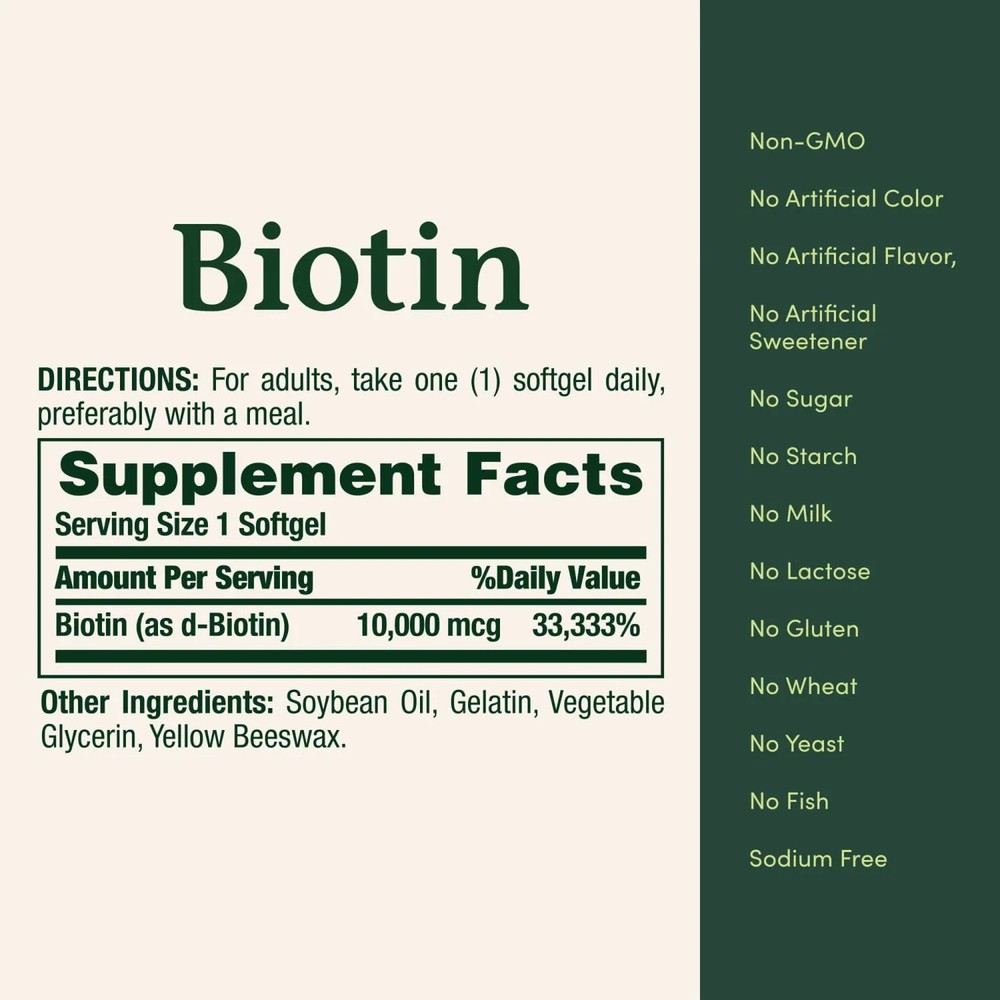 SUPPORTS HEALTHY HAIR: Biotin helps maintain healthy hair; providing essential nutrients crucial for beautiful hair SKIN AND NAIL HEALTH SUPPORT: These Biotin soft gels are designed to support hair, skin and nail health NERVOUS SYSTEM SUPPORT: Biotin supplement; a member of the B Vitamins family; supports a healthy nervous system ENERGY METABOLISM BENEFIT: Biotin 10000mcg aids in converting nutrients into cellular energy; supporting the body's energy metabolism QUALITY YOU CAN TRUST: Backed by 50 years of scientific research; these Nature's Bounty biotin vitamins offer a reliable choice for your health and beauty