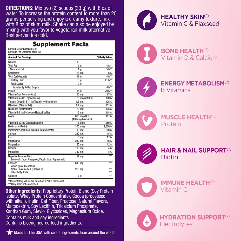 Nature’s Bounty Complete Protein & Shake Mix is a delicious way to drink the nutrients you need most. Each serving contains protein, fiber, collagen, biotin, antioxidant vitamins C & E, calcium, D, electrolytes, probiotics, and more—to support a wide range of factors including muscular, digestive, immune, bone, hair, skin, and nail .(2) Enjoy mouthwatering Vanilla Bean and Decadent Chocolate flavors pre- or post-workout, as a nutritious snack between meals, or any time of day you crave a tasty boost packed with protein and vitamins. This shake mix makes it easy to feel beautiful and support your wellness from the inside out.(2) For nearly 50 years, Nature’s Bounty has been making trusted products backed by science and made with only the purest ingredients assured. So you can get the most out of life every day. Our dedication to quality, consistency, and scientific research has resulted in vitamins and supplements of unrivaled excellence. A BLEND OF 12 plus VITAMINS AND MINERALS SUPPORT OVERALL . From the makers of the brand for hair, skin, and nails,(1) Nature's Bounty Complete Protein and Shake Mix is formulated to enhance your beauty routine with the purest ingredients 15g PROTEIN PER SERVING TO SUPPORT MUSCLE .(2) Featuring a blend of high-quality complete proteins containing all nine essential amino acids; includes a blend of soy protein isolate and whey protein concentrate, both complete proteins WELL-ROUNDED NUTRITION TO SUPPORT A HEALTHY LIFESTYLE. Along with diet and exercise, Nature's Bounty Complete Protein and Shake Mix can help you achieve your nutritional goals with protein, fiber, collagen, biotin, antioxidant vitamins C and E, calcium, D, electrolytes, probiotics, and more COLLAGEN and FIBER. This complete protein and shake mix is formulated to deliver a blend of essential nutrients to help you look and feel your best DELICIOUS CHOCOLATE FLAVOR. Enjoy decadent chocolate shakes to start your day or between meals; this mix is laboratory-tested and contains no artificial flavor, wheat, , or fish