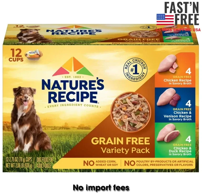 Nature’s Recipe Grain Free Wet Dog Food Variety Pack, 2.75 oz. Cup, 12 Count US Warehouse - FREE & FAST Shipping SALE!!! DESCRIPTION: Make every meal a wag-worthy experience with Nature’s Recipe grain free dog food recipes. This wet dog food variety pack includes three delicious recipes made with real chicken as the number one ingredient: Grain Free Chicken & Duck Recipe in Savory Broth, Grain Free Chicken Recipe in Savory Broth and Grain Free Chicken & Venison Recipe in Savory Broth. These natural dog food recipes are made with added vitamins, minerals and nutrients to help support all your dog’s needs. And because we believe that every ingredient counts, you’ll find no added corn, wheat or soy, no poultry by-product, and no artificial flavors or preservatives in any of these purposefully crafted recipes. So, peel back the lid and fuel the wag with tasty meals that provide all your dog needs, and nothing they don’t. Contains twelve (12) 2.75-ounce cups of Nature’s Recipe grain free dog food Four (4) Grain Free Chicken Recipe in Savory Broth, four (4) Grain Free Chicken & Venison Recipe in Savory Broth and four (4) Grain Free Chicken & Duck Recipe in Savory Broth Real chicken is the number one ingredient in each recipe No added corn, wheat or soy, no poultry by-products, and no artificial flavors or preservatives Delicious, premium nutrition that’s honestly made and reasonably priced Animal health concern Digestive Care Pet food flavor Chicken, Venison, Duck Product line Grain Free Animal lifestage All Lifestages Pet food condition Wet Count per pack 12 Meat type Chicken Brand Nature's Recipe Pet food form Broth Weight 33 oz Net content statement 12 - 2.75 OZ (78g) CUPS NET WT 33 OZ (2 LB 1 OZ) (936g) Shelf life 535 days SHIPPING: It takes about 3- 6 business days for delivery for USA order , Business days exclude weekends and holidays We do not ship to warehouse addresses RETURN & EXCHANGE: We stand behind the quality of our products and guarantee our workmanship 100%. Any defects or errors on our part will result in a replacement at no charge. We typically do not accept returns due to user error such as incorrect selection of sizes, designs, colors, etc. We just can accept return for damage or bad printing result, wrong size and design from us Therefore, if there are any issues about the item, please do not leave negative/neutral feedback, please contact us and give us an opportunity to resolve the problem first Before opening a return case on eBay, please contact us with the reason for return and send us proof like the picture, it will be easier for us to handle your problem. If you were pleased with this transaction, it is really appreciated to give us positive feedback, thanks! CONTACT US: If you have any question, feel free to contact us. We endeavor to respond within 24 hours. If you are not satisfied, please contact us immediately. We will do our best to resolve your concern FEEDBACK: If you are happy with your purchase, PLEASE take a moment to leave Positive feedback for us. We really appreciate that. If you are not happy with the purchase, PLEASE contact us to resolve the problem. We are always here to give you the best solutions. THANK YOU SO MUCH GOD BLESS YOU AND FAMILY!!!