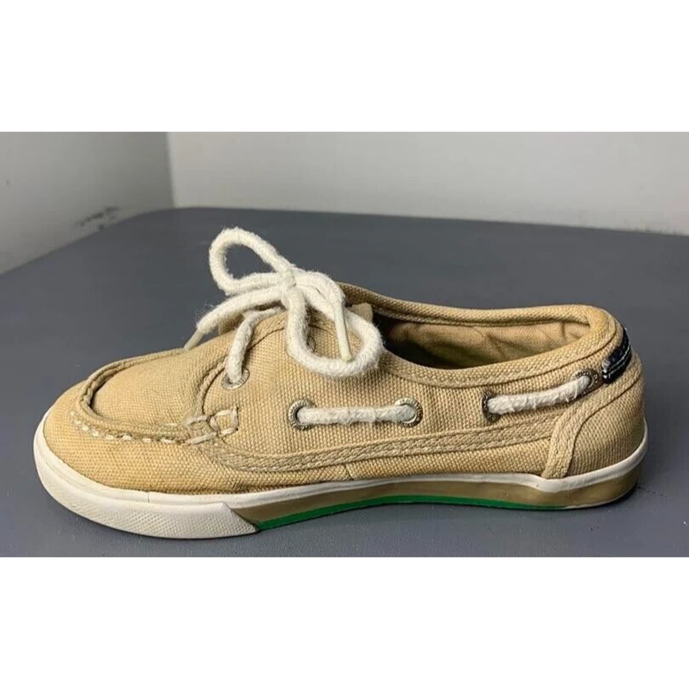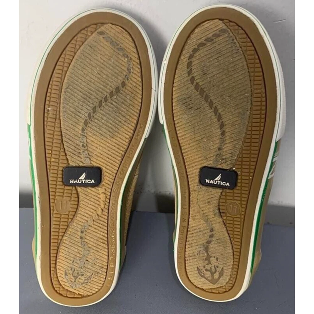 These Nautica boat shoes offer a classic design with durable canvas material and a comfortable fit. Ideal for casual outings, these lace-up shoes are designed to provide both style and functionality for young adventurers. • Lace-up closure • Canvas upper material • Rubber outsole • Nautica branding • Cushioned insole Visible signs of wear on the canvas and slight scuffing on the soles.