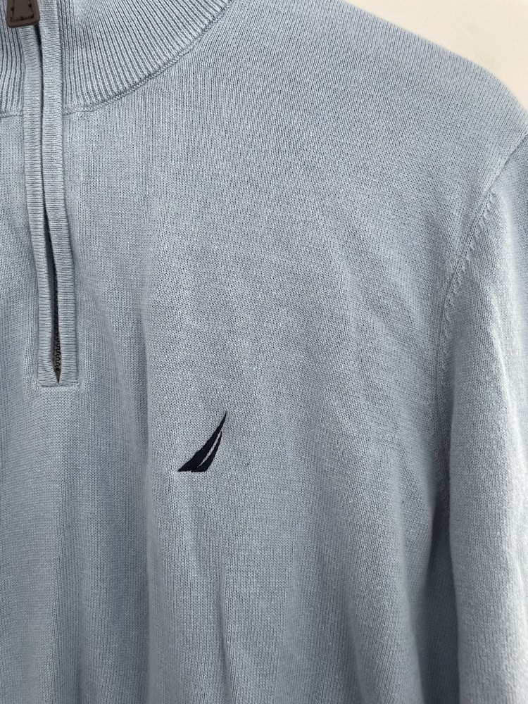 Nautica Men's Solid Blue Logo 100% Cotton 1/4 Zip Mock Neck Pullover Sweater L. Condition is pre-owned. Smoke free, pet free home. Shipped via USPS Ground Advantage. In good condition. Free of rips or stains.
