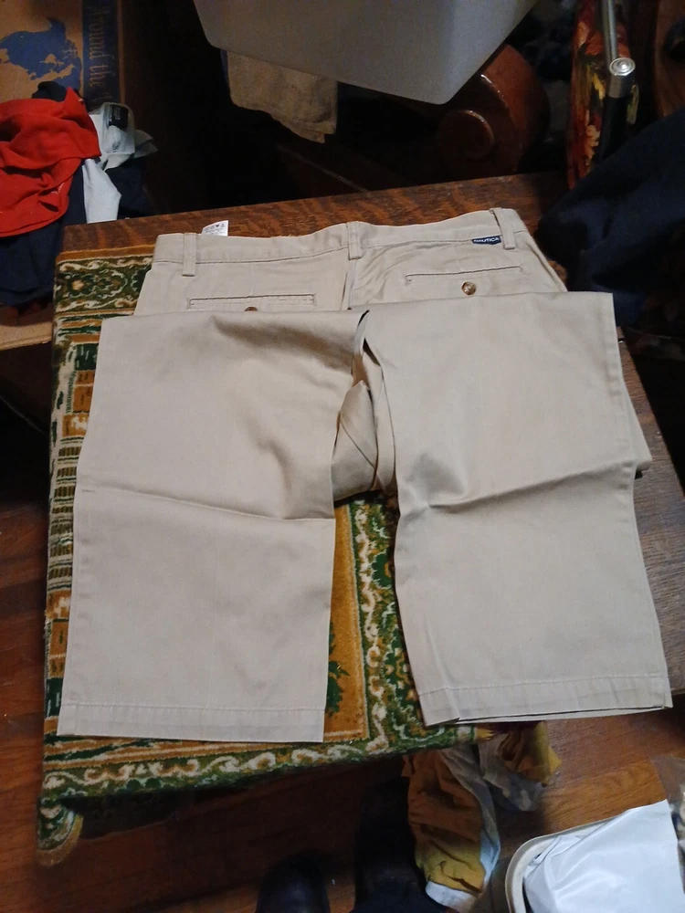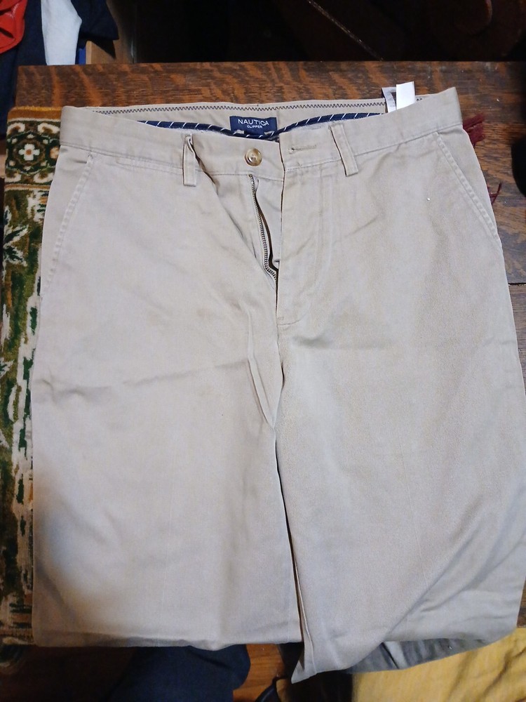 Color: Beige Style: Khaki 100% Cotton Pocket Adult Gift Casual Walking Outdoor Size Type: Regular Front Type: Flat Front Handmade: No Product Line: Nautica Clipper Relaxed Fit Garment Care: Machine Washable Waist Size: 32 in Rise: NA Material: 100% Cotton Occasion: Casual Brand: Nautica Vintage: No Pattern: Solid Fabric Type: Twill Season: Fall, Spring, Summer Size: 32 Country of Origin: Hong Kong Theme: Preppy Department: Men Pocket Type: Slash Pocket Inseam: 30 in Accents: Button, Zipper Fit: Regular Model: Nautica Clipper Relaxed Fit Features: Comfort, Easy Care, Pockets Type: Pants Leg Style: Straight Closure: Button Personalize: No