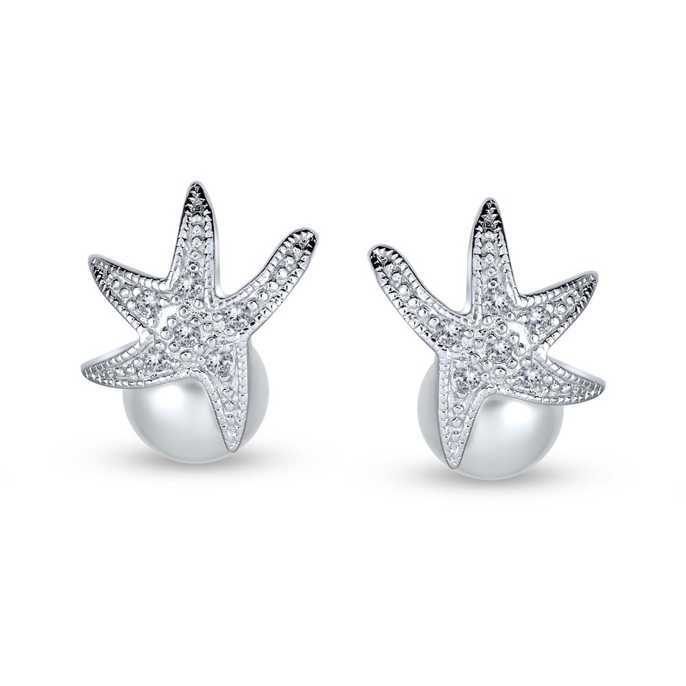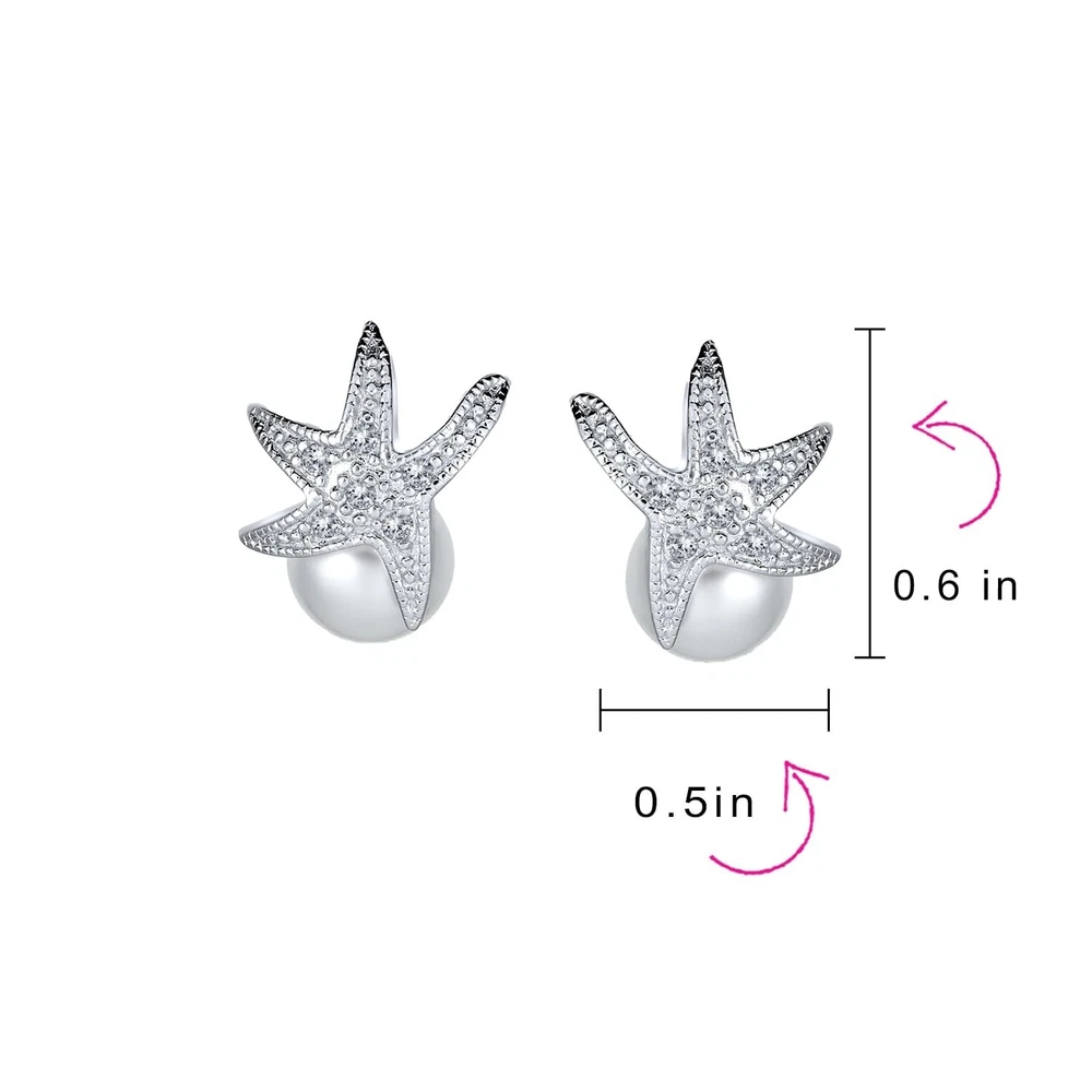 Nautical Bride CZ Beach Destination Wedding White Simulated Pearl 8MM Jewelry Set Starfish Necklace Lariat Pendant Stud Earring For Women Bridesmaids .925 Sterling Silver Product Details Style: Jewelry Set Brand: Bling Jewelry MPN: 925-d1711am-SETR UPC: 643906618216 EAN: 0643906618216 Is Discontinued By Manufacturer : No Product Dimensions : 16 x 0.5 x 16 inches; 0.32 ounces Item model number : 925-d1711am-SETR Department : womens Date First Available : July 2, 2016 Manufacturer : Bling Jewelry Brand, Seller, or Collection Name: Bling Jewelry Metal stamp: 925-sterling Metal: Rhodium-plated silver Material: Pearl, Gemstone Gem Type: Cubic Zirconia Minimum total gem weight: 0.40 carats Setting: semimount Item Length: 16 inches Width: 0.5 inches Length: 16 inches Chain: Rolo Clasp: Spring Ring Clasp Back finding: Post with friction back Resizable: No Number of stones: 57 Stone Weight: 0.02 carats Model number: 925-d1711am-SETR Number of pearls: 3 Surface markings and blemishes: clean Shape: round Uniformity: Very good Luster: medium-luster Minimum color: white Size per pearl: 10.0mm Stringing Method: Not strung Pearl type: Simulated pearl Prepare for summer with this stunning sterling silver and simulated pearl starfish jewelry set. Crafted from 925 solid sterling silver, the starfish necklace and stud earrings feature dazzling pave set cz's. An 8mm simulated pearl adds elegance beneath the starfish. Ideal for any summer event, this set exudes timeless, feminine charm.