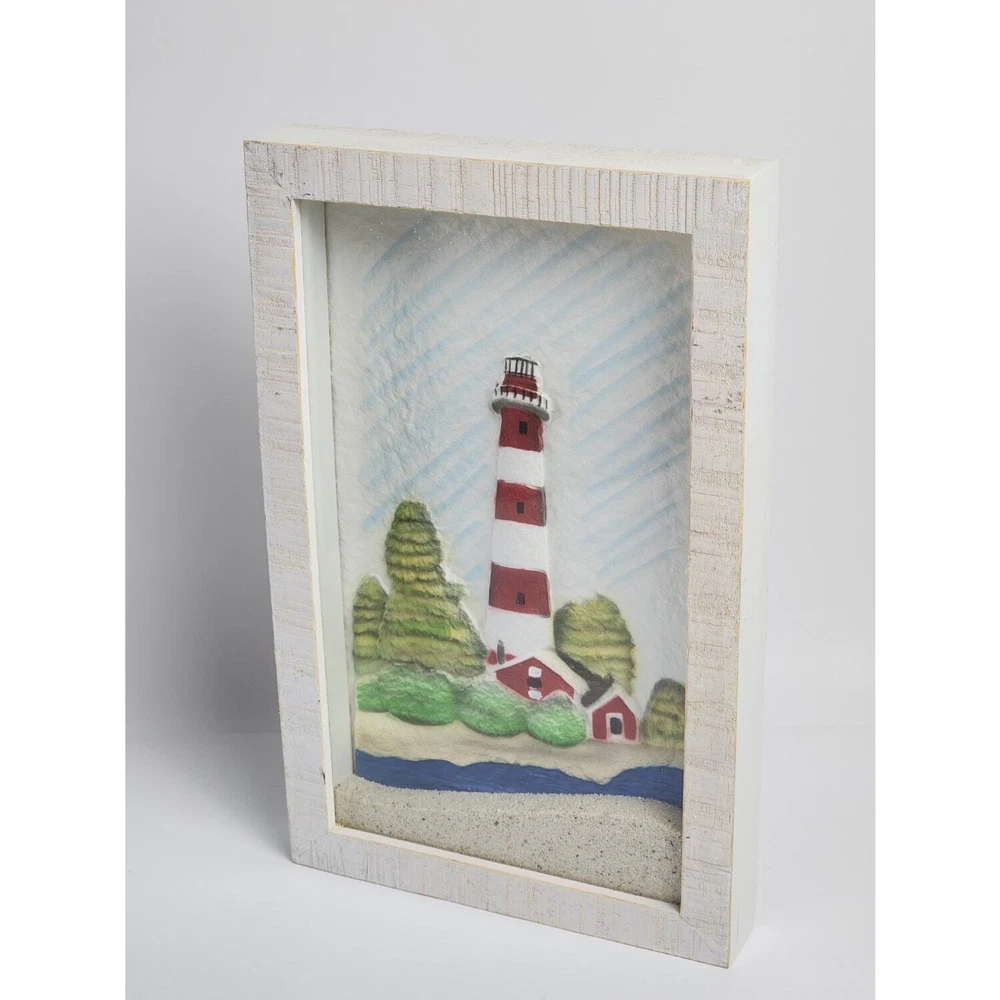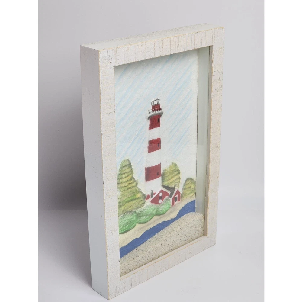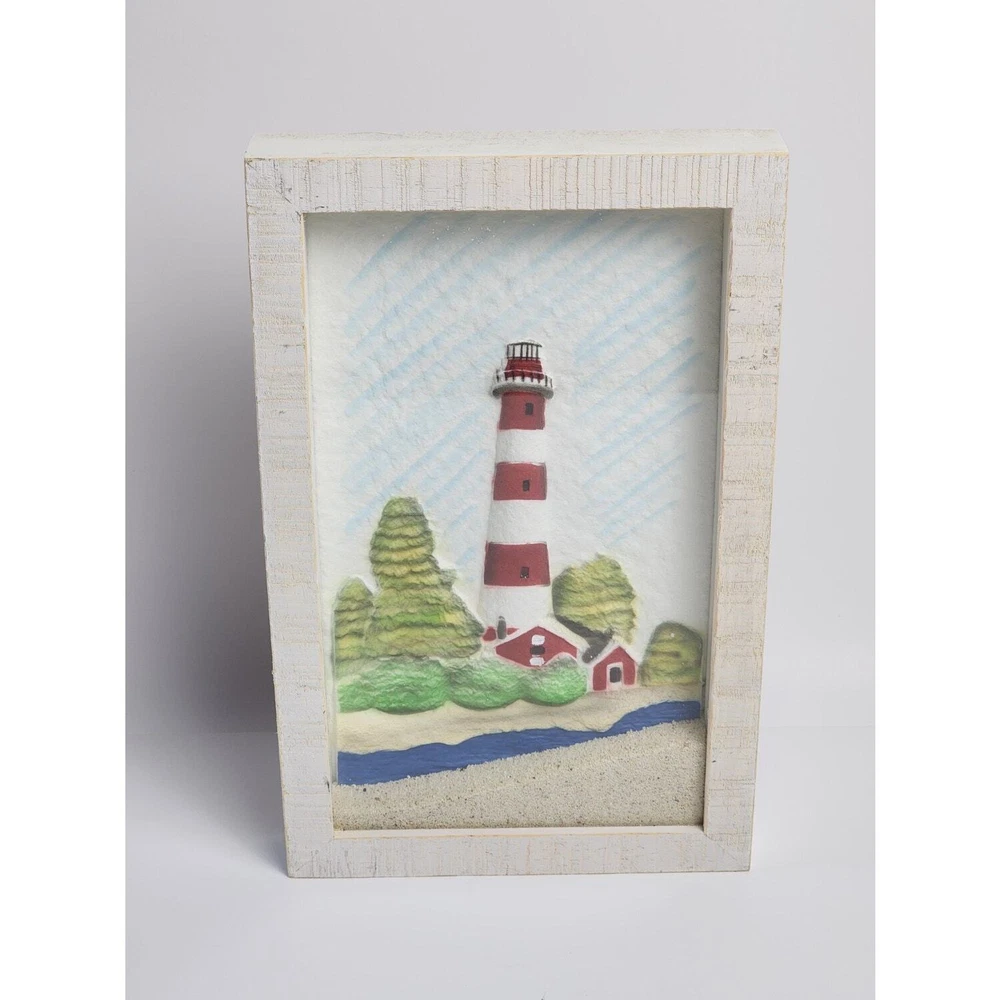 Nautical Themed Framed Picture Shadowbox 3D Lighthouse with Real Sand Décor • Nautical Lighthouse Shadowbox w/ Actual White Sand • Hand Cast Paper Art 3D Intricate Production Technique Used • Involved casting he paper by hand & painting the embossed paper • Framed in a shadowbox with sand for a unique textured look. • A Mixed-Media or Collage Artwork Style • Perfect for any nautical lovers home or office! • Measurements: 12” x 7.5” Pre-Owned / Used: A product that has been used previously. View our listing for full details in our description and check out our photos provided. If there are any imperfections, it will be noted in the description and/or within the provided photos. We appreciate you looking at our listing. Before placing an order, feel free to ask any questions you may have about this item. Upon receiving your order, if you are not satisfied with your order, please contact us and we will address any issue.