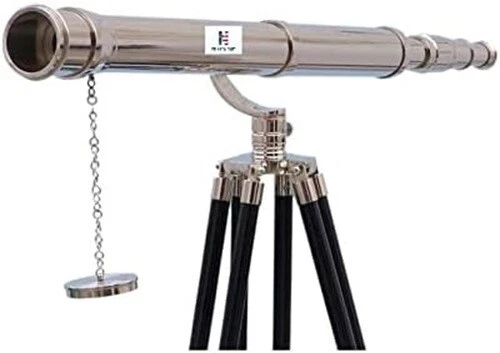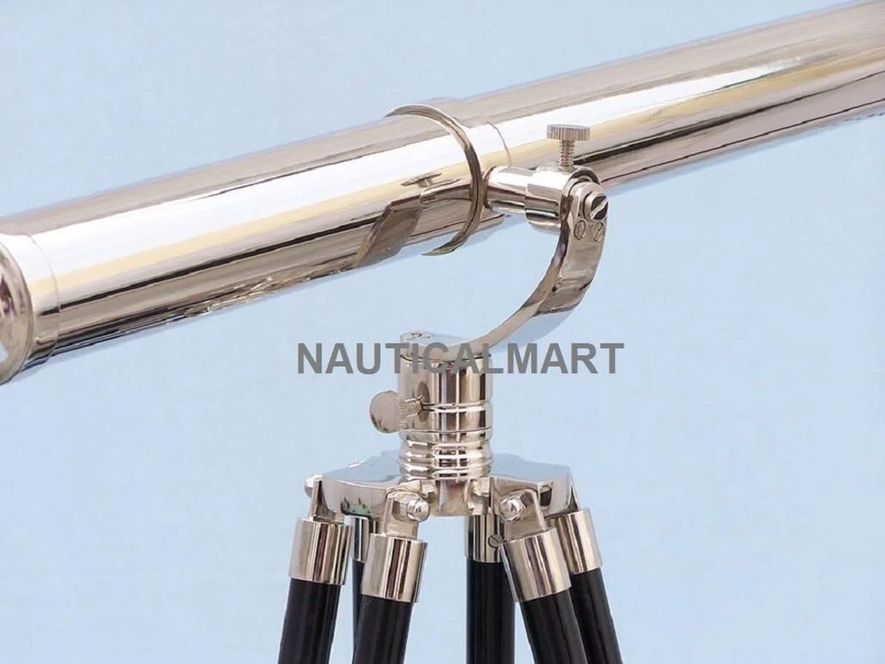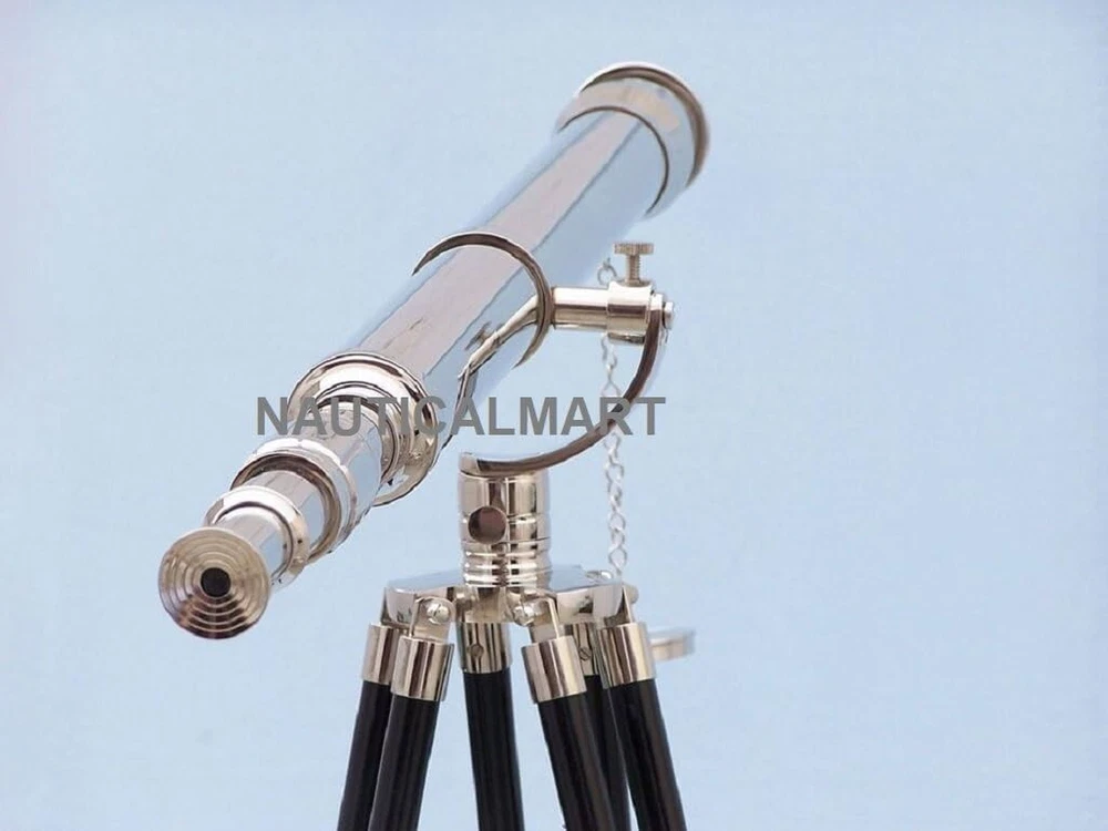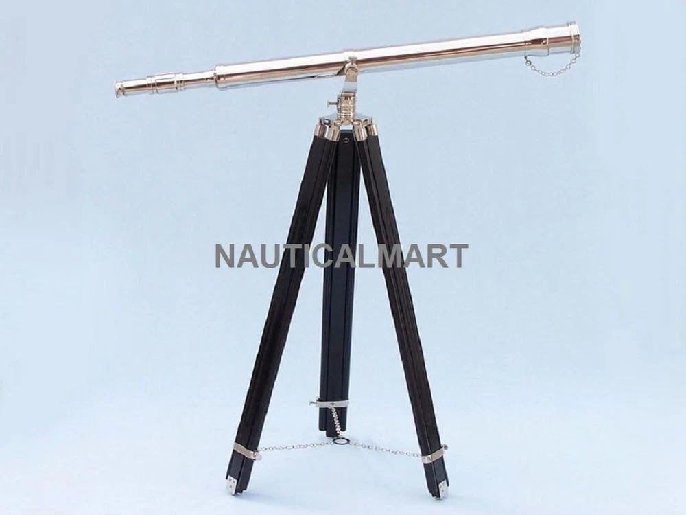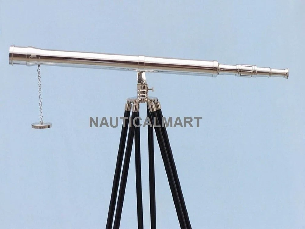 NauticalMart Floor Standing Chrome Galileo Telescope 65" 15X Magnification; Chrome telescope body Glass optics for a clear view (not plastic lenses) Fully functional telescope focuses and magnifies Sturdy wooden tripod supports telescope when viewing Custom size telescope can direct order to NAUTICALMART Description The Nautical Chrome Galileo Telescope 65" is by far our standout choice amongst nautical enthusiasts worldwide. Constructed from 100% chrome, this refractor telescope is mounted on a wooden tripod. This telescope is a fully functioning nautical masterpiece that adds class and sophistication to any room it’s in. This is a perfect gift for the nautical explorer, an appropriate piece to spruce up an office for the busy executive, or perfectly position this exquisite telescope by your window sill to stargaze. The main scope is solid chrome, which shines beautifully when placed in the sunlight. Focusing is accomplished by adjusting the eyepiece ring on the telescope tube, with up to 15x magnification. A removable chrome cap, connected by a chain, protects the objective lens. The wooden tripod stand features smooth, polished round legs, each with chrome fittings and a screw release to let you adjust the height. A chrome chain holds the three wooden legs together so the telescope can maintain its position. Dimensions: 30" Long x 24" Wide x 62" High.