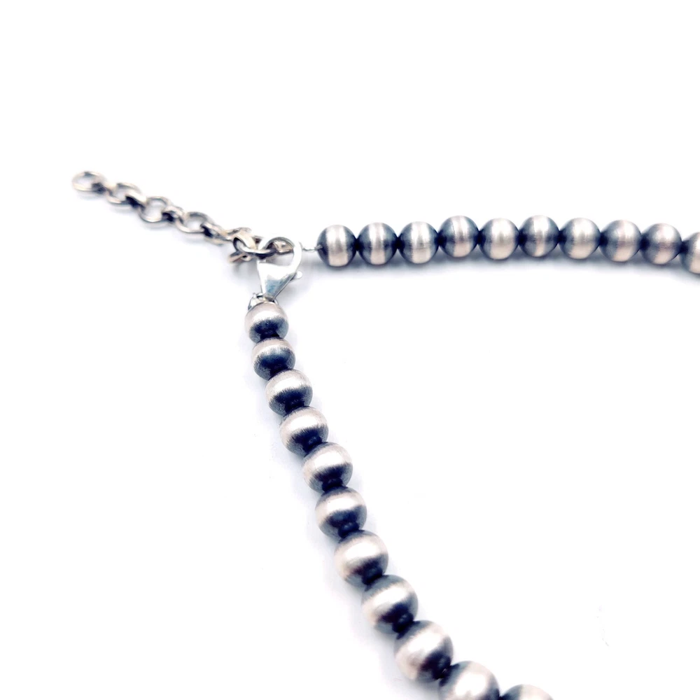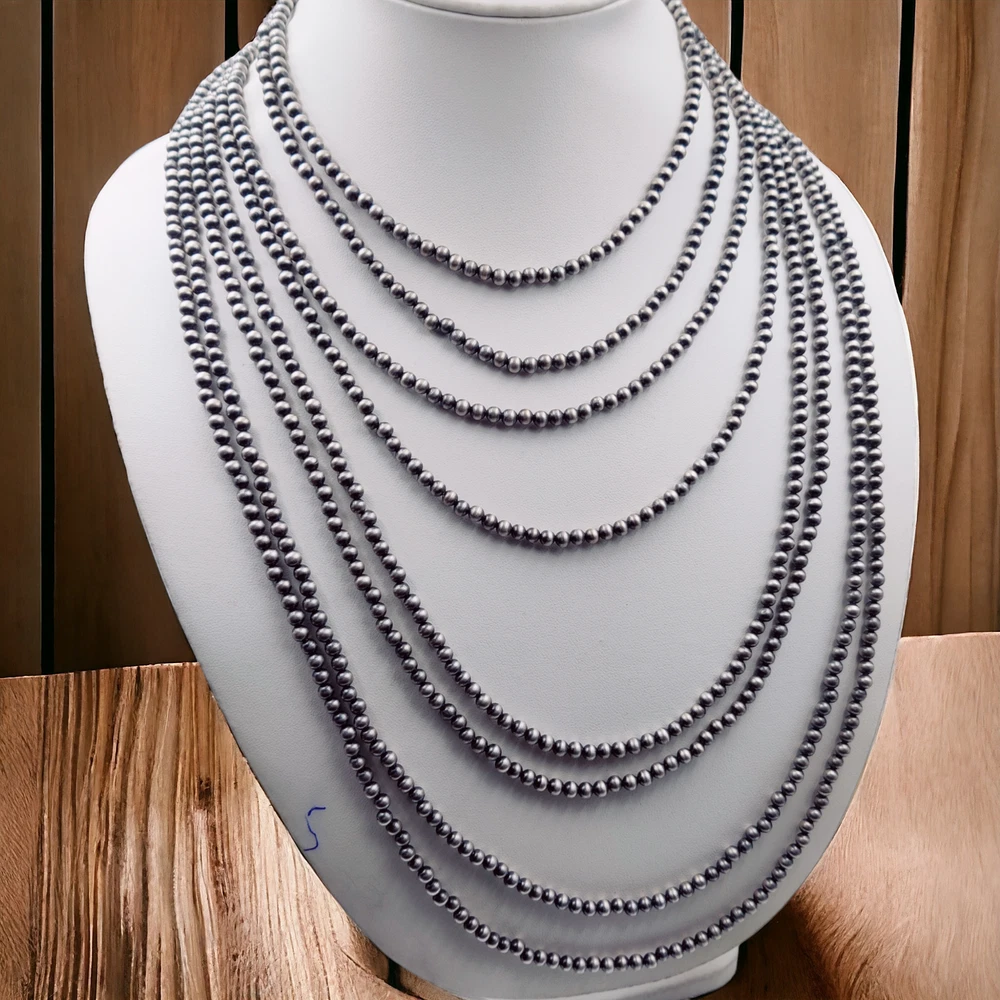 SIZE - 4 MM LENGTH - 14" TO 30" METAL - 925 STERLING SILVER STYLE - NAVAJO DESERT PEARL NECKALCE Simple Southwest! A choker of hand-finished Oxidized 4mm Sterling silver beads. A simple piece of jewelry that layers beautifully with all things Southwest, or they stand alone nicely! Or they can be thrown into any mix. The Sterling silver is oxidized right here in my shop, and necklace is clasped with Lobster clasp, and extender chain which extends choker 2". We understand the true value and nature of handcrafted Indian jewelry. WE ALSO MAKE CUSTUM ORDER ALL SIZE NAVAJO ROUND OR SAUCER BEADS NACKELACE OR BRACLET AND EARRING 4 MM TO 16 MM WE ALSO SELL LOOSE ROUND BEADS OR SAUCER BEADS ON BUYER DEMAND Wholesale orders also accepted at wholesale price. Minimum quantity- 10 pcs EACH SIZE