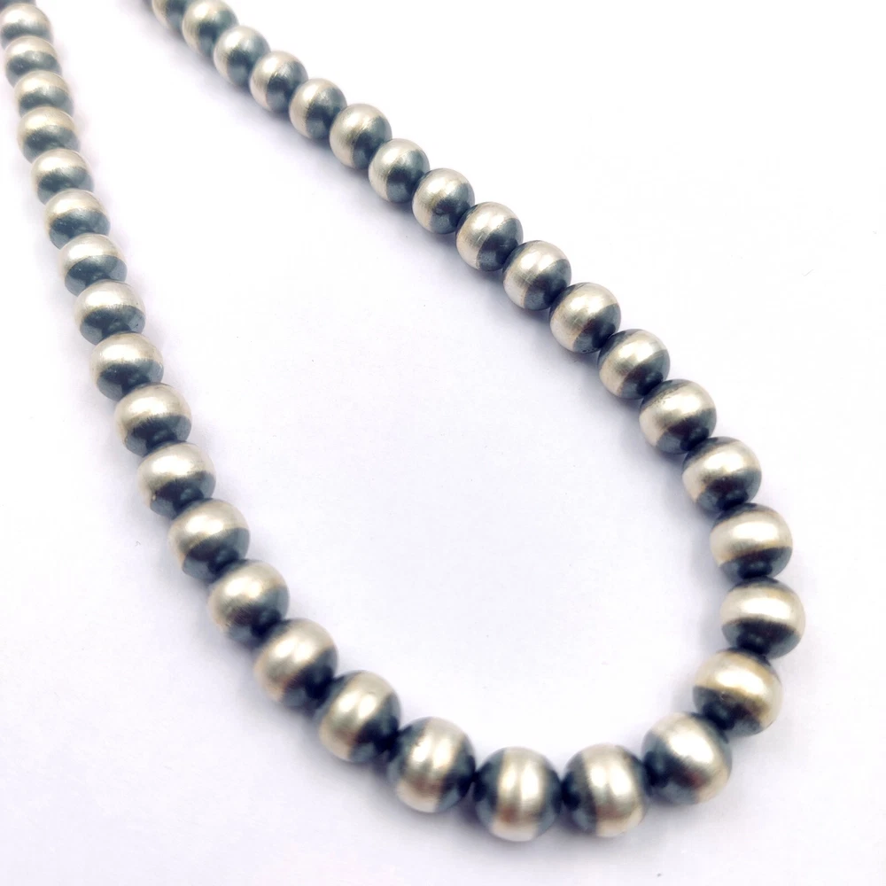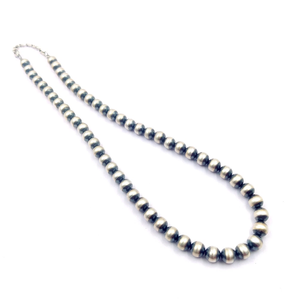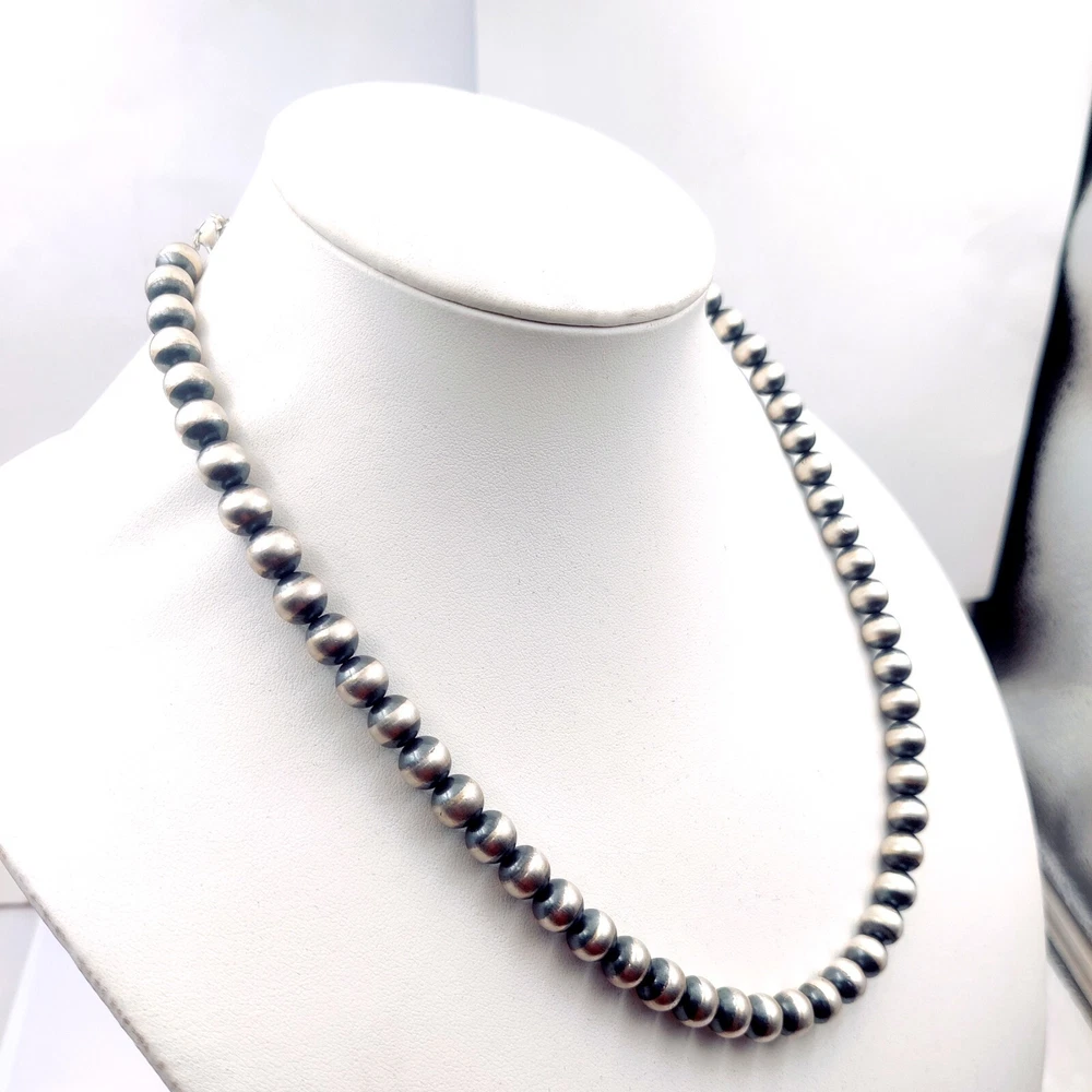SIZE - 8 MM LENGTH - 14" TO 30" METAL - 925 STERLING SILVER STYLE - NAVAJO DESERT PEARL NECKALCE Simple Southwest! A choker of hand-finished Oxidized 5mm Sterling silver beads. A simple piece of jewelry that layers beautifully with all things Southwest, or they stand alone nicely! Or they can be thrown into any mix. The Sterling silver is oxidized right here in my shop, and necklace is clasped with Lobster clasp, and extender chain which extends choker 2". We understand the true value and nature of handcrafted Indian jewelry. WE ALSO MAKE CUSTUM ORDER ALL SIZE NAVAJO ROUND OR SAUCER BEADS NACKELACE OR BRACLET AND EARRING 4 MM TO 16 MM WE ALSO SELL LOOSE ROUND BEADS OR SAUCER BEADS ON BUYER DEMAND Wholesale orders also accepted at wholesale price. Minimum quantity- 10 pcs EACH SIZE