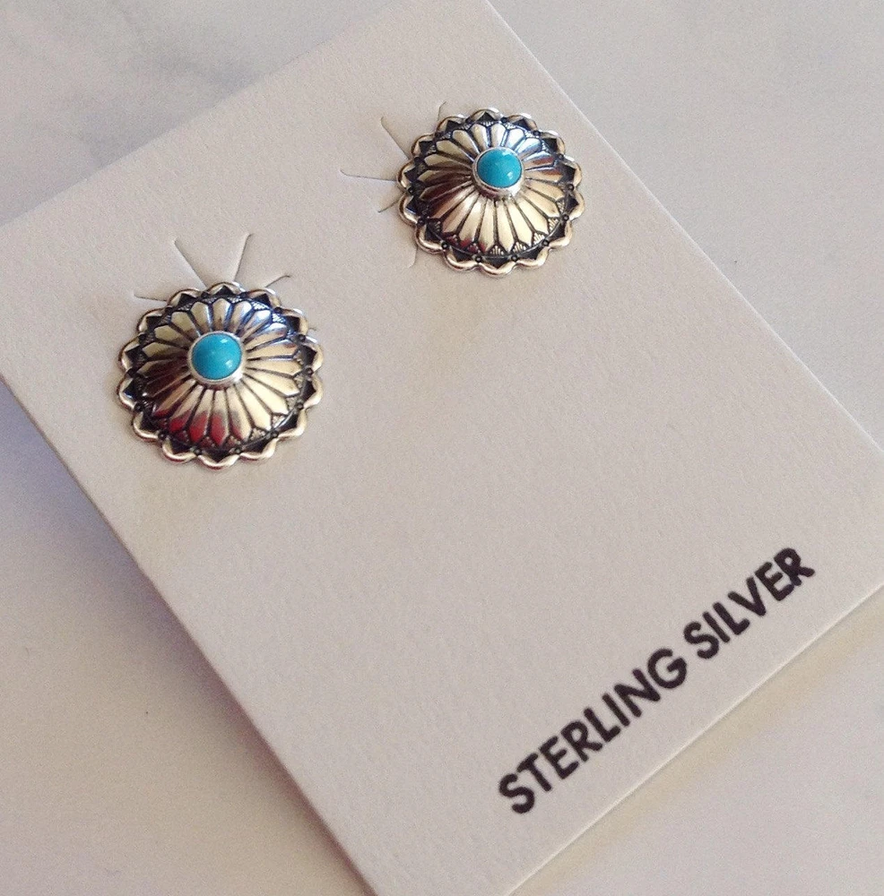 These are very cute Navajo sterling silver and turquoise concho earrings. They were bought in Albuquerque, New Mexico. There is a hand stamped pattern on the earrings. They were made by an unknown Navajo artist. These sterling silver earrings measure just under 1/2 inch in diameter and have a center turquoise bead. The combined weight of these earrings is 1.3 grams for all day comfort. These earrings are in excellent condition - great concho style earrings. A gift box is included with purchase.
