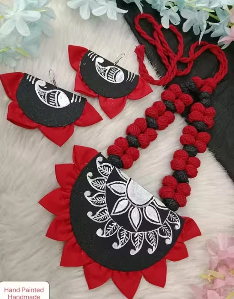 Discover the perfect blend of artistry and elegance with this unique necklace set, meticulously handcrafted to make you stand out. Each piece features vibrant, hand-painted cotton thread balls that are intricately designed with colorful patterns and exquisite detailing. The lightweight fabric threads offer a comfortable fit while adding a pop of color to any outfit. Features : Artisanal Craftsmanship : Each thread ball is individually hand-painted, ensuring a one-of-a-kind design that's as unique as you are. Vibrant Colors : The rich, lively hues are sure to brighten up your look and complement any wardrobe. Versatile Style : Ideal for both casual and formal occasions, this set transitions effortlessly from day to night. Adjustable Length : The necklace comes with an adjustable chain, allowing you to customize the fit to your preference. Matching Set : Includes a coordinating pair of earrings to complete the look. Whether you're treating yourself or searching for a thoughtful gift, this Hand-Painted Cotton Thread Balls Fabric Necklace Set is a beautiful choice. Embrace the charm of handmade elegance and add a splash of color to your collection!