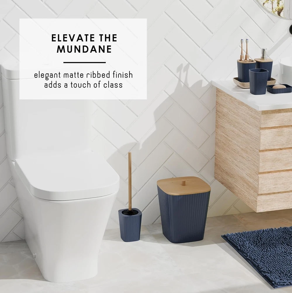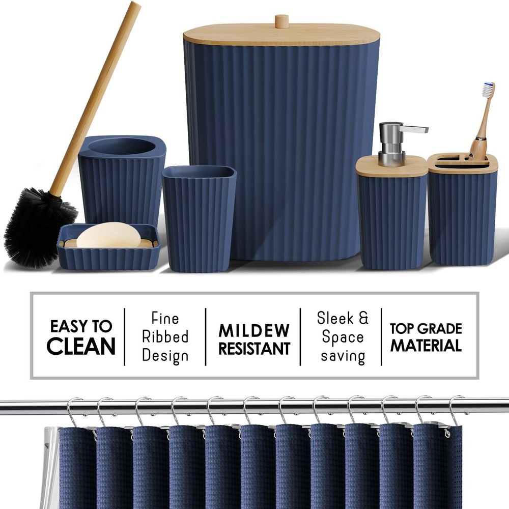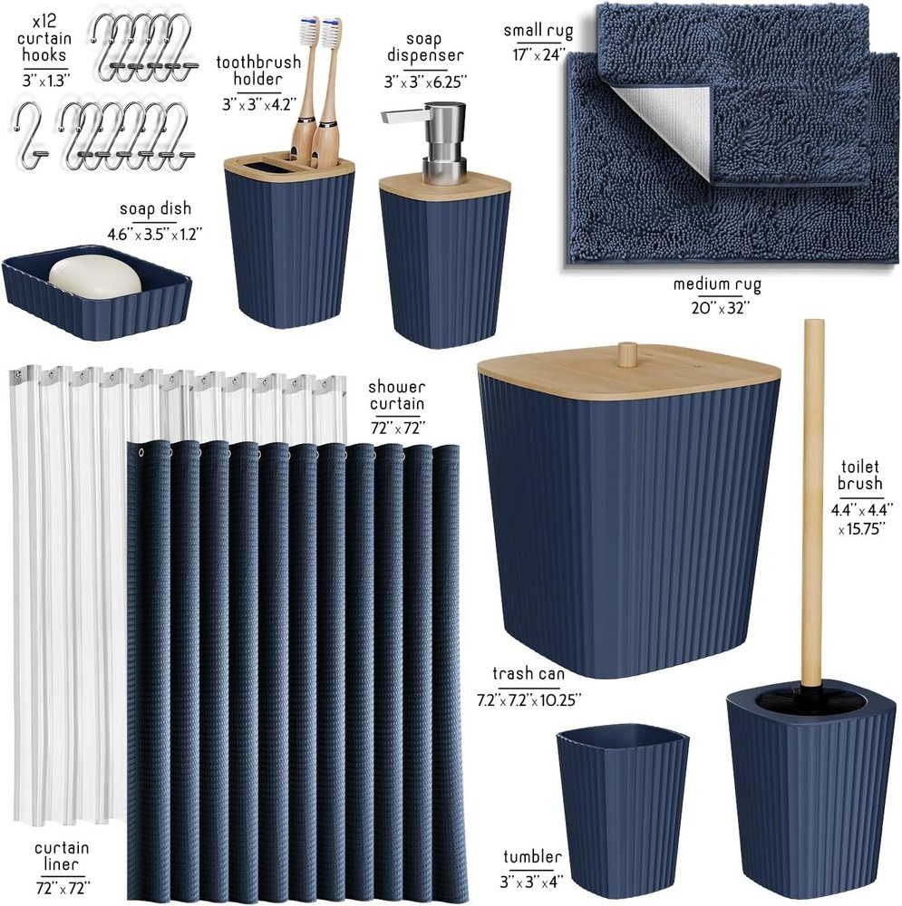 Bathroom Accessories Set - Navy Bathroom Set, Bathroom Sets with Shower Curtain and Rugs, 22PC Shower Curtain Set with Bathroom Trash Can 100% Polyester Navy Blue Bathroom Accessories Set: Update your bathroom set with Navy Blue bathroom decor, creating a stylish haven with a Navy Blue bathroom rug set and bamboo bathroom accessory set. Bathroom Sets with Shower Curtain and Rugs: Includes 2 bathroom rugs, toothbrush holder, tumbler, soap dispenser, soap dish, bathroom trash can, toilet brush and holder set, 12 shower curtain hooks, and fabric shower curtain set with clear shower curtain liner. Boho Shower Curtain with Shower Liner: Shower curtain with hooks includes a clear shower curtain liner with weighted magnets at the bottom to keep it in place, and 12 rust-resistant shower curtain rings. Navy Blue Shower Curtain: Shower curtains for bathroom measure 72” x 72”; made of durable, wrinkle-resistant polyester with a waffle texture, and reinforced hook holes. 2 Bath Mats for Bathroom, Non Slip: Each chenille bath rug is super soft and highly absorbent, with non-skid backing. Navy Blue bathroom rug set: Small 17”x24”; Large 20”x32”.