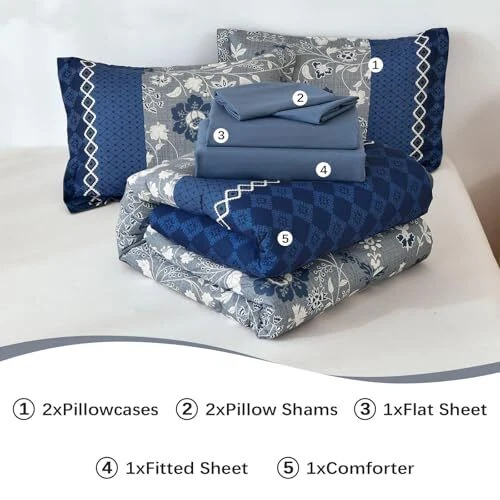 Navy Blue Comforter Set Queen, 7 Pieces Bed in a Bag Floral Geometric