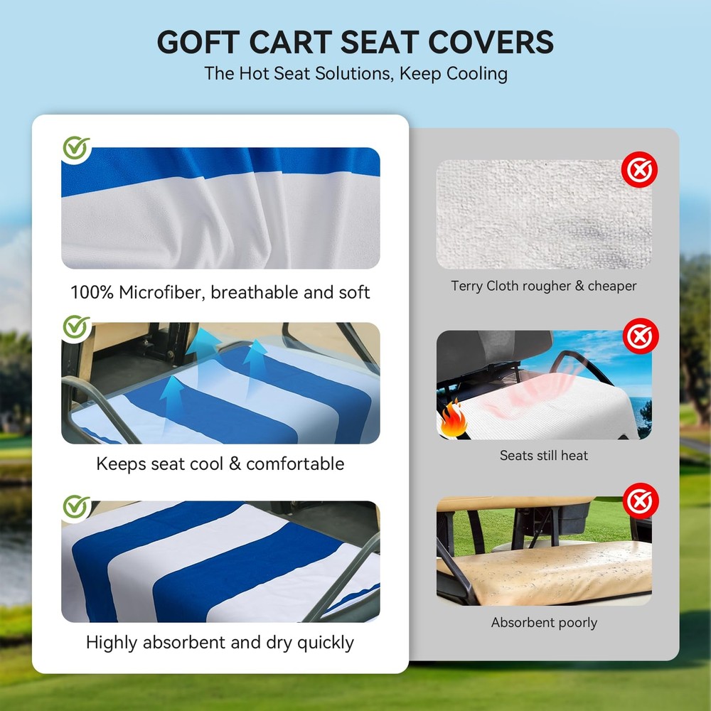 Golf Cart Seat Covers for Summer or Winter, Universal Durable Breathable Anti-hot Golf Cart Seat Towel Blanket for All EZGO, Yamaha, Club Car and More 2 Person Seats Golf Carts (Navy Blue) Universal Golf Cart Seat Covers: Dimensions 51'' (L) x 31'' (H), perfect fit for EZGO, Yamaha, Club Car, Icon, Extra and so on of the 2 seater golf carts. Soft & Super Absorbent Seat Covers for Golf Cart: Premium microfiber fabric, extremely soft and super absorbent and dry quickly. Vibrant and HD prints, fade-resistance, the eye-catching covers not only keeps your goft cart clean, but it also give it a unique look, Comfortable From Heat & Warm for Winter: Nice Protection from a hot, cold, or wet seat, it helps with heat from seats in the sun and prevent skin from sweat sticking or avoid legs burning up. It acts as a cozy blanket during chillier days. Best Gift for Golfer or Renter: This golf cart accessories-seat blanket is the best golf gifts for boss, fathers, husband, brothers and all of golf lovers, it is also a thoughtful gift for your wife, mather, girlfriend, sister. Easy to Install and Clean: Universal golf cart rear seat cover can quickly fix the handrail to keep it in place and it is very convenient to remove it. Folding up and stores in your golf bag easily too. Machine washable. Golf Cart Seat Covers (Navy Blue) Shipping We offer FREE shipping on all orders! We ship within Three business days of payment, usually sooner. We use a selection of shipping services such as UPS, FedEx, USPS etc. We only ship to the lower 48 states, no APO/FPO addresses or PO Boxes allowed. Local pickups and combined shipping options are not provided at this time. Return You can return a product for up to 30 days from the date you purchased it. Any product you return must be in the same condition you received it and in the original packaging. Please keep the receipt. Payment We accept payment by any of the following methods: PayPal Please pay as soon as possible after winning an auction, as that will allow us to post your item to you sooner! Feedback Customer satisfaction is very important to us. If you have any problem with your order, please contact us and we will do our best to make you satisfied. Contact Us If you have any queries, please contact us via ebay. We usually respond within 24 hours on weekdays. Please visit our eBay store to check out other items for sale! Thank you for shopping at our store.
