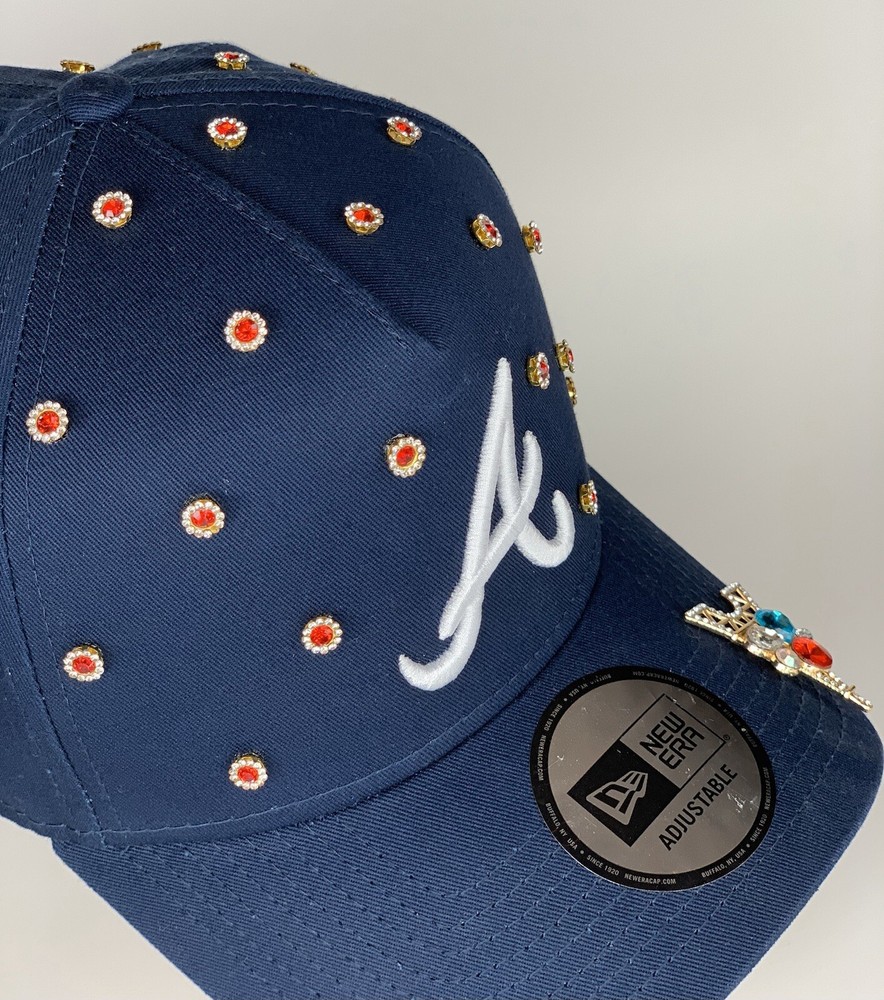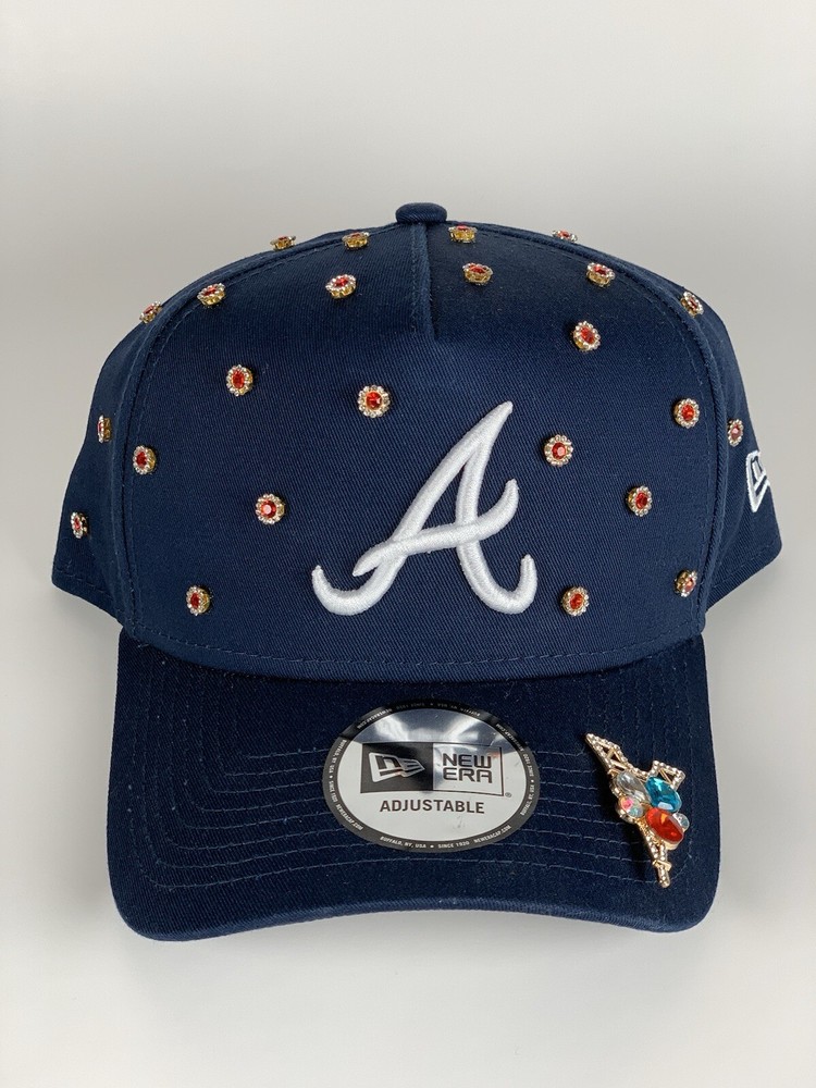 This is a navy blue baseball cap with red bling and Atlanta Braves embroidery. It is a custom New Era cap made in the United States with acrylic, polyester, and wool materials. The cap is fitted and has a solid pattern. It is suitable for travel, weddings, parties, casual and formal occasions, workwear, and business events. The cap is available in one size and can be personalized. The personalization instructions are to handle with care. The cap is handmade and has a 90s theme.