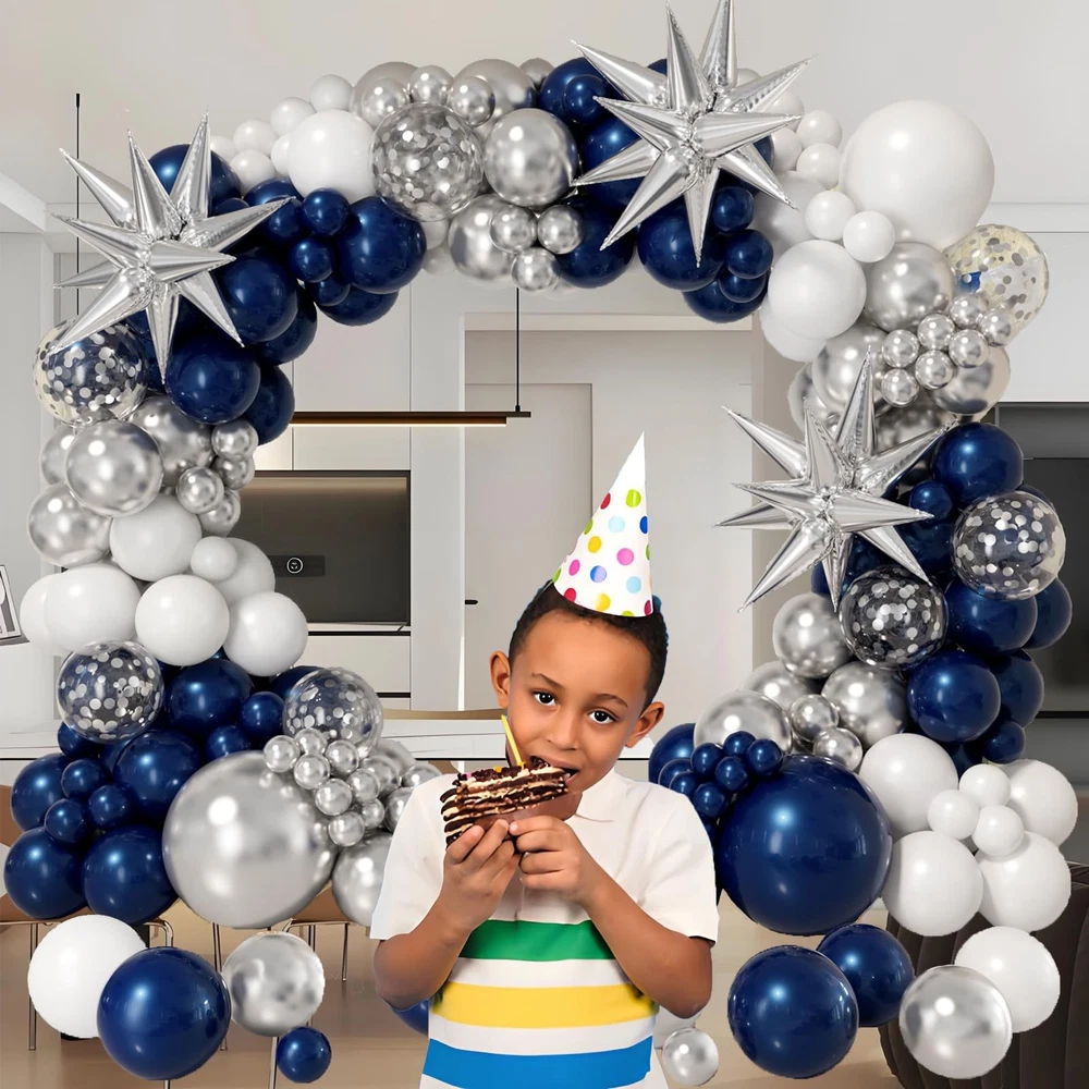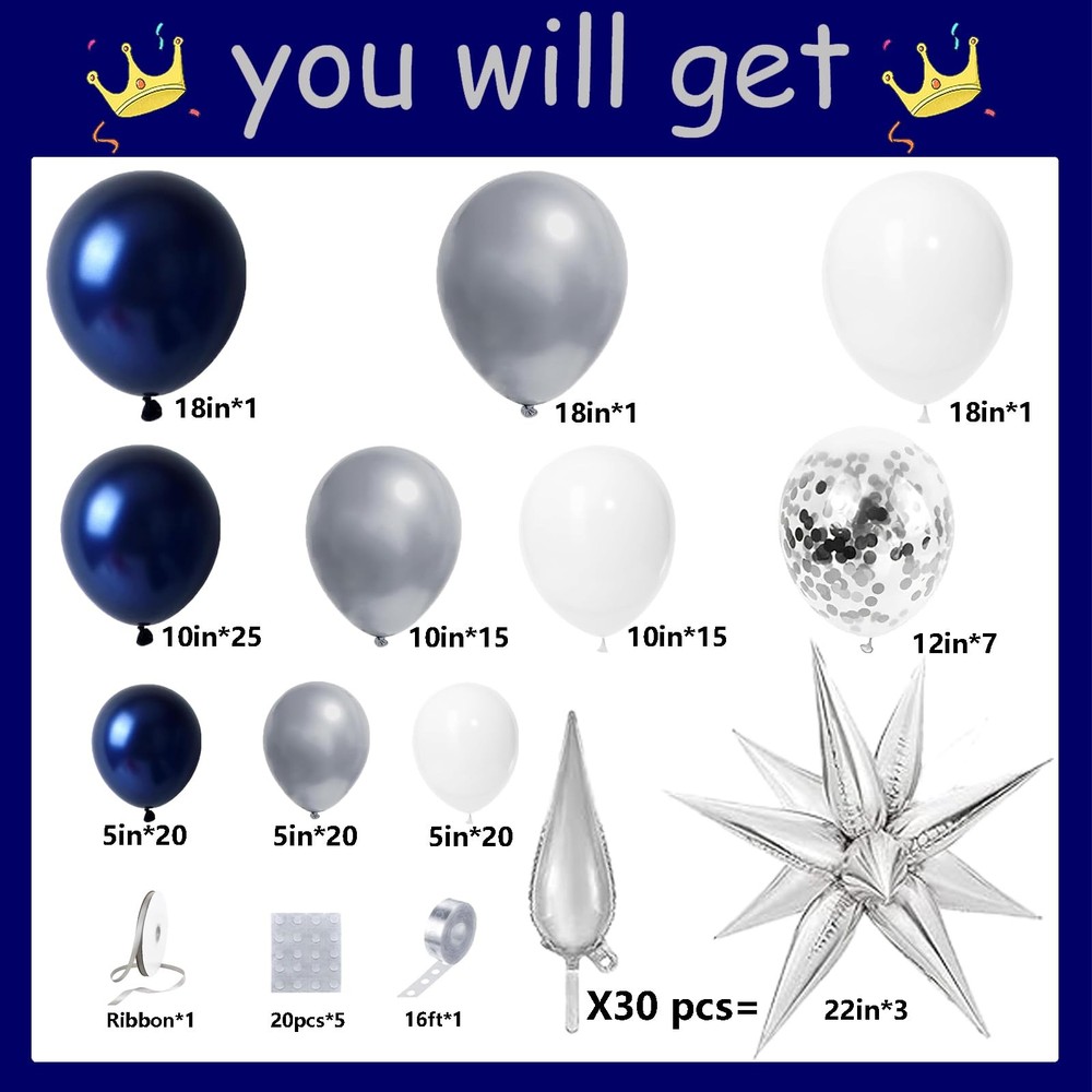 Navy Blue and Silver Balloon Garland Arch Kit 158pcs with Blue White Silver Confetti Balloons, Star Foil Balloons, for Graduation New Year Anniversary Birthday Party Decorations [Included Products] navy blue balloons (18 inches × 1 pieces, 10 inches × 25 piece, 5 inches × 20 pieces), silver balloons (18 inches × 1 pieces, 10 inches × 15 piece, 5 inches × 20 pieces), white balloons (18 inches × 1 pieces, 10 inches × 15 piece, 5 inches × 20 pieces), confetti balloons (12 inches × 7 pieces), star balloons (22 inches × 3 pieces), balloon strip × 1 , glue × 5, ribbon × 1 [Premium Quality] This blue silver and white balloons are made of natural latex materials, so they are non-toxic and durable enough to keep a good shape for a long time after inflation, so you don't have to worry about bursting in the party. Please do not over inflate the balloons [Multiple Uses] This blue and silver balloon arch kit set is widely used, suitable for graduation themed party, new years party, birthday party, anniversary, graduation, banquet, girl shower, baby shower, bridal shower, marriage proposal, wedding, Valentine's Day, Mother's Day and so on. It will add a delightful and joyful atmosphere to you [Easy to Assemble ] our graduation balloon arch provides three different attachment and decorating tools: balloon strips, glue and ribbons, which can connect the balloons into a variety of shapes, making it easier for you to build the balloon garland arch. please enjoy your imagination, enjoy DIY with your family and design your party decoration, it will be a fun process! [Aftersale Service] When you get these blue and silver balloons kit, if you are not satisfied with the party balloons or the balloons are damaged, you can contact us at any time to get refund or brand new balloons replacement, we will definitely provide excellent service! Navy Blue and Silver Balloon Garland Arch Kit 158pcs with Blue White Silver Confetti Balloons, Star Foil Balloons, for Graduation New Year Anniversary Birthday Party Decorations Shipping We offer FREE shipping on all orders! We ship within Three business days of payment, usually sooner. We use a selection of shipping services such as UPS, FedEx, USPS etc. We only ship to the lower 48 states, no APO/FPO addresses or PO Boxes allowed. Local pickups and combined shipping options are not provided at this time. Return You can return a product for up to 30 days from the date you purchased it. Any product you return must be in the same condition you received it and in the original packaging. Please keep the receipt. Payment We accept payment by any of the following methods: PayPal Please pay as soon as possible after winning an auction, as that will allow us to post your item to you sooner! Feedback Customer satisfaction is very important to us. If you have any problem with your order, please contact us and we will do our best to make you satisfied. Contact Us If you have any queries, please contact us via ebay. We usually respond within 24 hours on weekdays. Please visit our eBay store to check out other items for sale! Thank you for shopping at our store.