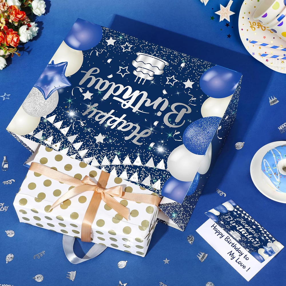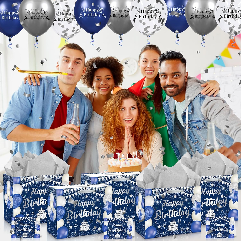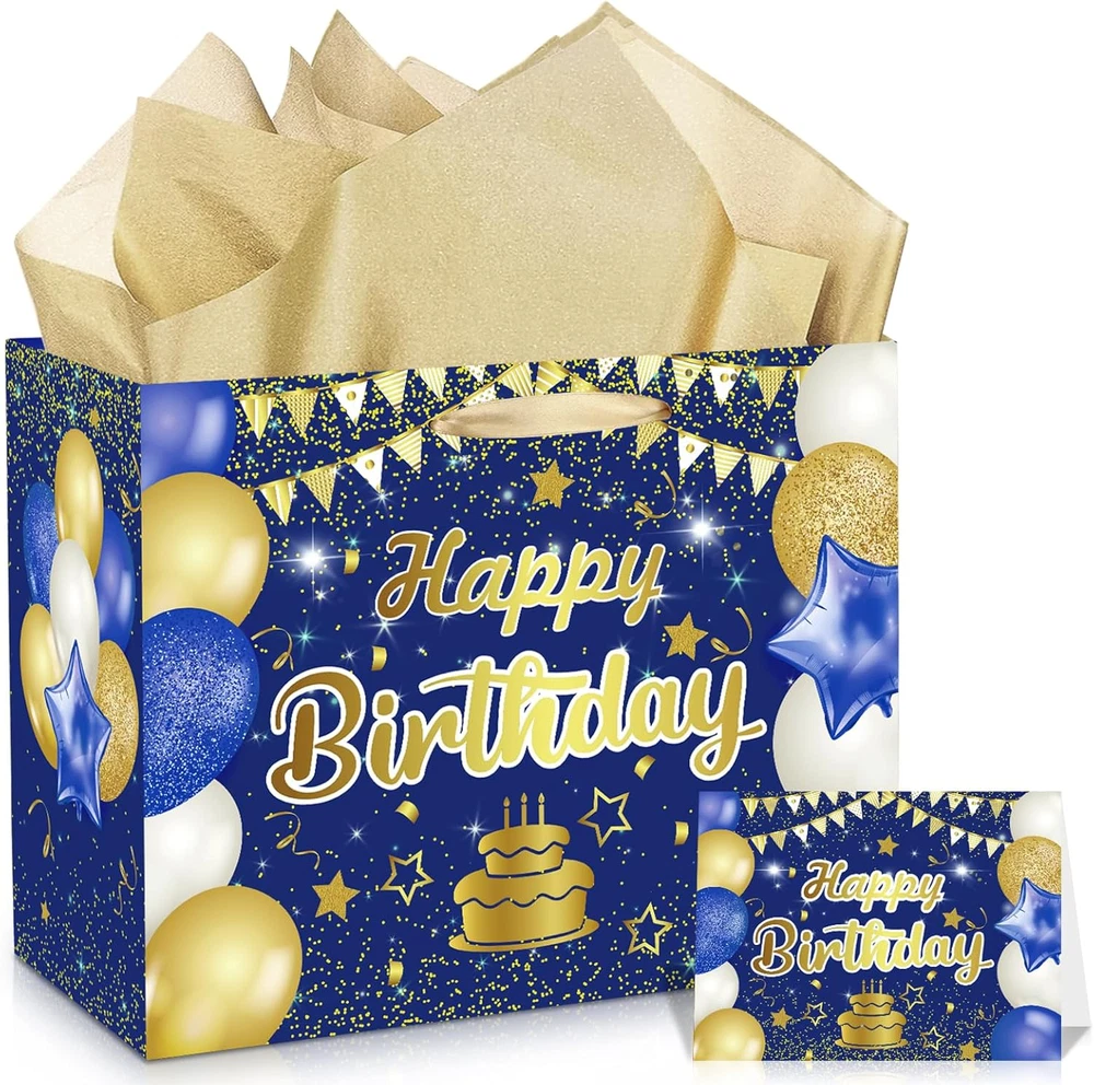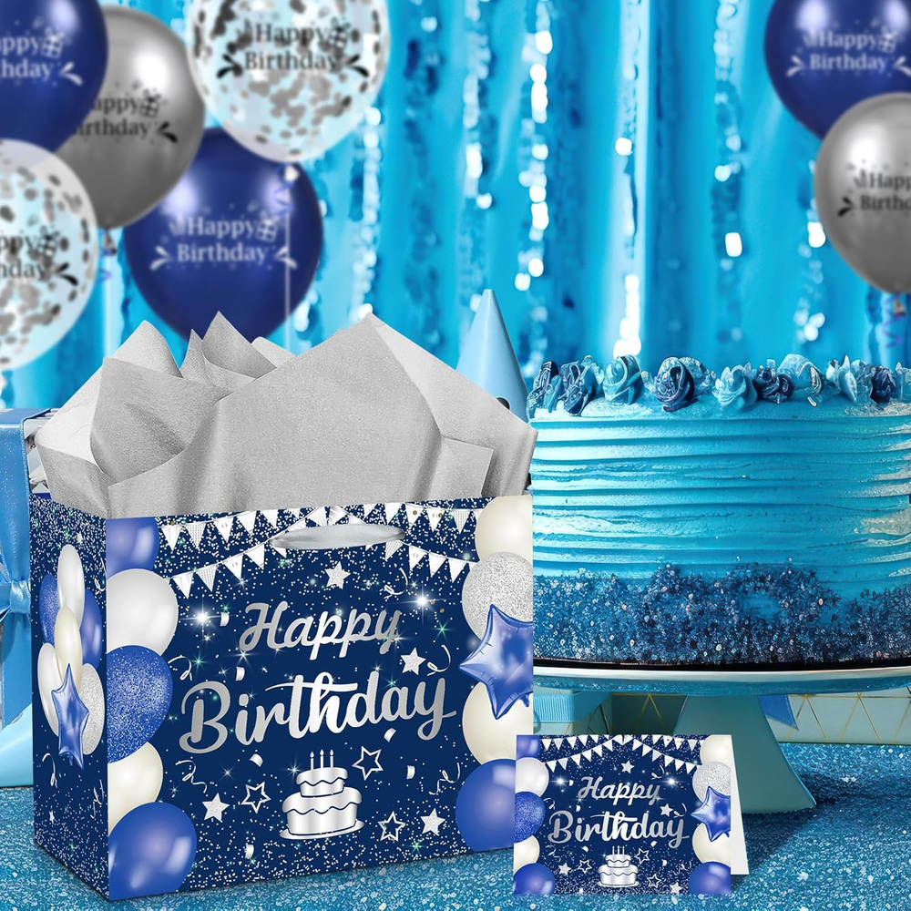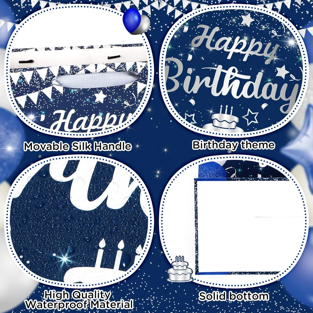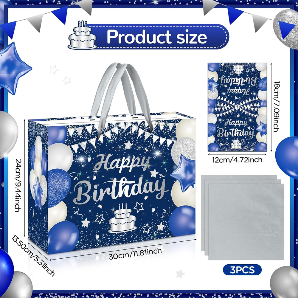 🎁Great Design:Large navy blue Silver birthday gift bag features a very shiny and realistic print, with a navy blue Silver happy birthday blessing card and 3pcs Silver tissue paper which make the birthday gifts look more full of birthday party atmosphere 🎁Complete Matching:1pc large happy birthday gift bag with 3pcs Silver tissue paper, there is also a blank card that perfectly matches the gift bag, You can write your blessings in the birthday greeting card, which is the best way to convey your blessings 🎁Size:The size of navy blue Silver happy birthday gift bag:30 x 24 x 13.5 cm/11.8 x 9.4 x 5.3 inches; The size of birthday blessing card: 18 x 12 cm/7.1 x 4.7 inches, The navy blue Silver happy birthday gift bag is large enough to hold a large number of gifts 🎁Great Material:The happy birthday gift bag made of waterproof and high-quality paper material and can be reused, The handle of the gift bag is made of silk when you hold it the handle will not pinch your hand, and the bottom of the bag is very strong and not easily damaged 🎁Widely Used:This navy blue Silver happy birthday gift bag is large enough to hold many types of birthday gifts, corresponding to the Anniversary birthday party. You can use it to wrap your gift and give it to your friends, parents, or other elders Product Description