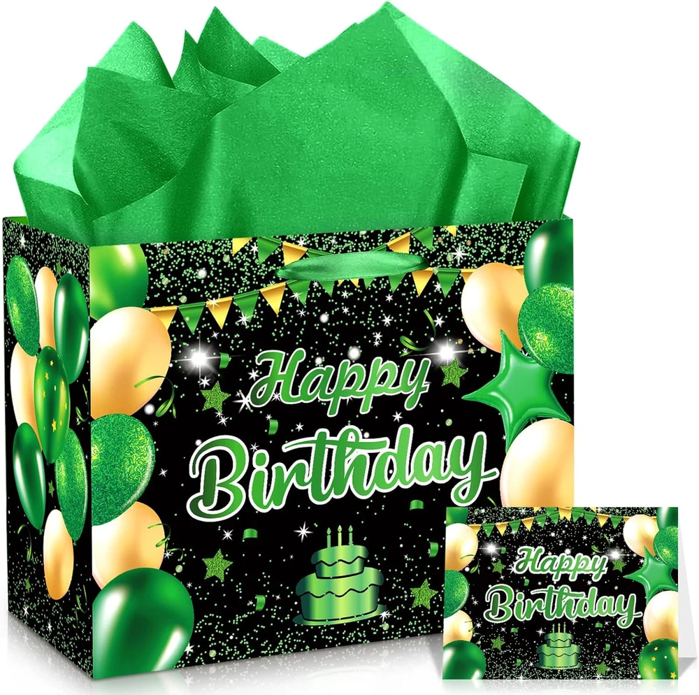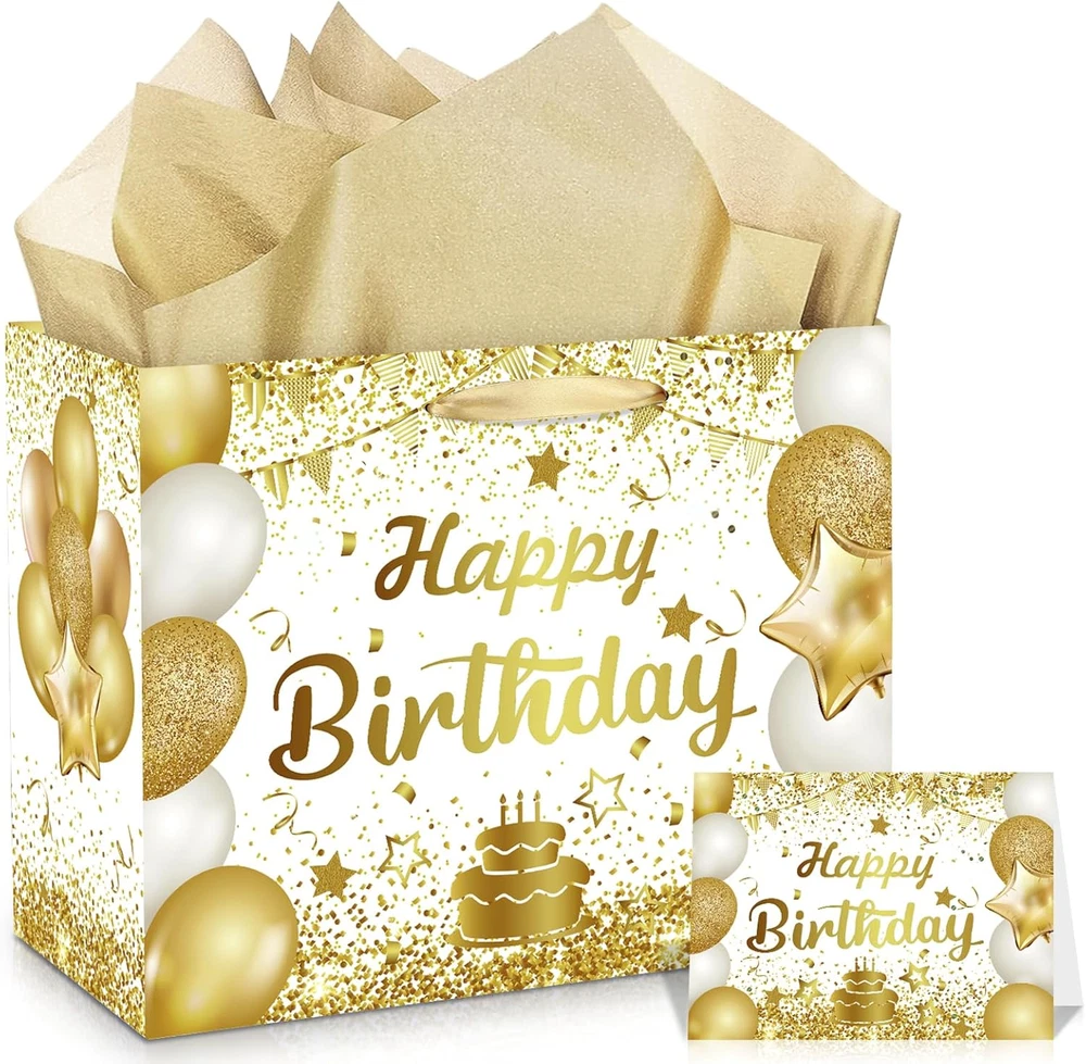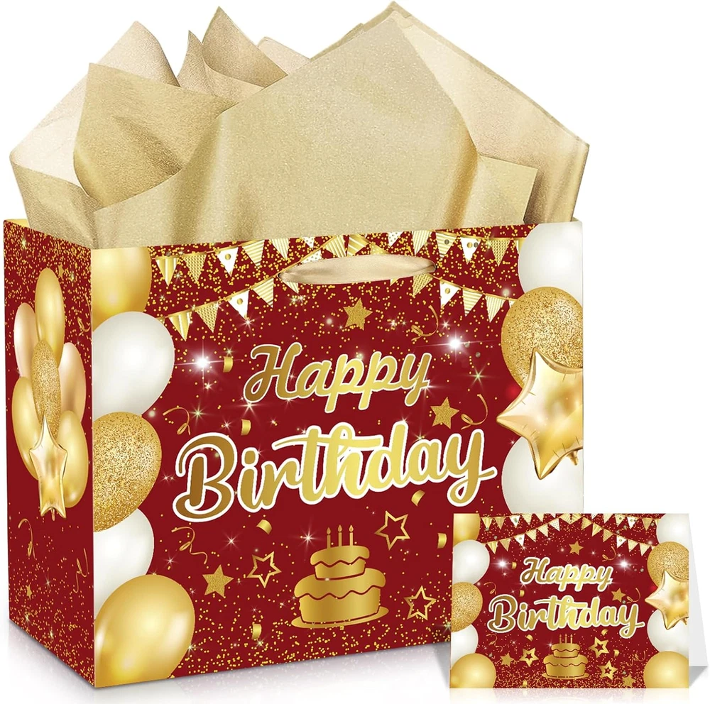 Material: Paper Included Components: Birthday gift bag,Card, Tissue Paper Country of Origin: China Occasion: Anniversary, Birthday Manufacturer: Wayyogh Number of Items: 1 Pattern: Letter Print Unit Count: 1.0 Count Product Dimensions: 9.45"W x 5.31"H Package Dimensions: 14.41 x 10.39 x 0.51 inches Theme: Birthday Type: Does not apply Brand: Wayyogh Item Weight: 4.2 ounces