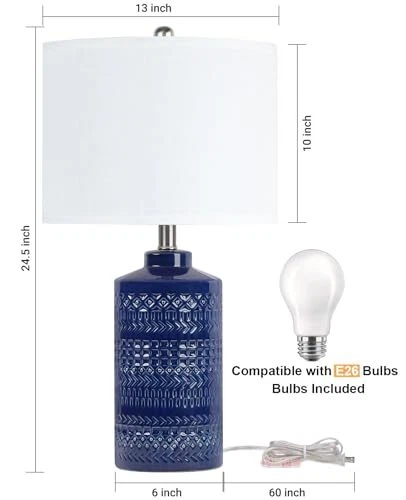 Menu 1. We require immediate payment. 2. We currently accept payment via eBay managed payments only. 3. Once payment is cleared, we will dispatch your shipment within 1-3 business days. Please refer to the "Shipping" tab for more information regarding shipping speed to your destination. Navy Blue Table Lamp 24.5", Modern Bedside Lamp Blue Ceramic Table Lamps for Living Room 3-Way Dimmable Entryway Lamp Nightstand Lamp Farmhouse Lamp for Home Office Bedroom, Bulb Included Product description Blue Ceramic Table Lamp: High-quality ceramic lamp body features a white fabric lampshade, this navy blue lamp is a perfect decor for any style of home. Perfect housewarming present for a close friend, client, colleague, or family. (Note: The lampshade needs to be assembled, please refer to our assembly video) Contemporary Design & Perfect Size: The blue ceramic lamp is 24.5” high overall with a 6” wide base, the whole lamp body is thick and stable, not easy to be knocked down. The perfect size makes the blue table lamp suitable for bedrooms, living room, foyer, dining room, and office 3-Way Dimmable: T is a rotary on/off switch on the bulb base of the white bedside lamp, every clockwise rotation of the switch turns it on and off, and its brightness will change once (Low - Off - Medium - Off - High - Off) A19-6W LED Bulb Included: The blue nightstand lamp comes with a custom A19-6W dimmable LED bulb ($8 value), which gives off stable 3000K soft light and has a lifespan of over 25,000 hours. No flicker and buzz will interrupt your work or sleep Purchg Protected: All of our lamps come with a 90-day money-back and a 2-year After-sale Services, we want to bring you a satisfying shopping experience. If t is any damage caused by transportation, or if you have any questions or problems about this navy blue table lamp, please feel do not hesitate to contact us via the message box at any time PLEASE MESSAGE US IF YOU HAVE ANY OTHER QUESTIONS, AND MANY THANKS FOR READING ALL OF THIS. Copyright ©#. All Rights Reserved.