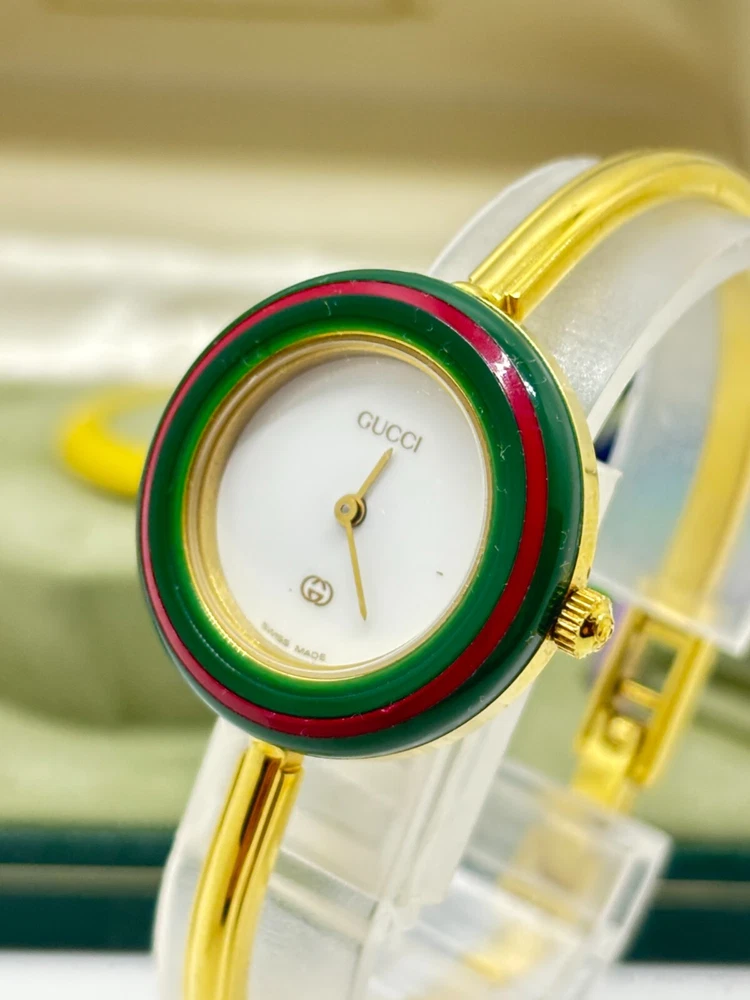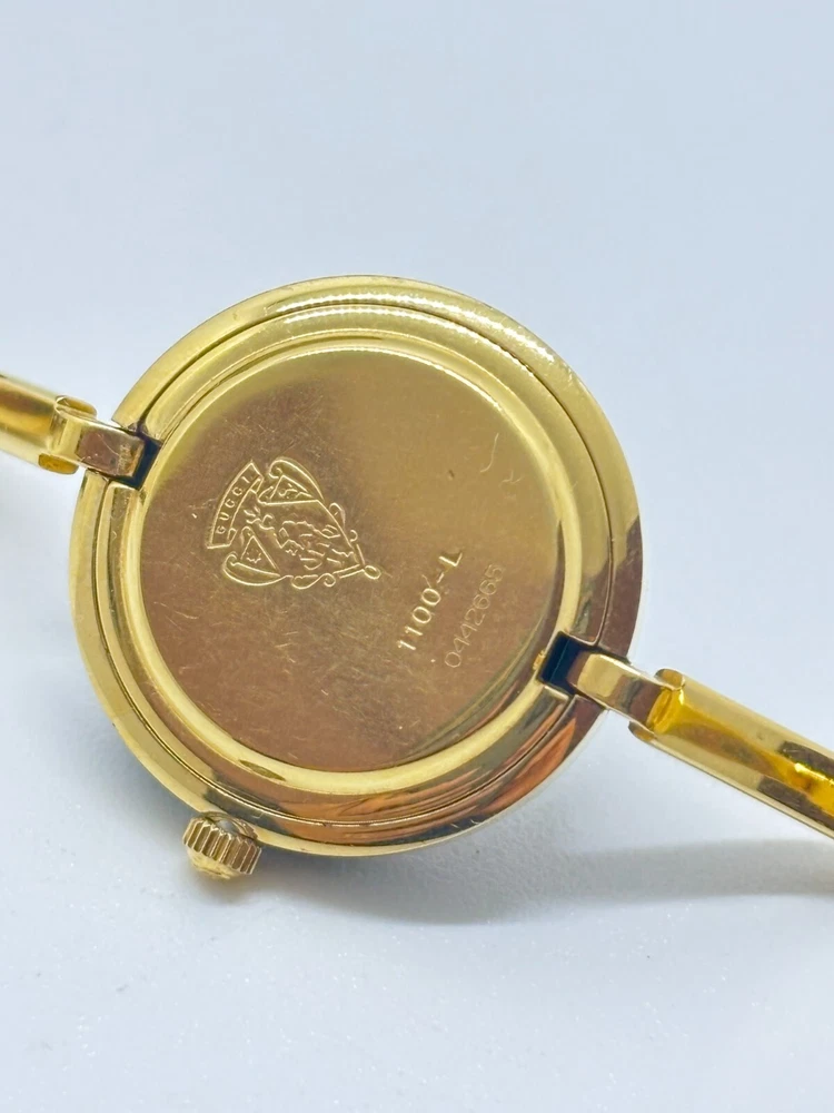 Country/Region of Manufacture: Japan Band Color: Gold gtin13: Does not apply Seller Notes: “Please see photos and description.” Bezel Color: Gold Department: Women Display: Analog Model: Gucci 1100 Year Manufactured: 1980-1989 Reference Number: 1100L UPC: Does not apply Movement: Quartz Band/Strap: Bracelet Dial Color: White Max Wrist Size: 15.5cm Closure: Buckle Case Color: Gold Brand: Gucci Type: Wristwatch