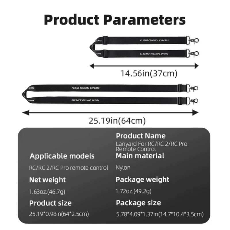 Neck Strap Lanyard Shoulder Belt Hanging Rope for 3/4 Remote Control Features: During flight photography or batteries replacement, hands can be released to effectively and safely protect the remote control. nylon material, lightweight, good breathability, and not easy to break. Stainless steel metal buckle, sturdy and durable. The fabric is soft and smooth, making it comfortable to wear. Length can be adjusted within ranges of 40-67.5cm/37-64cm, suitable for people of different heights. Specifications: Nylon Color: Black Type: RCN1/RCN2, RCRC2 RCPro(optional) For RCN1/RCN2 Remote: Approx. Fold Length 40-67.5cm/15.7-26.5", Width 2.5cm/0.98" For RCRC2 RCPro Remote: Fold Length 37-64cm/14.5-25.4", Width 2.5cm/0.98" Applicable Model: for 3/4 Drones, for RCN1/RCN2 or for RCRC2 RCPro Remote Control Package Includes: 1x Remote Control Strap note: Please allow 1-2cm errors due to manual measurement. Please allow for slight color differences due to different display resolution.