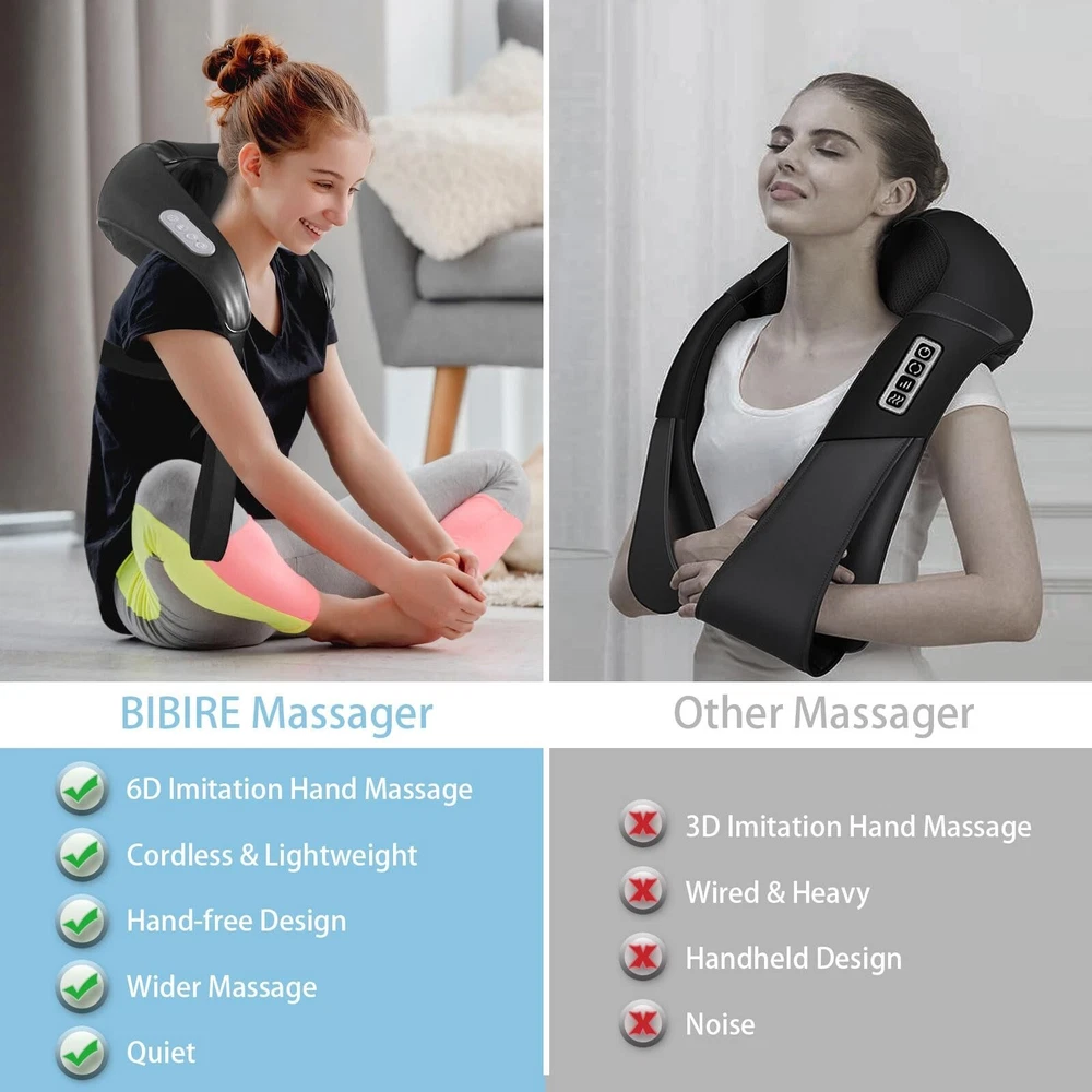 Neck and Shoulder Deep Tissue Massager, Cordless Deep Kneading Massagers with 6 Massage Nodes, Shiatsu Neck Back Shoulder Massager with Heat for Traps, Back & Leg, Gifts for Men Women, Home Use Product Details Power Source: Battery Powered Material: Leather Item Weight: 1.5 Kilograms Brand: BIBIRE Color: Black Product Dimensions : 10.23 x 6.3 x 6.9 inches; 3.31 Pounds Item model number : KT2 Batteries : 1 Lithium Polymer batteries required. (included) Date First Available : April 23, 2024 Manufacturer : BIBIRE Country of Origin : China Innovative 4D Deep KneadingIntroducing an upgraded neck and shoulder massager with 4D kneading technology, simulating deep human-like massages. It covers a wider massage area, extending from the neck to the trapezius and shoulders. Engineered with 6 ergonomic massage nodes, it providing continuous and powerful massage pressure to provide your neck and shoulder with the comfort it deserves. Adjustable Gentle HeatingEnjoy a soothing experience with the BIBIRE Neck Massager's adjustable heating function offering two settings (104F/120F) to gently warm the neck and shoulders, promoting relaxation. Auto-shutdown after 10 minutes ensures safety during use, preventing overheating. Hand-free DesignDesigned for flexibility, this neck and back massager can be handheld or back packed with the strap for various usage scenarios. Compact and portable, it easily fits into standard travel, office, home, or carry-on bags. Cordless Massager - Type-CThis cordless neck massager operates without the need for a power plug. A single charge provides 70-80 minutes of continuous relaxation massage, freeing you from the constraints of cords. Ideal GiftThe neck and back massager chair makes for an excellent gift for parents, friends, family, or elders on holidays, birthdays, Christmas, anniversaries, Father's Day, or Mother's Day. Give the gift of comfort and relaxation anytime, anywhere.