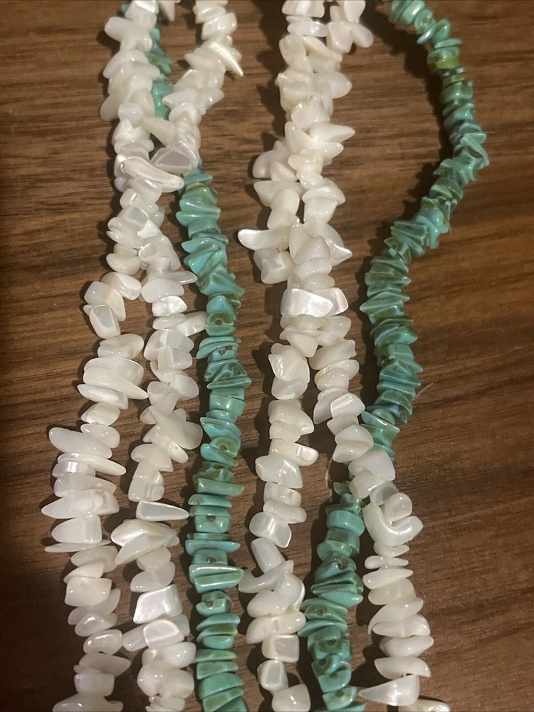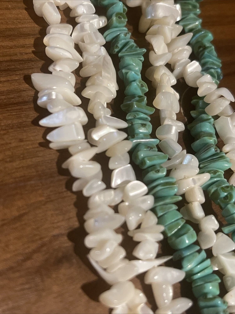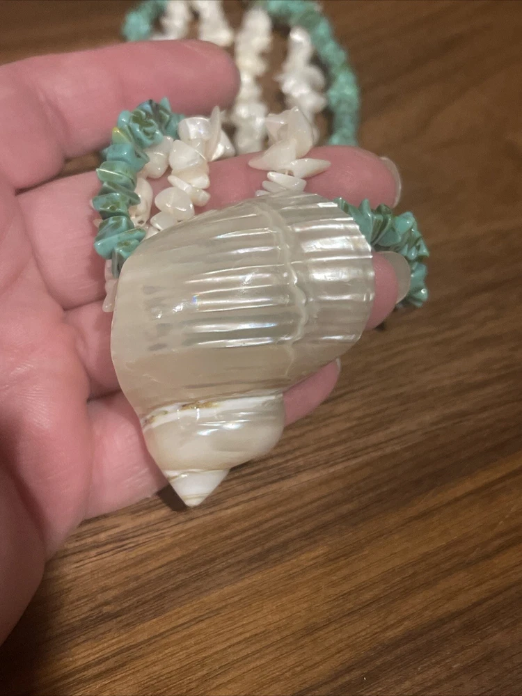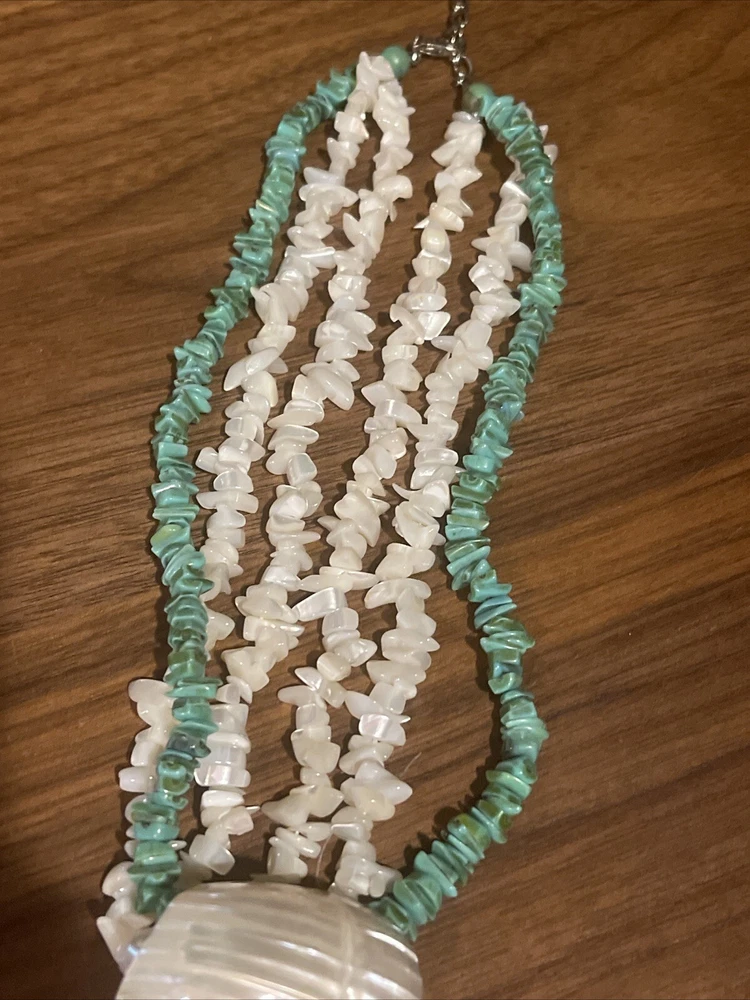 This vintage necklace is a stunning piece of jewelry that features a beautiful white mother of pearl shell and tumbled puka shells. The necklace is 18 inches long and has a large shell pendant with white and blue beaded style that adds to its overall elegance. The shell material gives the necklace a unique and organic feel that is sure to catch the eye of anyone who sees it. This necklace is perfect for those who appreciate vintage and antique jewelry and want to add a touch of nature to their style. I don’t believe the blue is turquoise.
