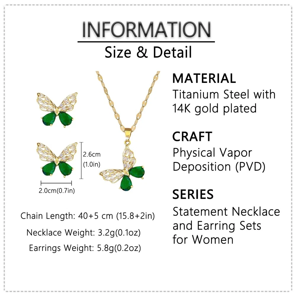 Necklace and Earring Sets for Women 14K Gold Plated Dainty Pearl Geometric Heart Rose Flower Rhinestone Charms Choker Earrings Statement Bridal Wedding Jewelry Set Product Details Color: Green Wing Butterfly Brand: YURAOER MPN: Does not apply UPC: Does not apply EAN: Does not apply Product Dimensions : 1.97 x 1.97 x 0.39 inches; 1.06 ounces Department : womens Date First Available : June 6, 2024 Manufacturer : YURAOER JEWELRY Brand, Seller, or Collection Name: YURAOER Material: Titanium Stainless Steel Gem Type: Rhinestone Setting: Pave Setting Item Length: 1.97 inches Chain: Curb Clasp: Lobster Clasp Number of stones: 4 Metal: Titanium Steel Metal stamp: No Stamp Metal Weight: 5 g Stone shape: Heart Minimum color: Clear/Colorless Exquisite Necklace and Earring Jewelry Set Elevate your style with this exquisite necklace and earring set, a perfect blend of elegance and charm. Crafted with 14K gold plating, these dainty yet eye-catching pieces feature a stunning array of designs, from delicate pearls and geometric hearts to intricate rose flowers and sparkling rhinestones. The choker necklace adds a touch of whimsy with its bowknot charm, while the statement earrings command attention with their bold and beautiful presence. Whether you're dressing up for a special occasion or simply want to add a touch of glamour to your everyday look, this set is sure to become a treasured addition to your jewelry collection. Suitable for women alike, it makes an ideal gift for weddings, bridal parties, or any celebration of love and style. About our Warranty Service We always spare no efforts to develop high-quality and stylish jewels and offer best services. We guarantee 90 days money back for any reason if you don't satisfied with this items.