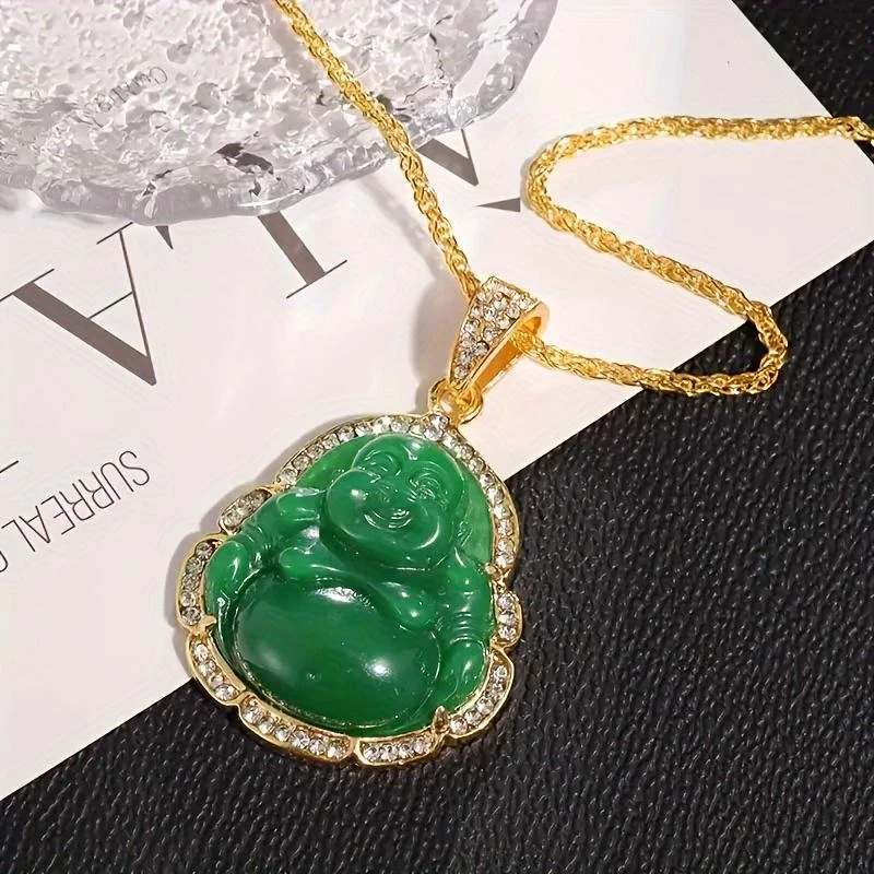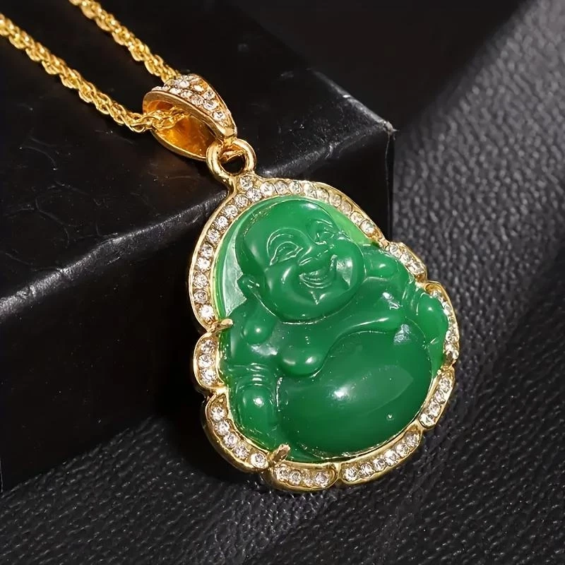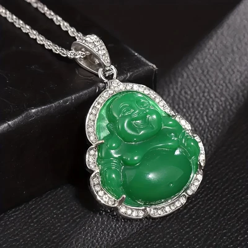 Story of amulet Elevate your style with this exquisite jade Maitreya Buddha pendant necklace, a fashionable piece that combines spiritual symbolism with chic design. The pendant showcases a meticulously crafted halo setting, featuring a round, green-hued jade stone that radiates a serene presence. Silver-plated accents provide a subtle gleam, complementing the necklace's tranquil aesthetic. Designed as an amulet for women, this necklace encapsulates both fortune and fashion. Its unique blend of elements makes it an ideal accessory for those who appreciate a touch of serenity in their ensemble, whether it's for daily wear or special occasions. Fashionable and high quality A great gift for yourself and someone special Suitable for wedding or party A great accessory for your daily life or some special occasions Package: 1 × Necklace