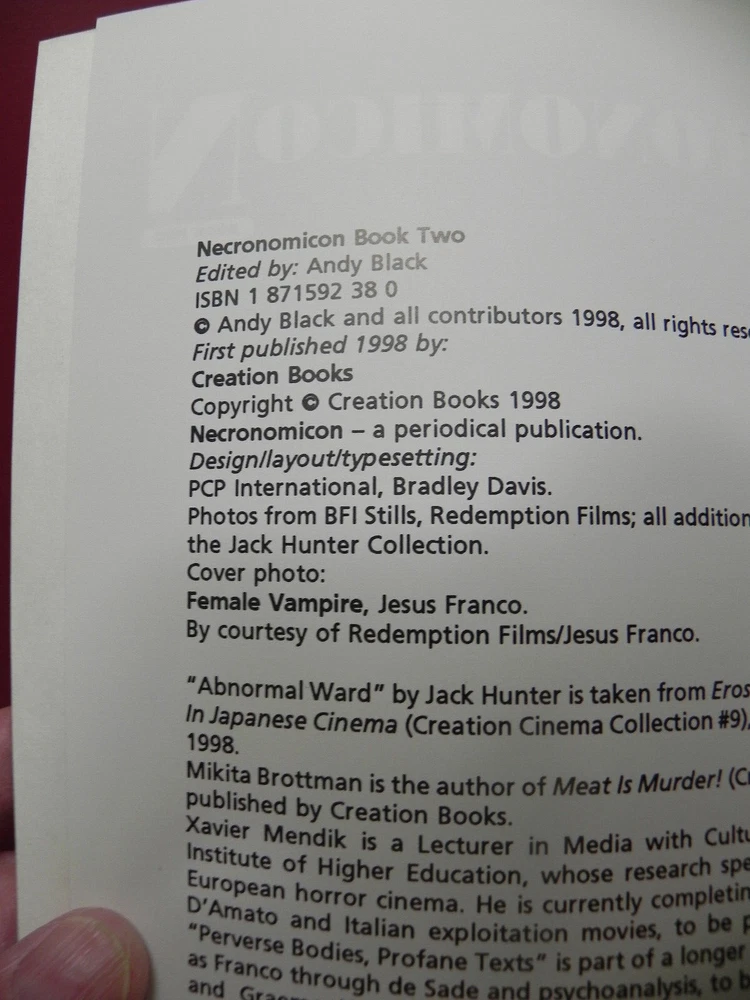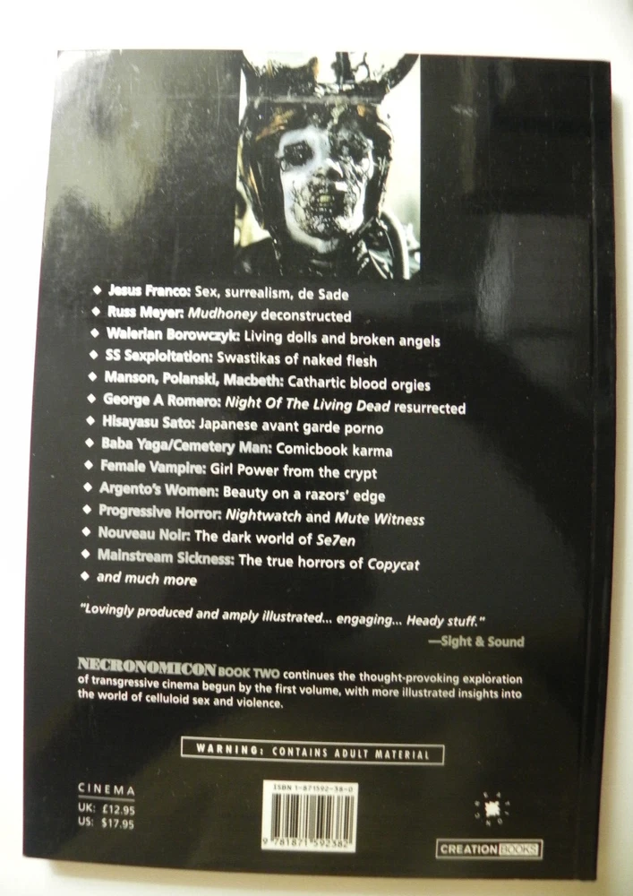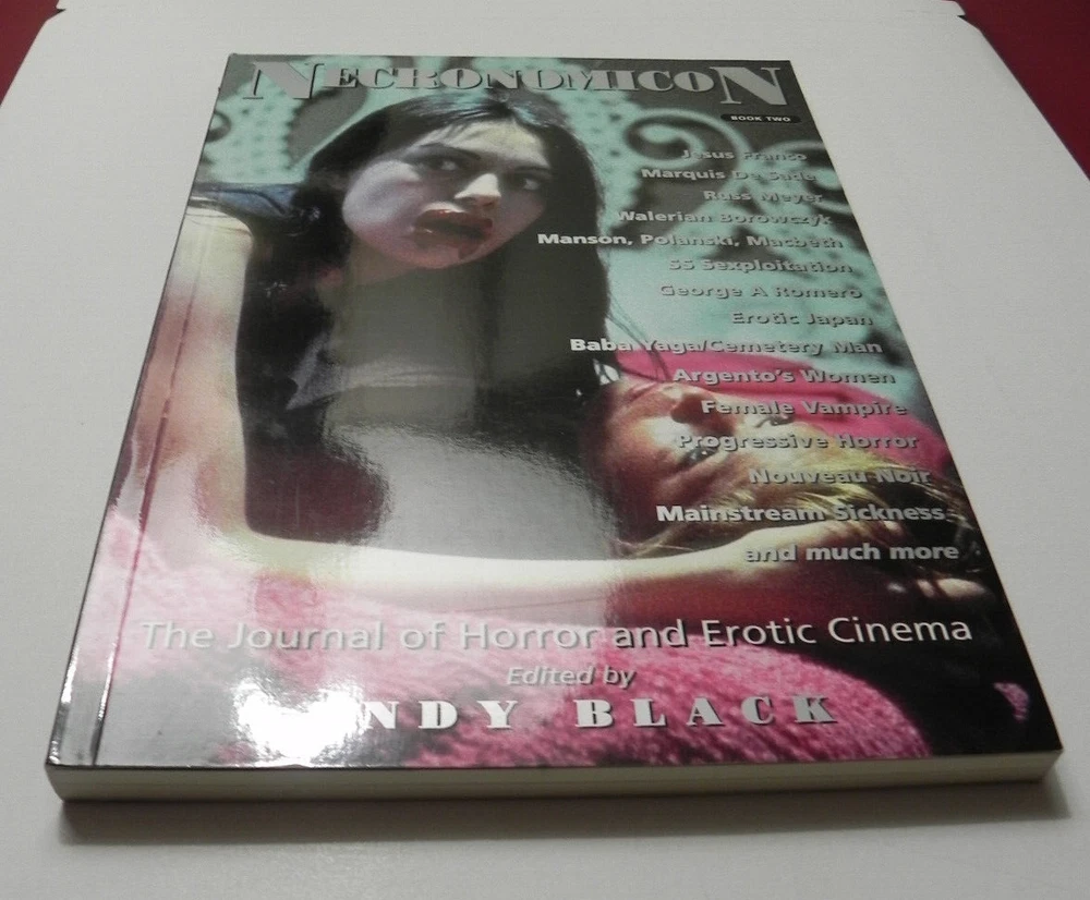 Necronomicon Book Two ~The Journal of Horror and Erotic Cinema ~1998 Andy Black Excellent condition - please see photos. Necronomicon: Book Two continues the thought-provoking exploration of transgressive cinema begun by the first volume, with more illustrated insights into the world of celluloid sex and violence. Includes: Jesus Franco: Sex, surrealism, de Sade Russ Meyer: Mudhoney deconstructed Walerian Borowczyk: Living dolls and broken angels SS Sexploitation: Swastikas of naked flesh Manson, Polanski, Macbeth: Cathartic blood orgies George A Romero: Night of the Living Dead resurrected Hisayasu Sato: Japanese avant garde porno Baba Yaga/Cemetery Man: Comicbook karma Female Vampire: Girl Power from the crypt Argento's Women: Beauty on a razors' edge Progressive Horror: Nightwatch and Mute Witness Nouveau Noir: The dark world of Se7en Mainstream Sickness: The true horrors of Copycat And much more....