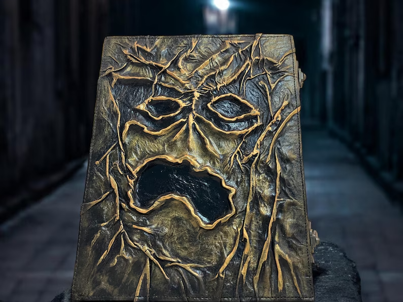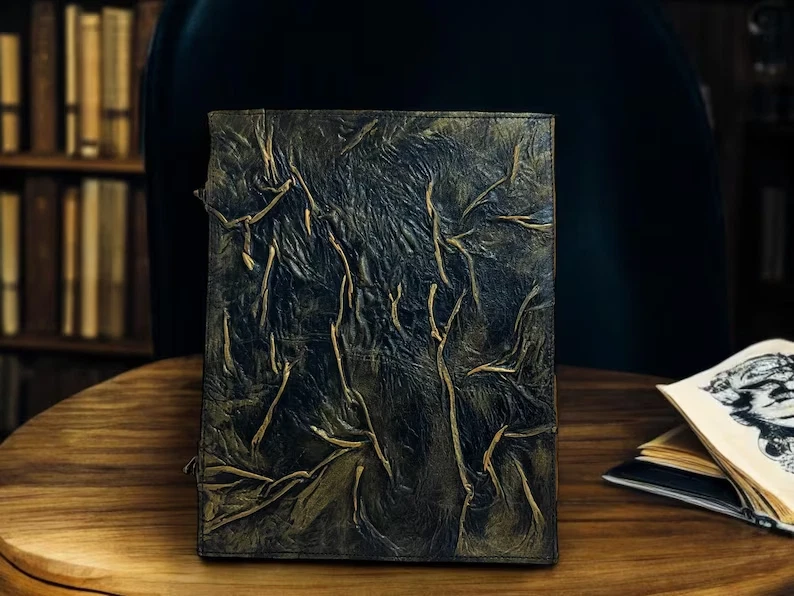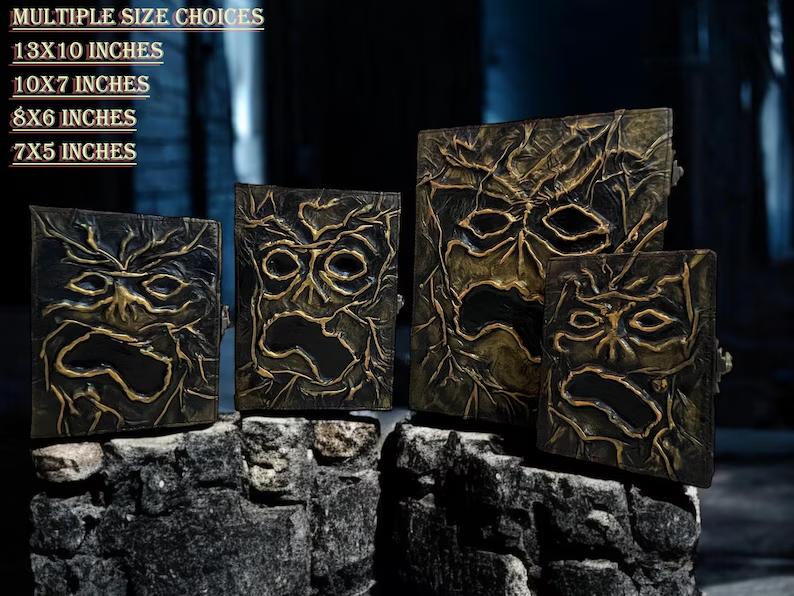 Necronomicon Dead Evil Book – The Dark & Horror Movie Prop Decor Notebook Unlock the ancient terror with this Necronomicon Dead Evil Book , a spine-chilling replica inspired by the cult classic Evil Dead horror franchise. Crafted for fans of the macabre and collectors of the supernatural, this notebook doubles as a nightmarish piece of decor and a functional journal for your darkest thoughts, sketches, or arcane rituals. Authentic Horror Look – Featuring a grotesque face molded into the cover and aged pages that give it an ancient, cursed appearance straight out of the movie. Functional Notebook – Not just for show—this prop opens to reveal blank or themed pages, perfect for journaling, sketching, or scripting your next horror story. Creepy Decor Accent – Makes a standout centerpiece for Halloween displays, haunted houses, horror-themed rooms, or as a conversation starter in your collection. Movie-Inspired Design – Faithfully designed to mirror the infamous "Book of the Dead" from Evil Dead , it’s ideal for cosplay, fan tribute displays, or film props. Whether you're summoning ancient evils or just scribbling down your grocery list with a touch of the macabre, this Necronomicon notebook brings a sinister flair to the everyday. A Hardcover Leather Journal is a premium, durable notebook designed for those who appreciate both style and functionality. It features a sturdy leather cover that provides a luxurious feel while ensuring longevity. The leather surface often has a smooth, textured finish, with some journals showcasing natural imperfections, giving each one a unique character. Inside, the journal typically contains high-quality, acid-free paper that’s perfect for writing, sketching, or journaling. These journals often come with features like: Elastic Band : To keep the journal securely closed when not in use. Bookmark Ribbon : To easily mark your place for quick access. Pen Holder : To carry your favorite pen along with the journal. Vintage or Modern Design : Depending on the style, it can either have an antique, rustic look or a more sleek, modern design. Personalization Options : Many leather journals offer customization options, such as embossing names or initials for a more personal touch. A Hardcover Leather Journal is often seen as the perfect companion for writers, travelers, or anyone who values keeping thoughts, sketches, and ideas in a beautiful, durable format. It also makes an excellent gift due to its timeless appeal.