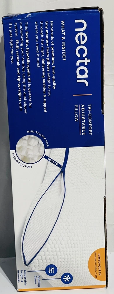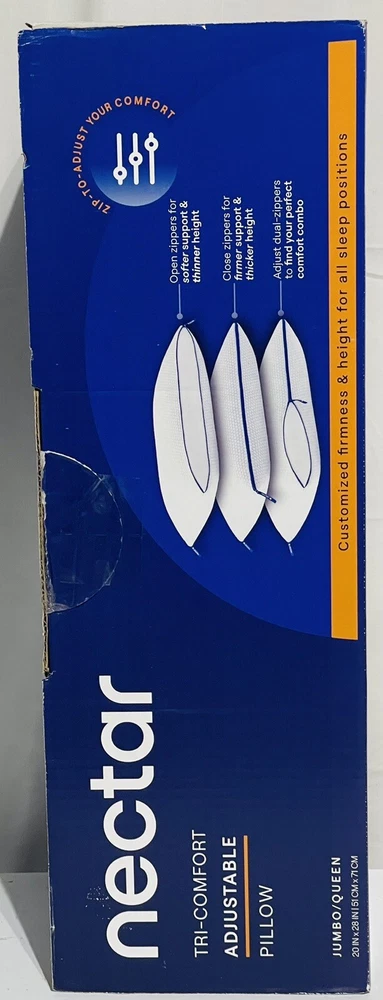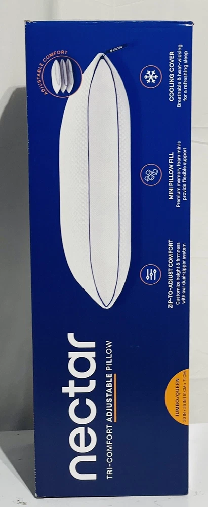 Nectar Tri-Comfort Adjustable Pillow, Cooling, Memory Foam, Jumbo/Queen,. NEW -OPEN BOX - CUSTOMER RETURN/UNSOLD INVENTORY FROM COSTCO - FREE SHIPPING Elevate your bedroom experience with the Nectar Tri-Comfort Adjustable Pillow. Crafted with premium memory foam "micro pillows" and microfiber blend, this jumbo/queen sized pillow provides hypoallergenic comfort and cooling. The adjustable height and firmness options make it suitable for all sleep positions and the soft-medium-firm support ensures a luxurious feel. The traditional style and geometric pattern of this foam pillow make it a perfect fit for any bedroom decor. It is machine washable and comes with a zip closure for easy removal. This Nectar Sleep product is ideal for teens, adults, unisex baby & toddler, and kids who deserve a comfortable and stylish sleep experience.