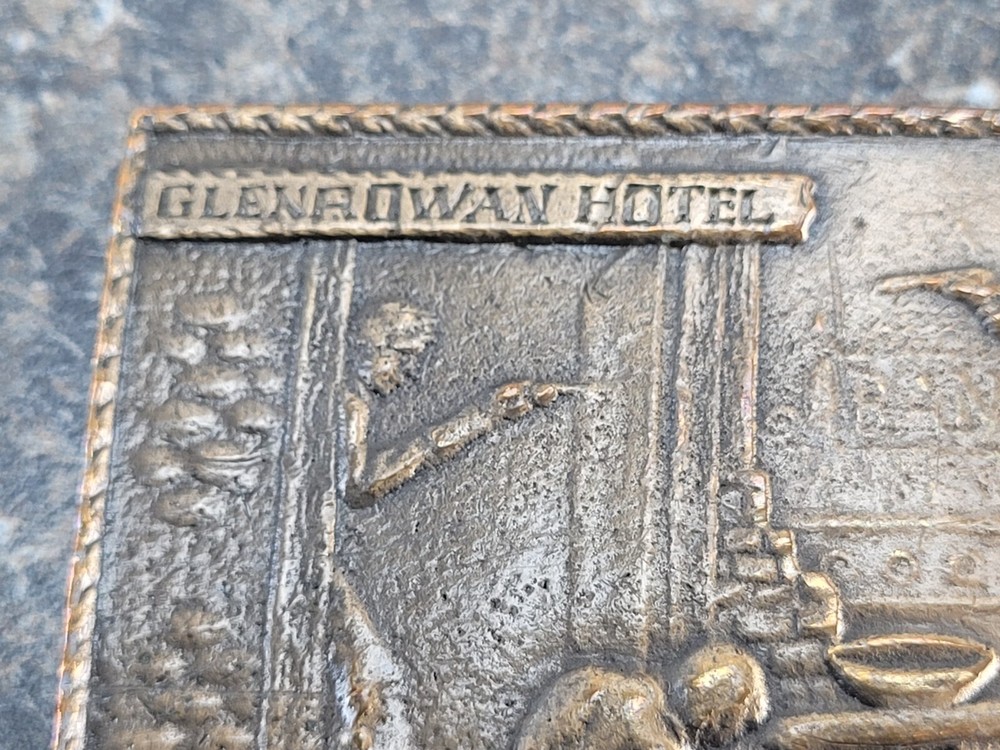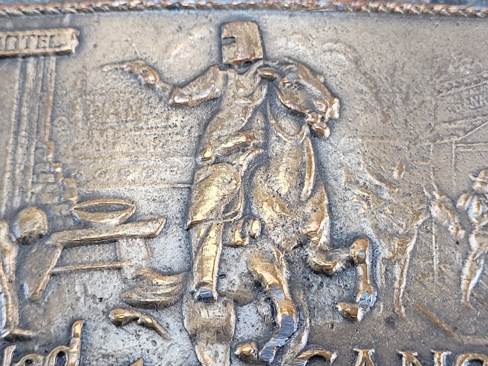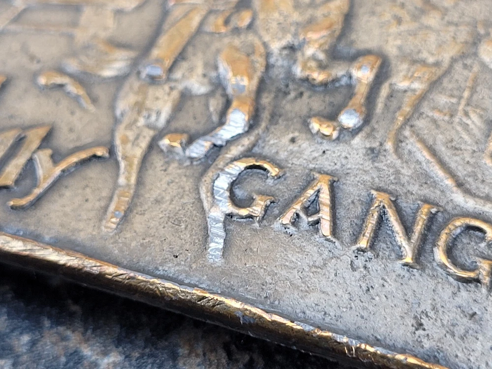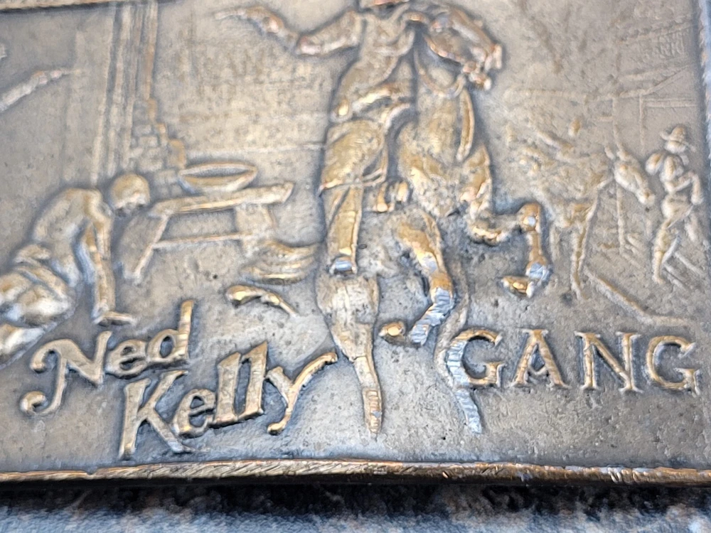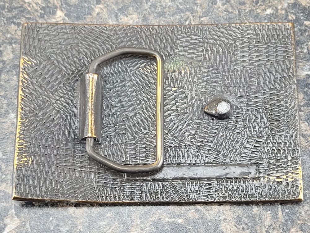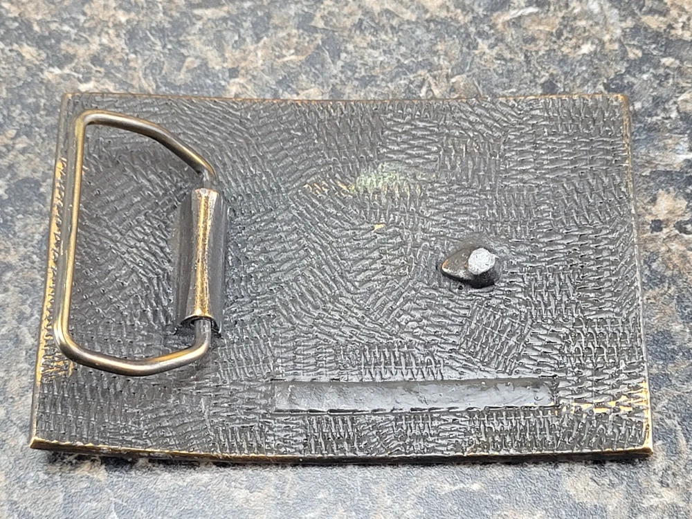 This belt buckle is approximately 9.5 cm x 6.5 cm. The hook on the back of the buckle is damaged/broken and missing.