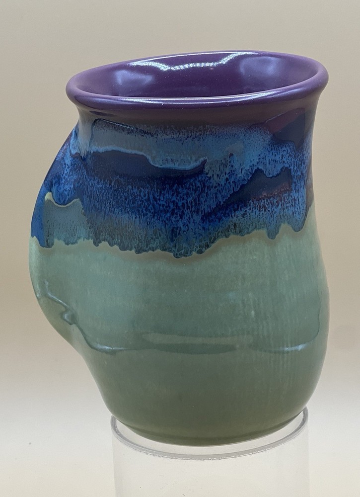 The Neher Hand Warmer Clay In Motion Right Handed Ceramic Coffee Mug 2009 Signed is a unique and handmade coffee mug crafted from clay and ceramic, featuring a round shape with a capacity of 14oz. This mid-century modern mug is suitable for hot beverages and showcases a glossy finish with a multicolor pattern. Made in North Carolina in 2007, this original piece of art pottery bears the signature of the artist, making it a special addition to any collection of decorative cookware or dinnerware. Hand wash only to preserve its beauty for years to come.