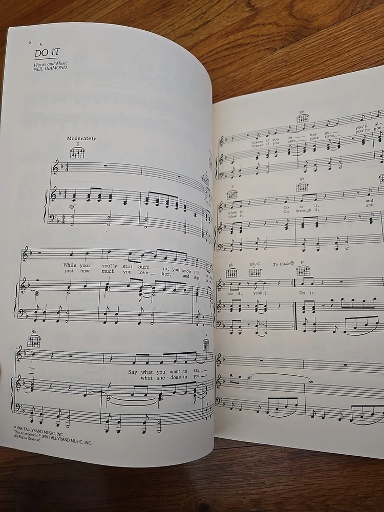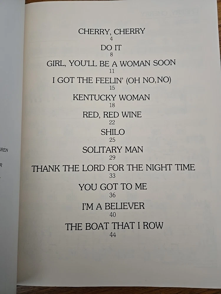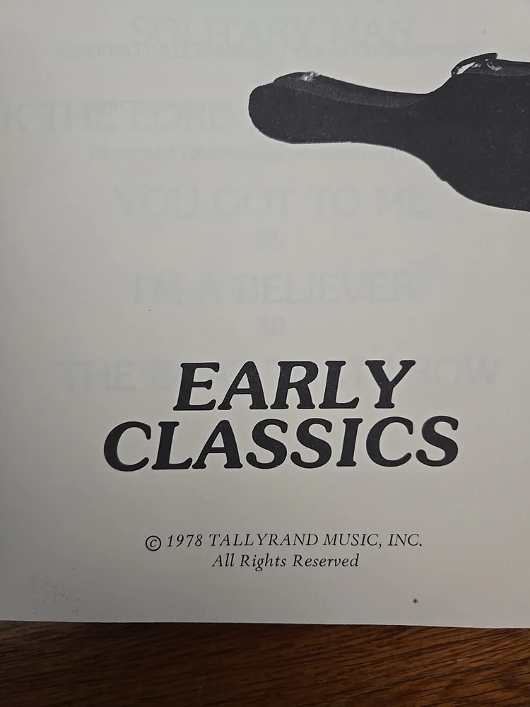 The product is a 1978 songbook featuring early classics by Neil Diamond, including piano, vocal, and guitar chords. It is published by Tallyrand Music Inc. The songs in the book are in the genres of pop, rock, and easy listening, and are intended to be played on acoustic or classical guitar.