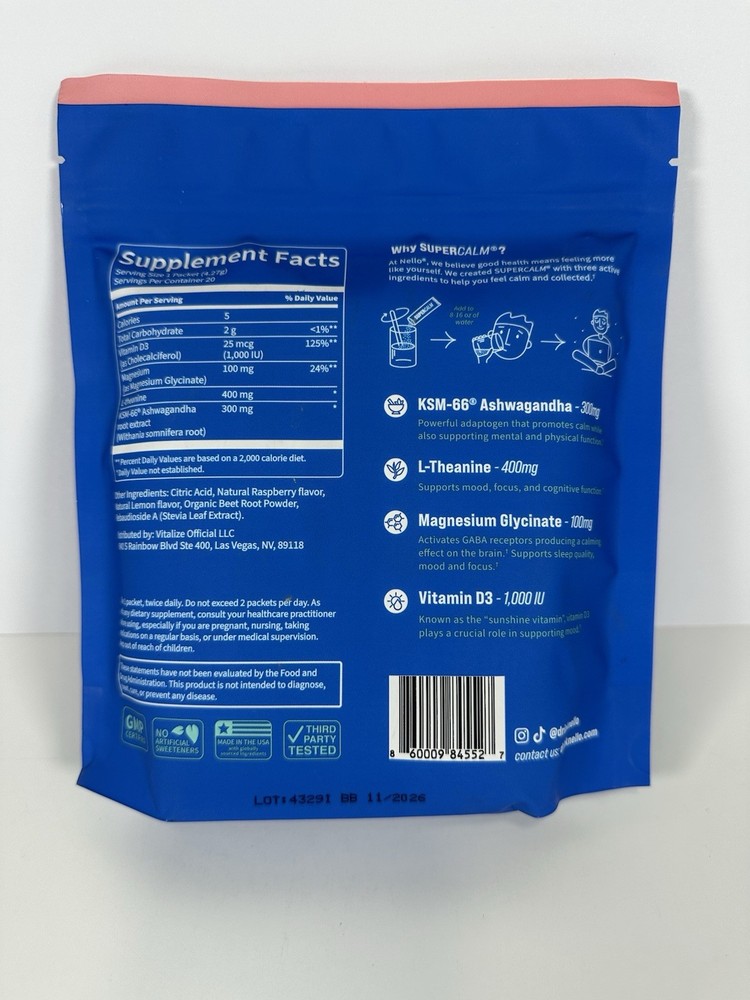 Nello Supercalm Calming Drink Mix - Raspberry Lemonade- 20ct Exp. 11/26 New.