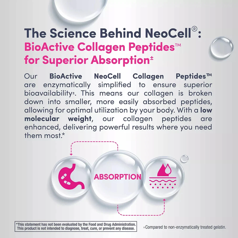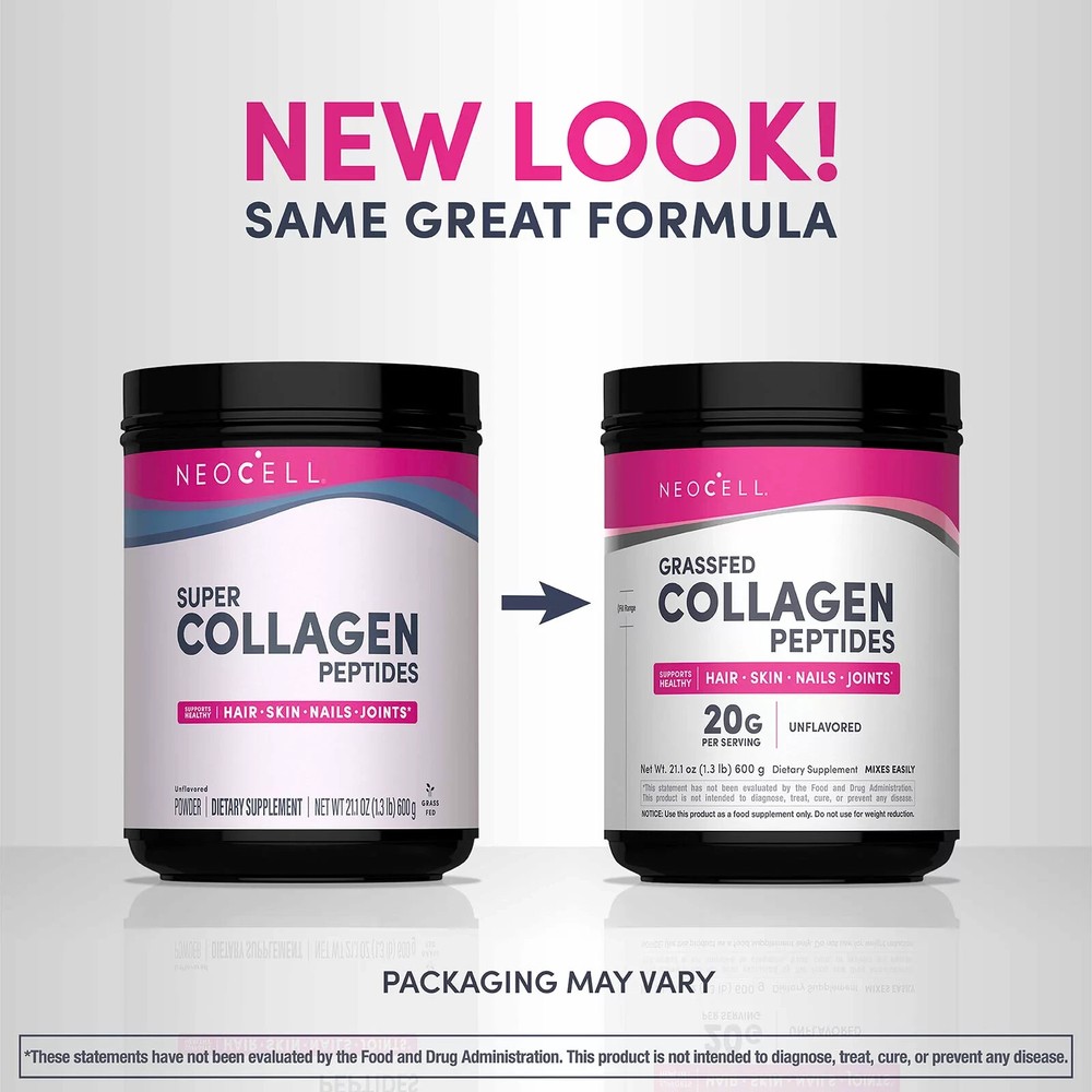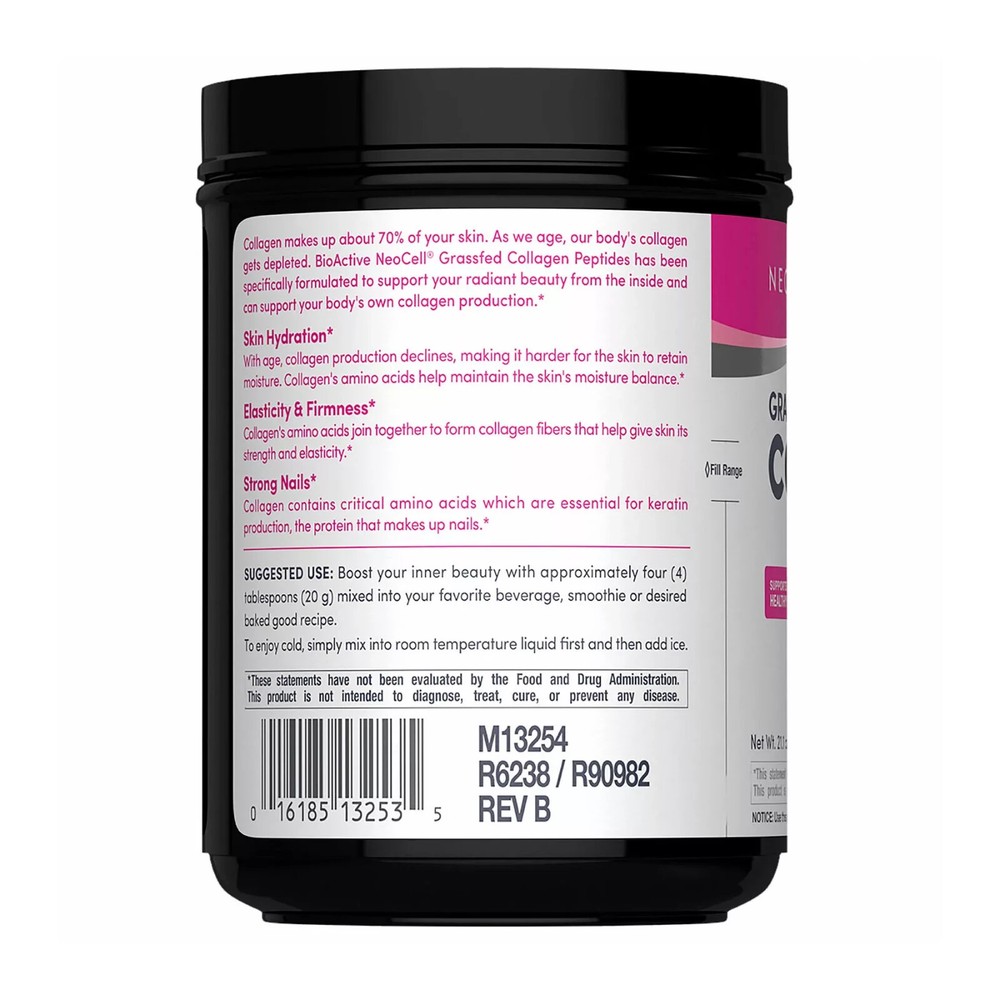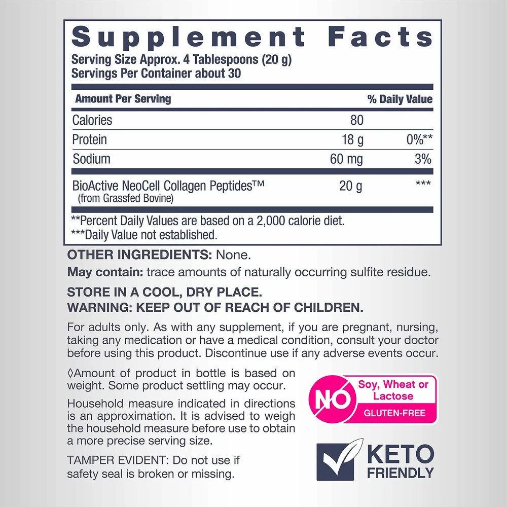 Support Beauty From Within*: Unleash your inner glow with NeoCell Grassfed Collagen Peptides Powder. Collagen production naturally declines with age. This unflavored powder is packed with Collagen derived from premium bovine sources. Simply mix this unflavored powder with your favorite beverage or food to support healthy hair, skin, nails, and joints.* BioActive NeoCell Collagen Peptides: Each serving of this Collagen Powder delivers 20 grams of BioActive NeoCell Collagen Peptides featuring Collagen Types 1 and 3 from grassfed bovine sources. This grassfed bovine collagen ensures a more sustainable and ethical approach and is widely recognized as a premium quality source. Wellness From the Inside Out*: NeoCell has been a trusted leader in unlocking the transformative benefits of collagen and essential nutrients for nearly 30 years. Trusted by millions, their science-backed products are designed to illuminate your inner beauty in a way that stands the test of time.* *These statements have not been evaluated by the Food and Drug Administration. This product is not intended to diagnose, treat, cure, or prevent any disease. Product Features: 20 grams of BioActive NeoCell Collagen Peptides per serving Sourced from premium grassfed bovine Supports healthy hair, skin, nails, and joints* Supports beauty from within* Unflavored powder mixes easily into food, beverage, or smoothie Keto friendly, non-GMO, gluten free, soy free, wheat free, lactose free Includes collagen peptides, 21.1 oz. Ingredients: Types 1 & 3 Hydrolyzed Bovine Collagen (20 Grams). May Contain: Trace Amounts Of Naturally Occurring Sulfite Residue. Product Warnings and Restrictions: Keep Out Of Reach Of Children. For Adults Only. As With Any Supplement, If You Are Pregnant, Nursing, Taking Any Medication Or Have A Medical Condition, Consult Your Doctor Before Using This Product. Discontinue Use If Any Adverse Events Occur. Tamper Evident: Do Not Use If Safety Seal Is Broken Or Missing. Store In A Cool, Dry Place.