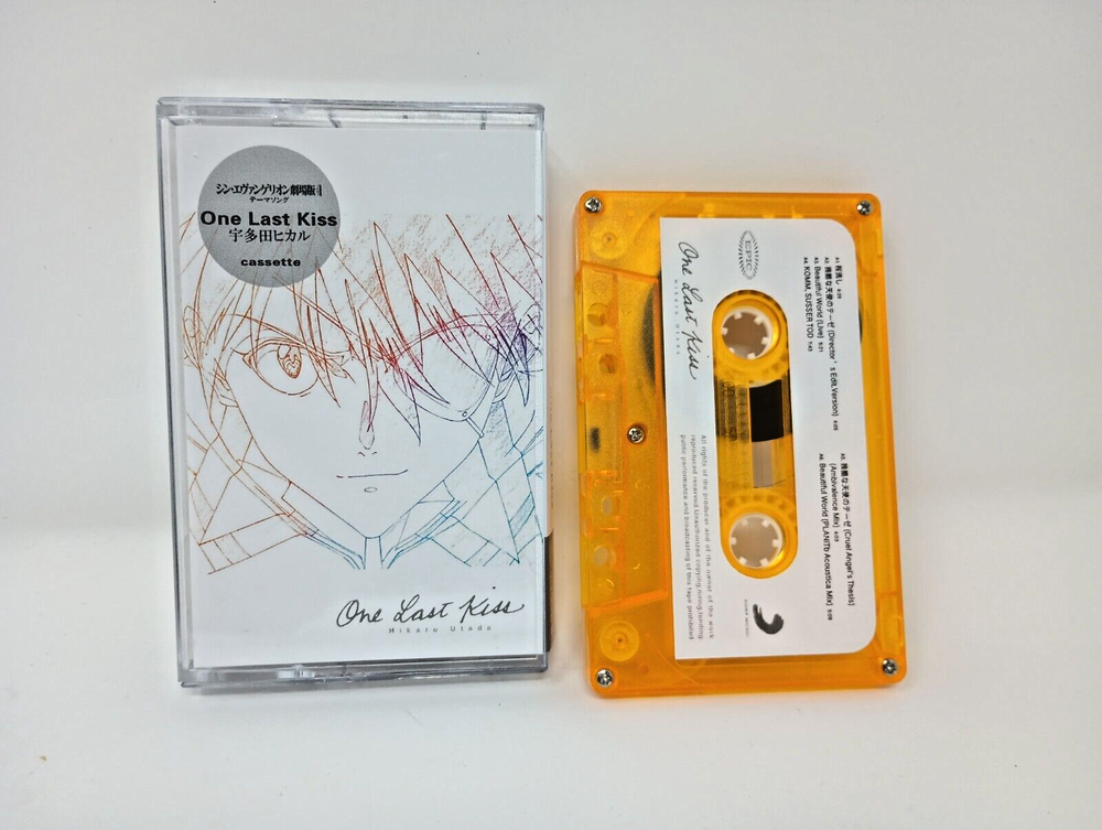The Cassette Tape - "One Last Kiss" features the artist Utada Hikaru's soundtrack for Neon Genesis Evangelion on an orange cassette format. The cassette contains music from the animation score/soundtrack genre, specifically from the anime series Neon Genesis Evangelion. Fans of the series and collectors of physical music formats will appreciate this unique cassette tape release of the soundtrack.