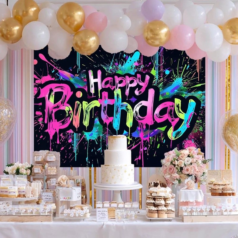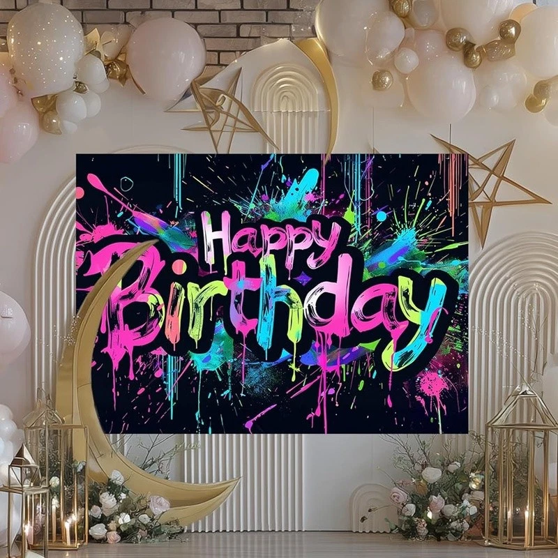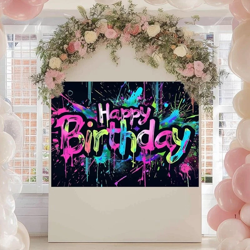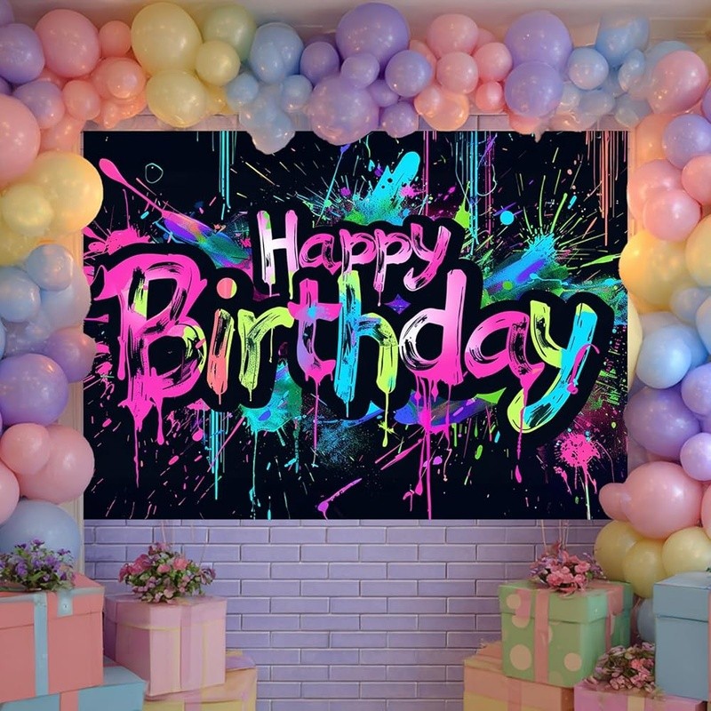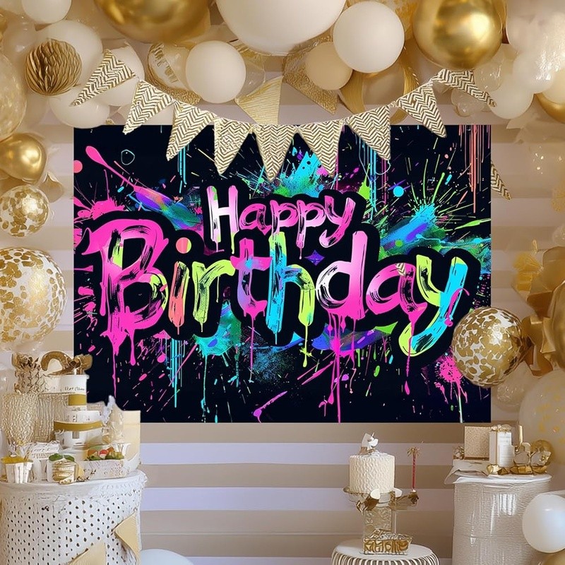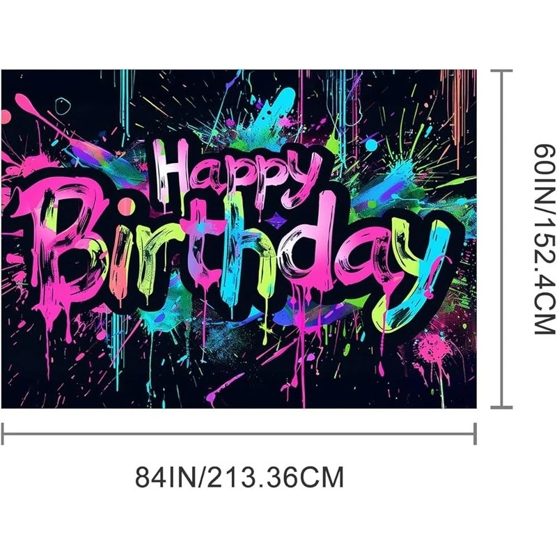 About this item Energetic Neon Style: This neon happy birthday banner features colorful splatter strokes and brush-painted text that bring a fun, graffiti party decorations flair to your event backdrop. Bright and Eye-Catching: Designed to match glow birthday party decorations, it makes your celebration space pop with attitude—perfect for teens, adults, or anyone who loves bold visuals. Urban Splash Theme: Whether you're aiming for a street-style celebration or something modern and edgy, this neon happy birthday banner enhances neon birthday decorations and transforms party walls with creative detail. Easy Setup, Versatile Use: Made of polyester, this 84x60 inch piece fits seamlessly into neon party backdrop arrangements for home, school, or event hall birthday displays. Bold Statement for Photos: From cake tables to selfie walls, it complements neon birthday party decorations and backdrop birthday zones while coordinating with neon birthday banner themes effortlessly. Color: Neon Happy Birthday Banner Brand: Product Dimensions: 84"L x 84"W Target Audience: Kids Pattern: Splatter/Graffiti Number of Sets: 1 Mounting Type: Wall Mount Shape: Rectangular Banner Type: Standard Banner