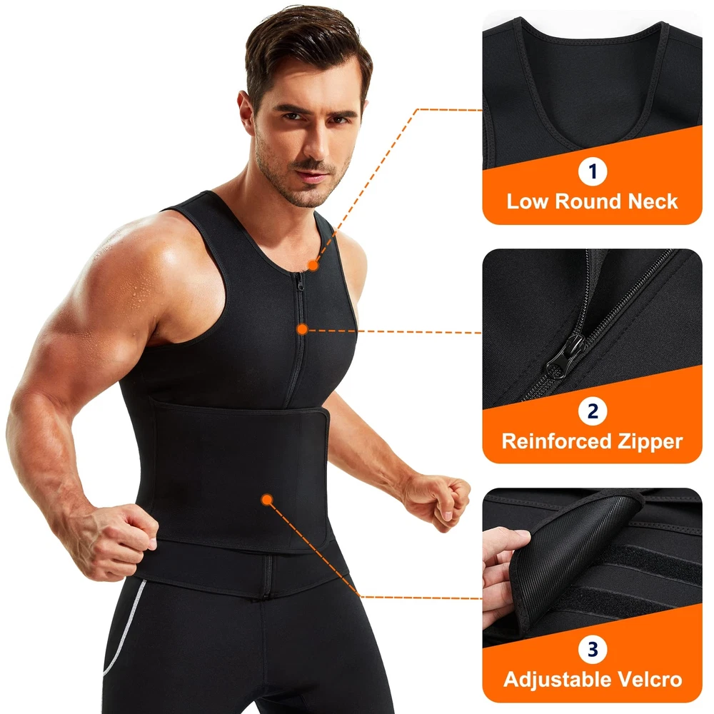 Neoprene Sauna Suit for Men Waist Trainer Vest Zipper Body Shaper with Adjustable Velcro Tank Top Material: inner 100% Neoprene; Outer 100% Polyester BENEFITS: 1.Sauna sweat effect in love handles and fat belly,produce heat in workout to accelerate sweating for weight loss. 2.Make you sweat crazy,3 times than normal,also keep your core body warm during cold days. 3.Help enhance the abdominal and spinal support as you workout. 4.Maximizes fat burning for weight loss,comfortable to wear for daily activities. Tips: 1.It's normal for the smell of the new products,please hang it to air dry or wash it before wearing. 2.Hand wash with normal temperature water and soft detergent after worked out and hang it to air dry. 3.Don't machine wash. Don't iron. Don't bleach. READY FOR SAUNA SWEAT. This 2-in-1 waist trainer vest for men is made of neoprene and polyester synthetic materials,breathable and adjustable,flexible enough to move with.Putting this waist trainer for men on before your exercise routine can help you shed an extra amount of water weight and retain body heat to burn more calories.Also this body shaper men sauna sweat workout vest can keep you warm in cold days. EASY TO PUT ON AND OFF. Upgraded neoprene body shaper with zipper is easy to put on and take off.Faja neopreno hombre to help perfectly contour to your body for a comfortable form fit and keep your shoulders straight.A good compression sauna shirts for men. BEST WASIT TRAINER VEST. Burn belly fat neoprene waist trainer for men with waist trainer is a full vest model targets your core abdominal area,plus outer adjustable belt that ups your thermogenic energy and flattern abdomen to help you work up an intense sweat and shed pounds more efficiently. SUITABLE FOR ALL OCCASIONS. The vest’s compression can flatten fat belly and stomach,correct your posture and helps you sweat rapidly for fat burning and tummy control,men waist trainer vest for weightloss hot neoprene corset body shaper can be worn under all kinds of shirts or shaperwear.It's good for running,gym,playing basketball and sauna,highly-effective exercise tool for men of all shapes and sizes. SATISFIED CUSTOMER SERVICE. Our aim is to provide satisfied experience for all customers,please feel free to contact us if any problem about this neoprene slimming shapewear,we will help you promptly.