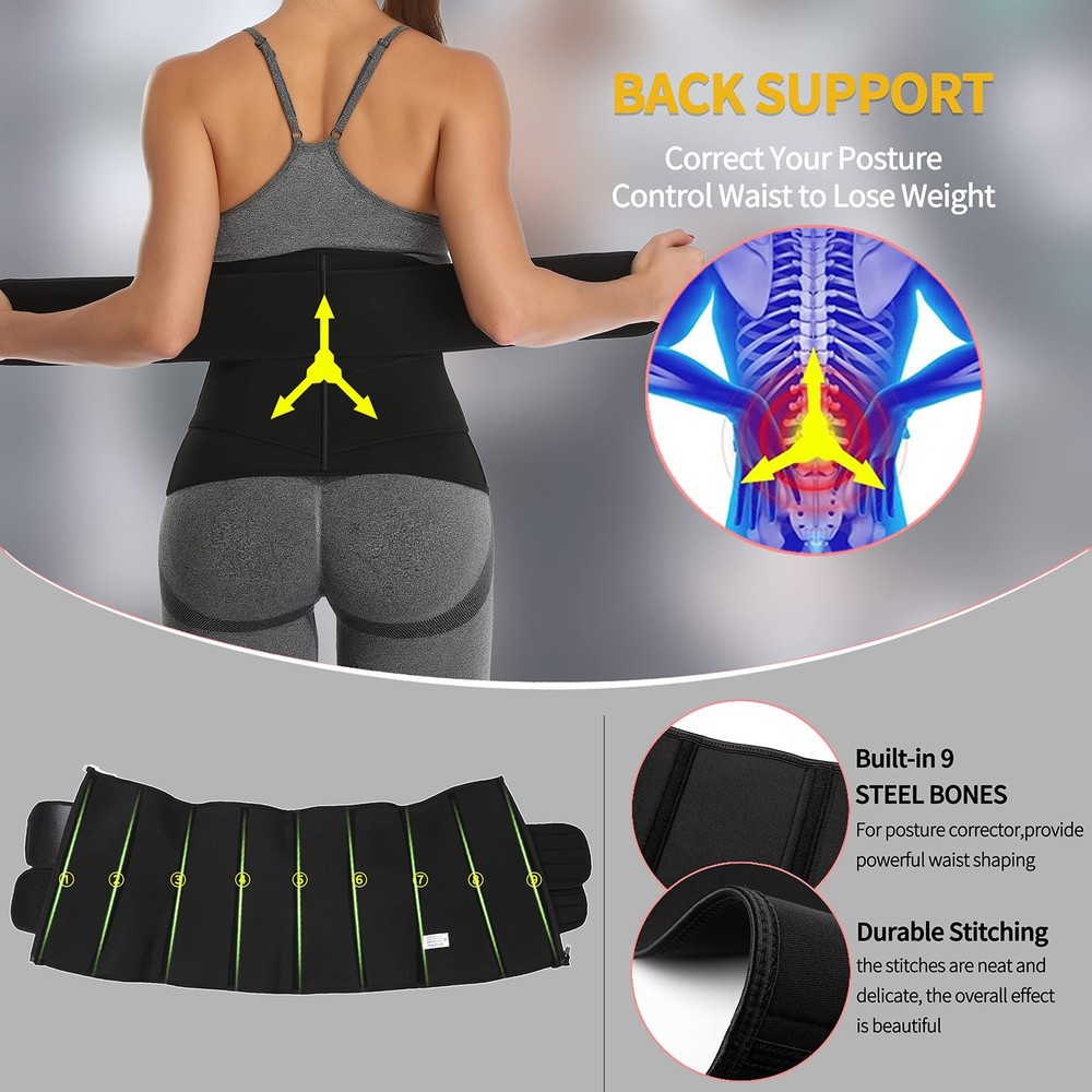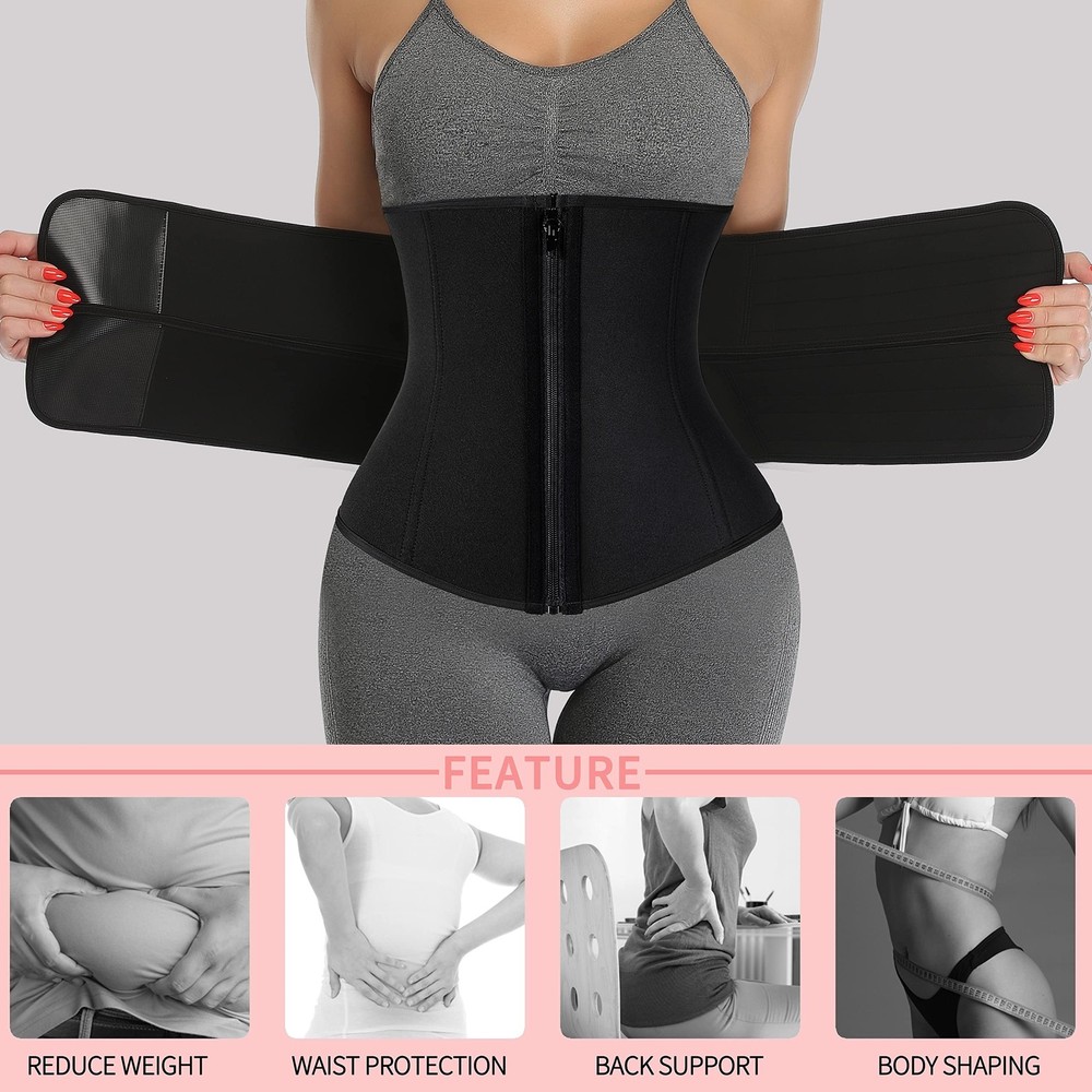 Neoprene Sauna Waist Trainer Corset Sweat Belt for Women Compression Trimmer Workout Fitness Function: -Provides firm control and shaping -Promote body heat activity, improve body shaping -Flexible stays keep the garment comfortably in place -Designed to wear while working out or underneath clothing -Slimmed midsection; improved, more confident posture, relieve back pain -High compression, visibly reduced waistline. Reduce down 1, 2, Even 3 Size SIZING - see Sizing Chart in the listing images above Please kindly check carefully our sizing chart. Due to the different body shapes, possibly a very few trainers will be not fit, then you can tell us and we will change a more suitable vest for you for free. TIPS: 1. Please wash the shaper before wearing it for the first time. When you wear the shapewear for the first time, you may feel tight or Uncomfortable, please don't worry, It will be better after 2 days try; 2.Wash your hands only, do not iron, do not machine wash, do not bleach chlorine, do not dry clean; 3. Please read our size chart carefully. There may be an error of 1-3CM by hand measurement. Please understand~ If you have any questions, we will reply to you within 24 hours. ✅UPGRADE Material - Made of 2.6mm thick quality fabric, Shell: 100% Polyester; Lining: 100% Neoprene, smooth, skin-friendly, close-fitting, more sturdiness, moisture-wicking, keep warm, let you always keep dry and comfortable, can be worn inside and outside. It has a strong thermal energy reaction effect, it gets you a completely different feeling compared to other sweat bands. Besides, sturdy and durable sewing promises the waste trainers' quality and durability. ✅Longer & Wider Sauna Waist Trainer for Women -The abdomen double-layer compression design and 12-inch wide design is wider than generic items, more torso area covered, more calories burned, more sweat comes, makes the abdomen effect more obvious. Built-in 9 STEEL BONES, the support shaping effect is powerful and effective. Give you a perfect waist trainer + sweat belt. Straps + zipper combination design, and sticky adhesive. Easy to adjust the size. ✅2.6mm Thick Thermal Sweat Waist Trainer for Women - When worn during exercise, neoprene waist trainer corset raises body temperature in a short time, quickly to help you get more sweat than usual, speed up the workout procedure. Conjunction with cellulite gel to enhance its sweat potential. Workout Sweat Trainer acts as a thermal stomach wrap in the winter, shapes an hourglass body, and maintains muscle temperature to prevent fatigue and injury during exercise. ✅Great Back Support And Pain Relief - Sauna waist trainer for women plus size, which built-in 9 STEEL BONES, can flatten abdomen and reduce waistline, provide enough support for back pain relief, and correct your posture. Wrap and hide the waist fat, and give you an hourglass figure. It also applies to help the postpartum recovery all process. It is definitely the best fitness helper for all kinds of exercises in the gym, everyday wear, even doing housework. ✅Perfect Sweat Band Waist Trainer for Women: The Neoprene Fitness Belts help increase sweat and flatten the abdomen to reduce waistline, relieve waist pain, enhance back & spinal support, improve posture, expedite the workout procedure. The continuous use combine with a healthy lean diet, exercise and drink plenty of water for extraordinary results. Get your healthy workout journey start together with the double waist trainer for women!