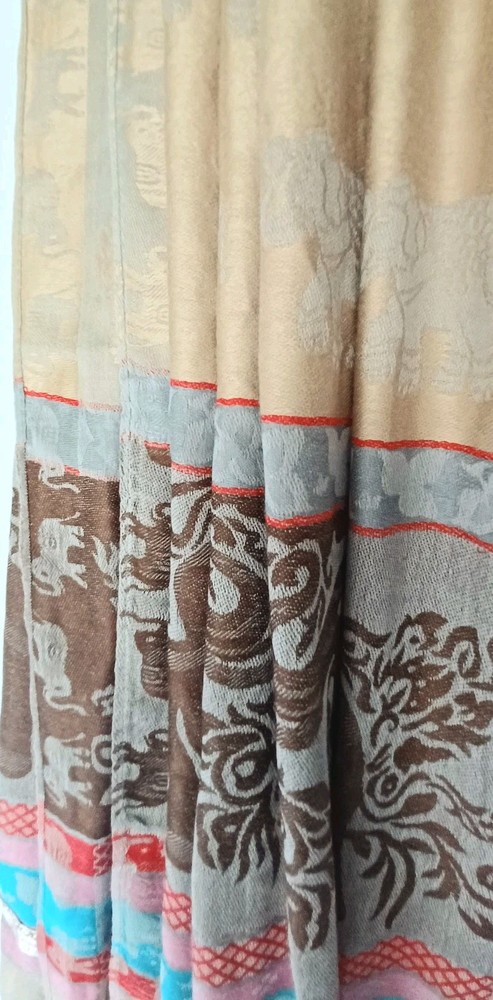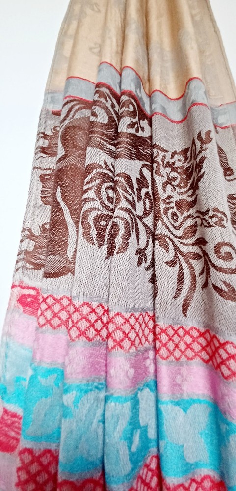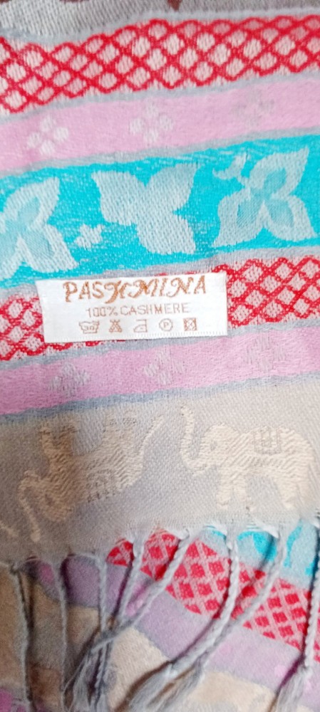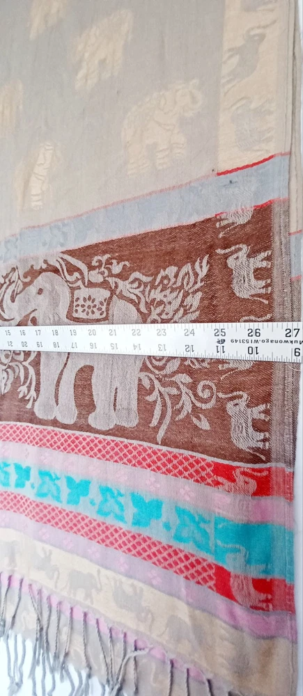 Nepal 100% Pashmina Cashmere Gold Pink Aqua Elephant Print Scarf Shawl 74"X27" length - 74 in width - 27 in hand wash cold only lay flat to dry iron on cool or dry clean